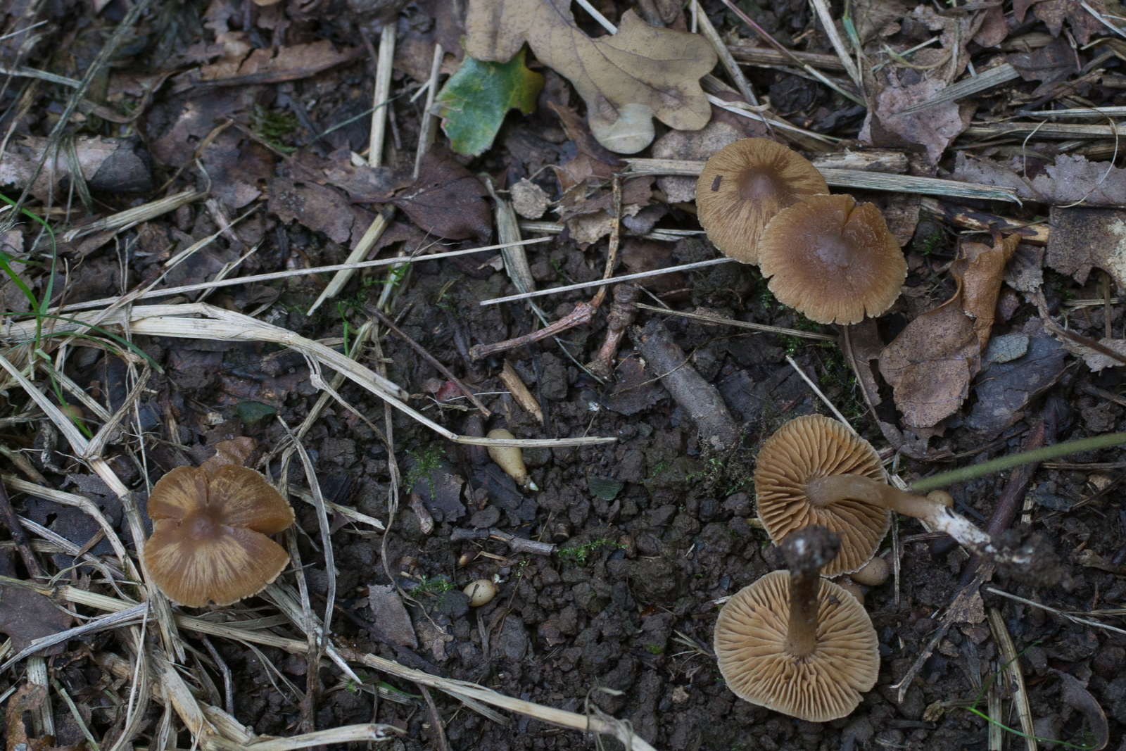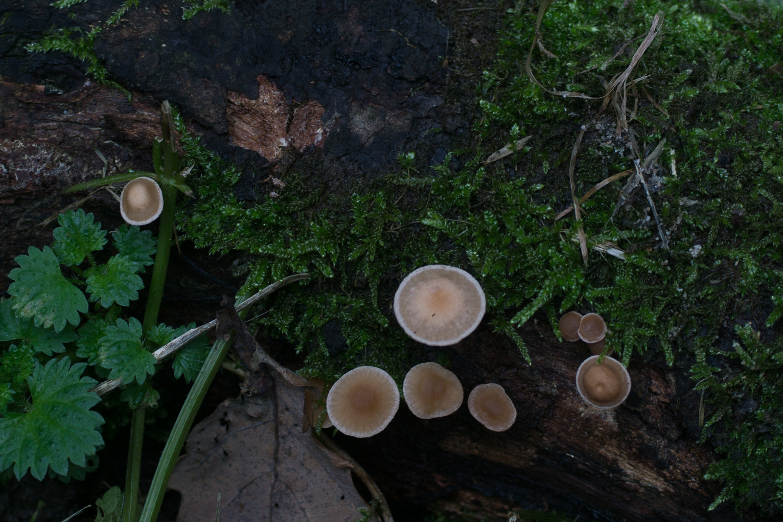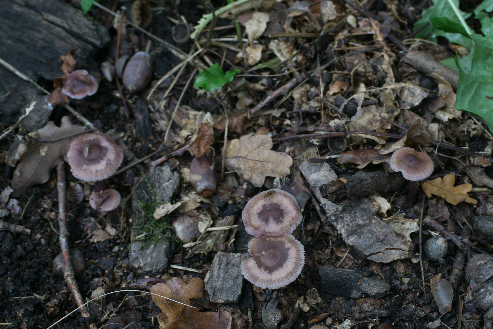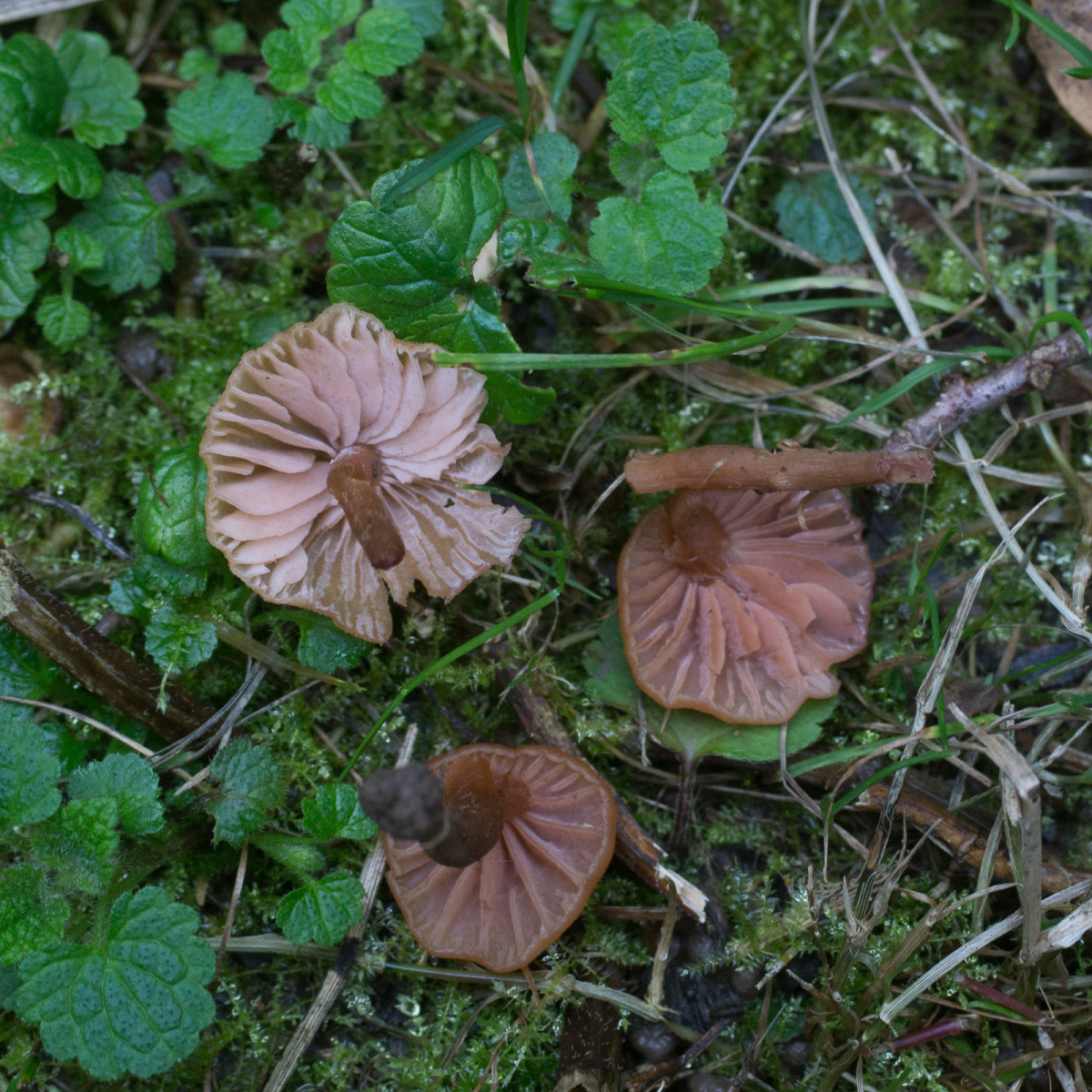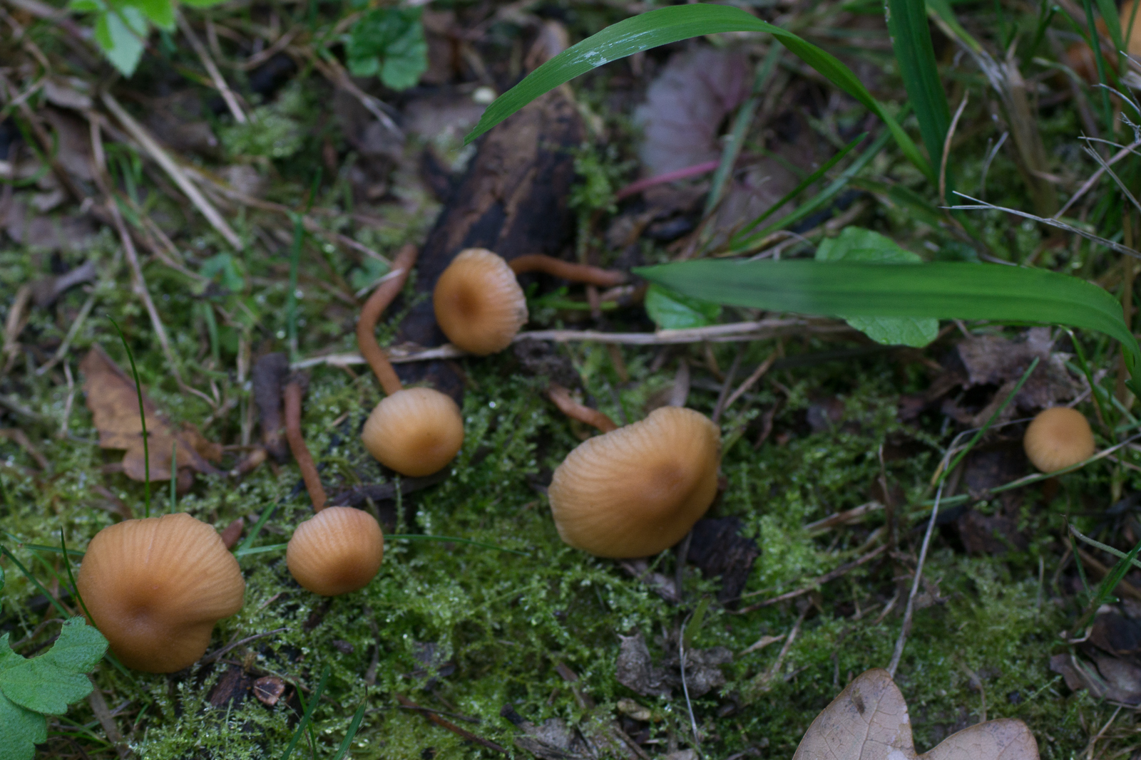 7. Einer der roten Lacktrichterlinge. Stark geriefte Hüte. Ich glaube es könnte Laccaria tortilis sein.