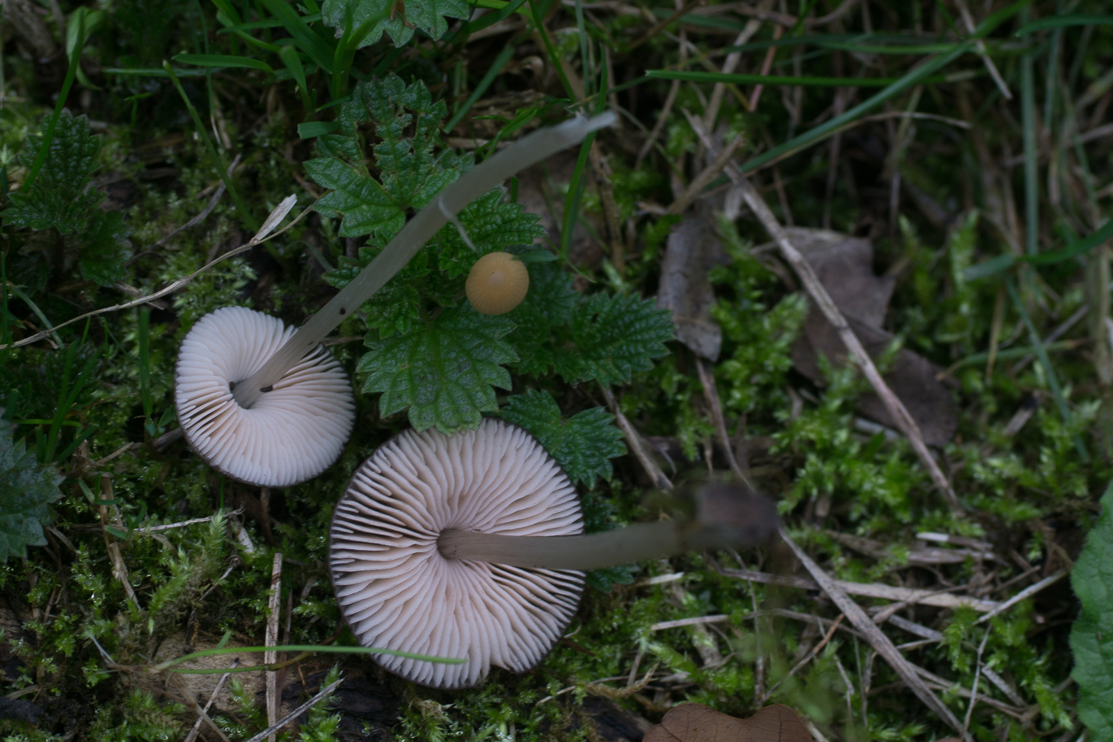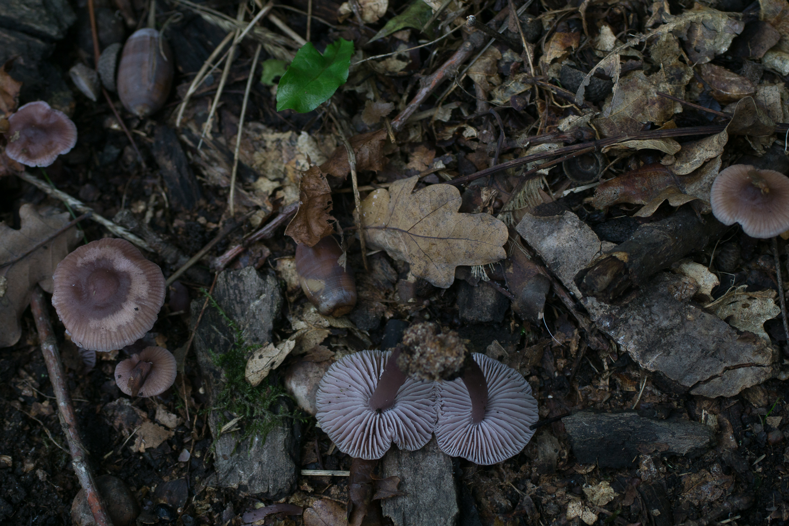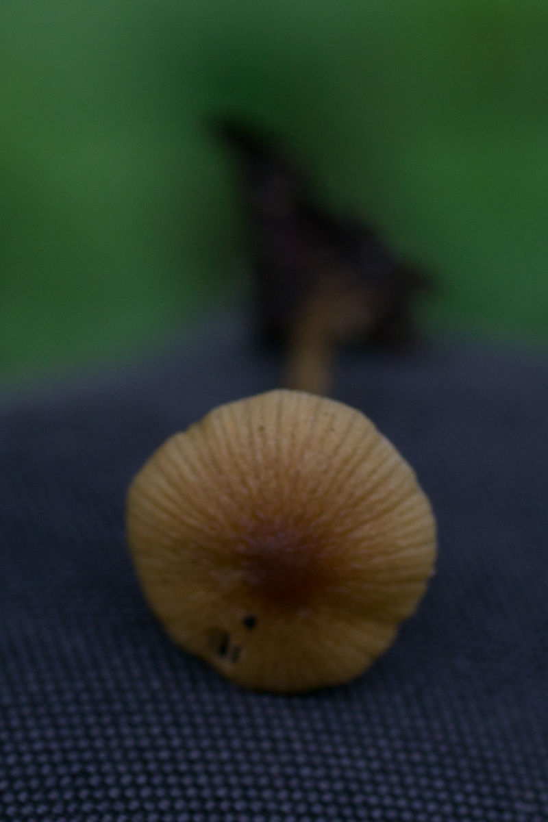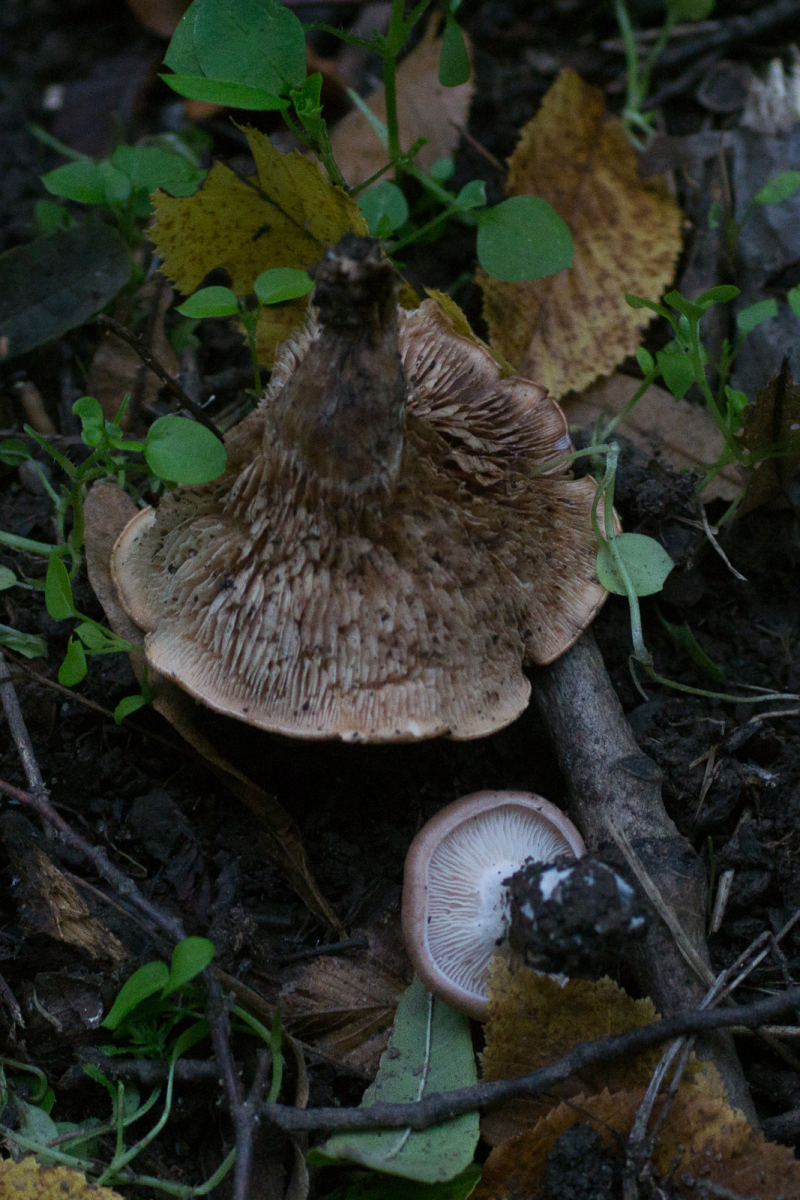 7.1 Nochmal Lacktrichterling. In der Nähe aber sieht etwas anders aus. Die Lamellenabstände sind viel weiter, die Stiele sind dezentral und die Lamellenfarbe ist dunkler. Links einer der vorherigen zum Vergleich.