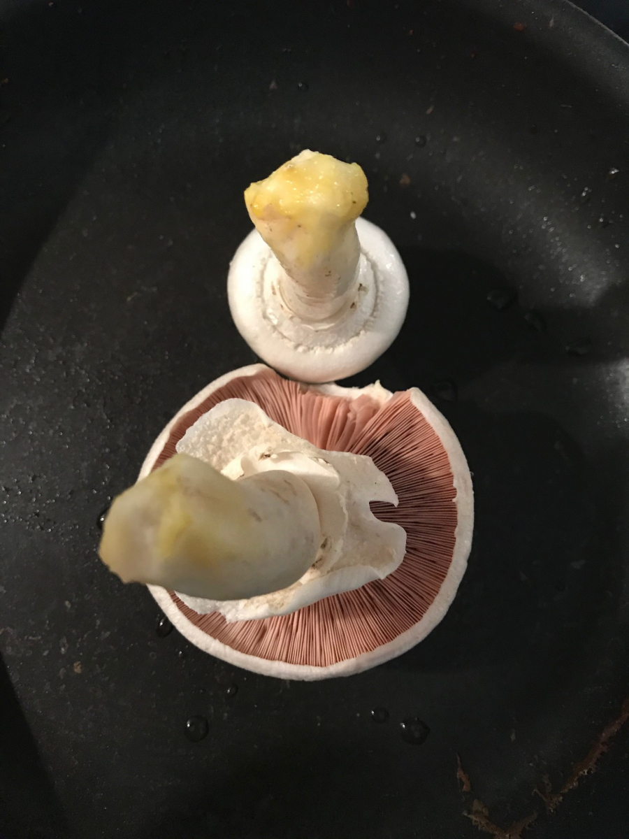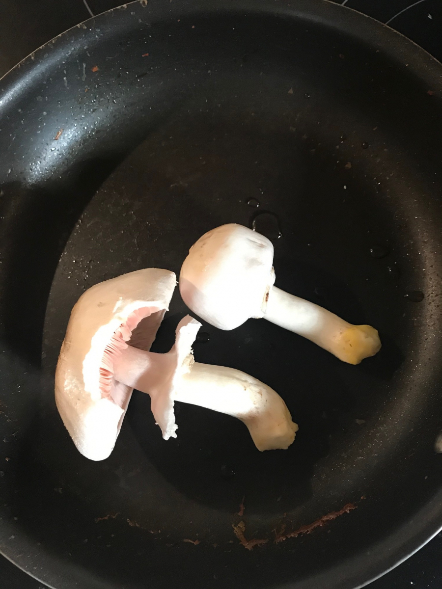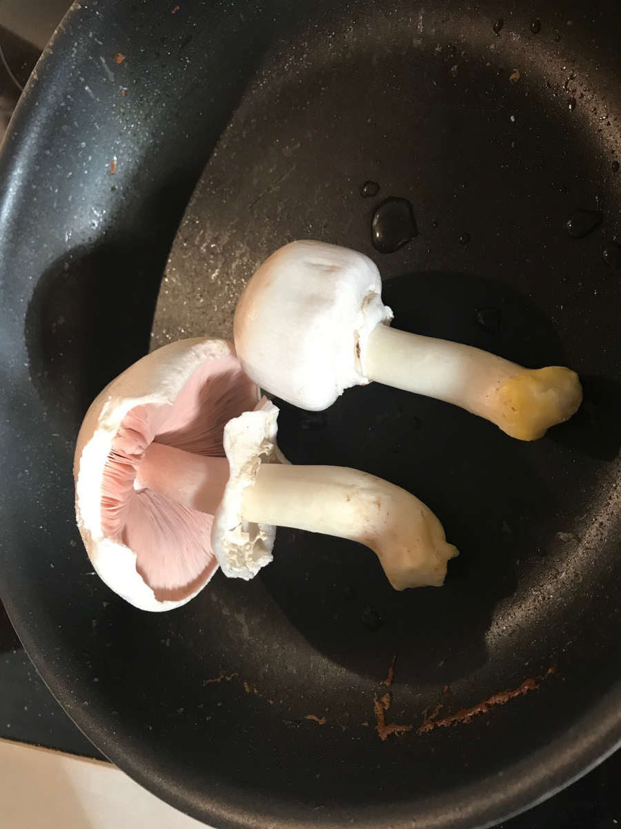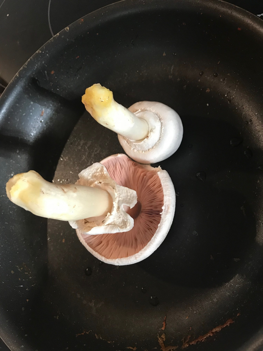 Hoppla! Mit Sicherheit keine Wiesenchampignons, und mit an Sicherheit grenzender Wahrscheinlichkeit Karbolchampignons, also giftig. Das sind wirklich alle Merkmale außer des Geruchs deutlich zu sehen, und selbst den erahne ich beim Anblick der Pilze in der Pfanne.