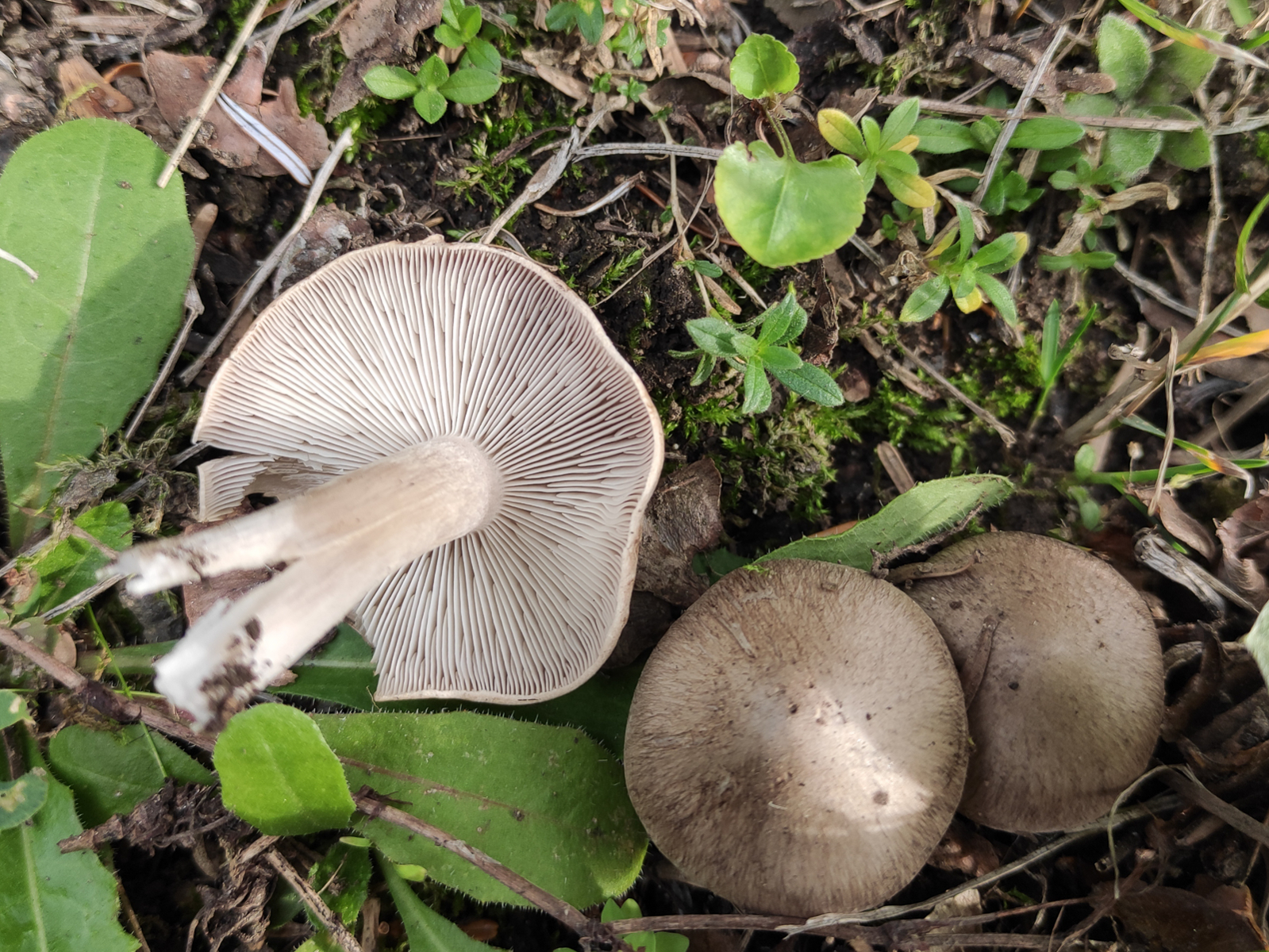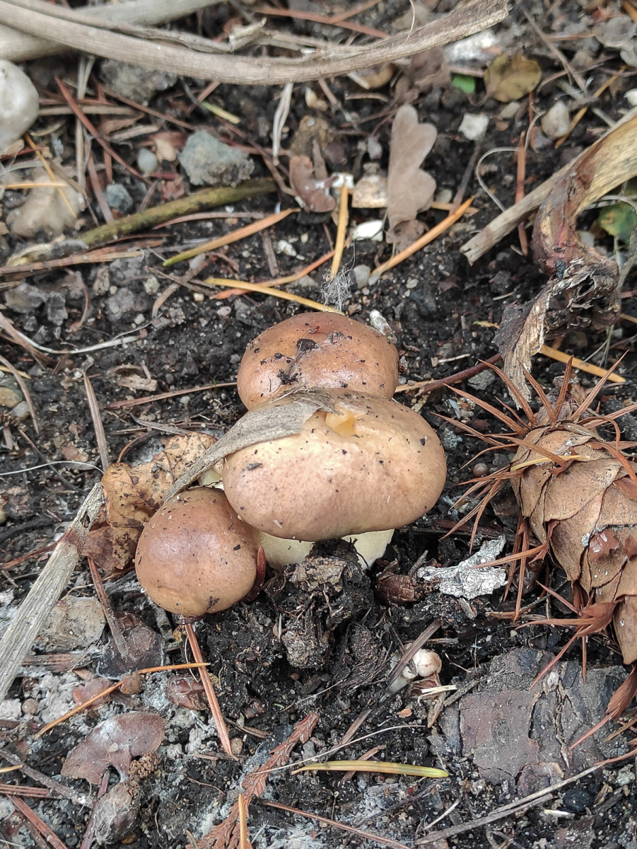 2. Ebenfalls unter beiden Bäumen stehen Pilze mit Erdritterlingshabitus. Er riecht deutlich mehlig. Der gemeine kann es wohl nicht sein wein kein Pinus vor Ort? Gibt es da welche die mit Pseudotsuga oder Abies Mykorrhiza machen? Ich habe nur den Tiger-Ritterling gefunden als Option. Habe einen mitgenommen um zu gucken ob er verfärbt, bisher noch nix.