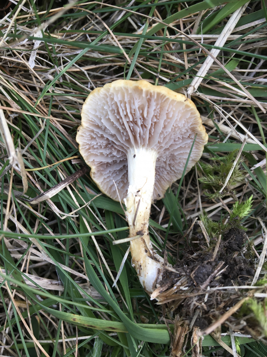 Dieser relativ kleine gelbe Pilz hat auffallend gesägte lila Lamellen.