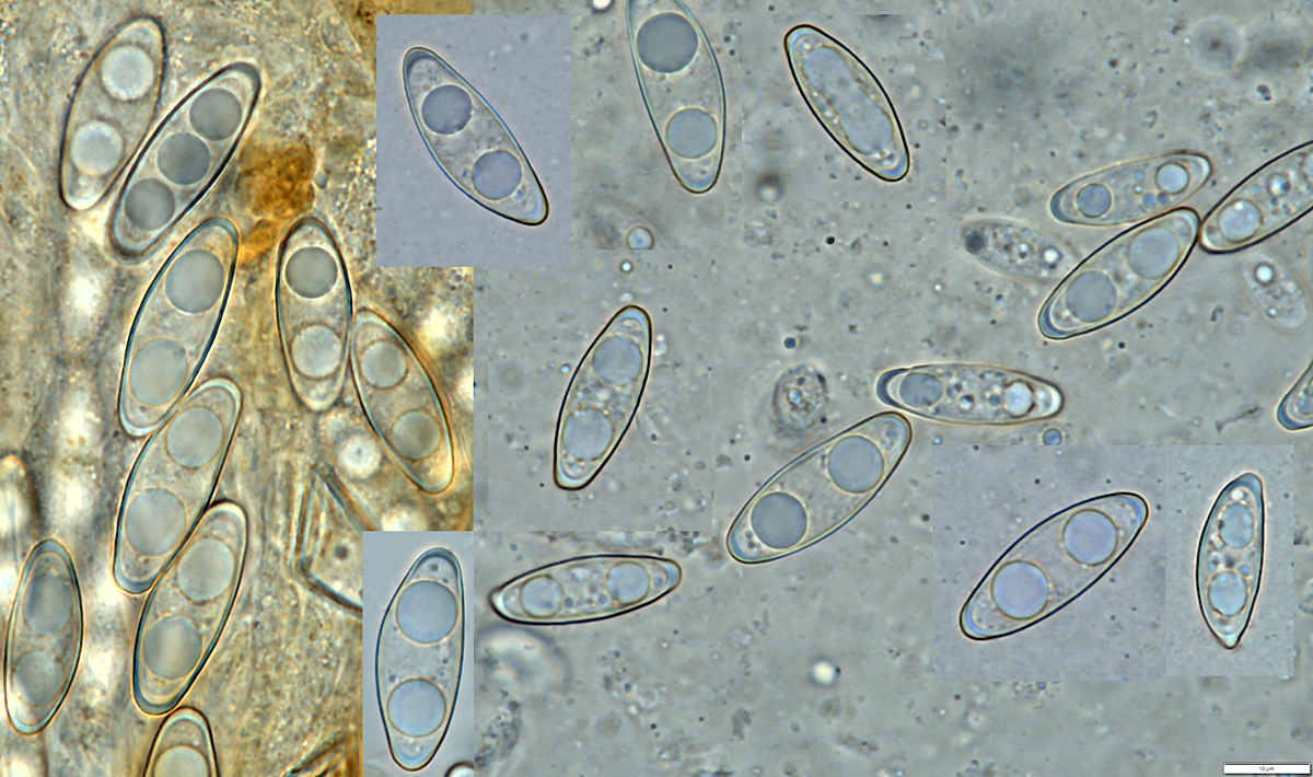 Hier ist es besser zu erkennen – oben links sind Sporen von Gyromitra infula, unten und rechts von Gyromitra ambigua. Man kann die Unterschiede in der Form, der Größe und der Ausprägung der Kappen gut sehen, finde ich.