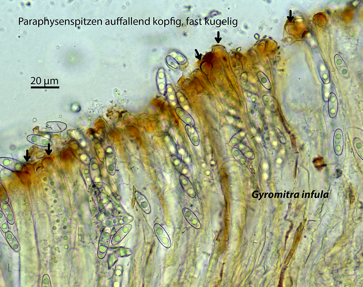Schaut man dann die Paraphysen an, so fällt auf, dass Gyromitra infula wunderschön aufgeblasene, kopfige Paraphysenspitzen zeigt. Die Köpfe sind richtig breit und teils sogar kugelig. Bei gyromitra ambigua sind sie zylindrisch bis etwas verdickt, teils auch etwas kopfig, aber nie so angeschwollen, keine Kugeln am Stiel.