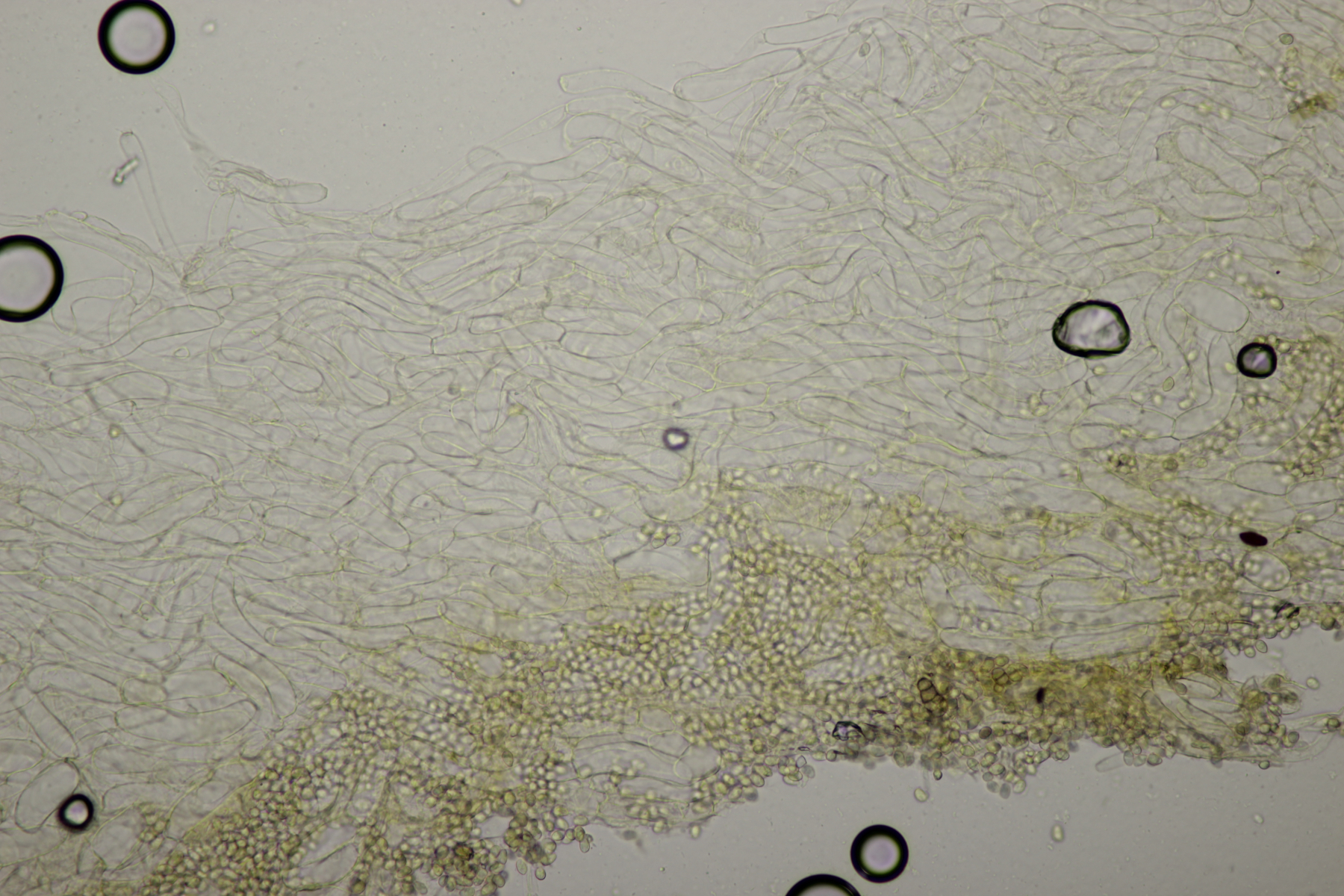 16. Hier hab ich im Feld erstmal an einen Rötling gedacht. Mitgenommen hab ich ihn aber trotzdem und war dann erstaunt, daß es ein Weißsporer ist. Könnte es Arrhenia griseopallida sein? Sporen (6.0-9.6) µm x (4.0-6.0) µm, Q=1.4-1.7 bzw. (8.4+-1.0) µm x (5.3+-0.6) µm, Q=1.6+-0.1, Basidien 4-sporig, Schnallen vorhanden.