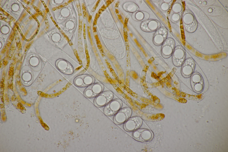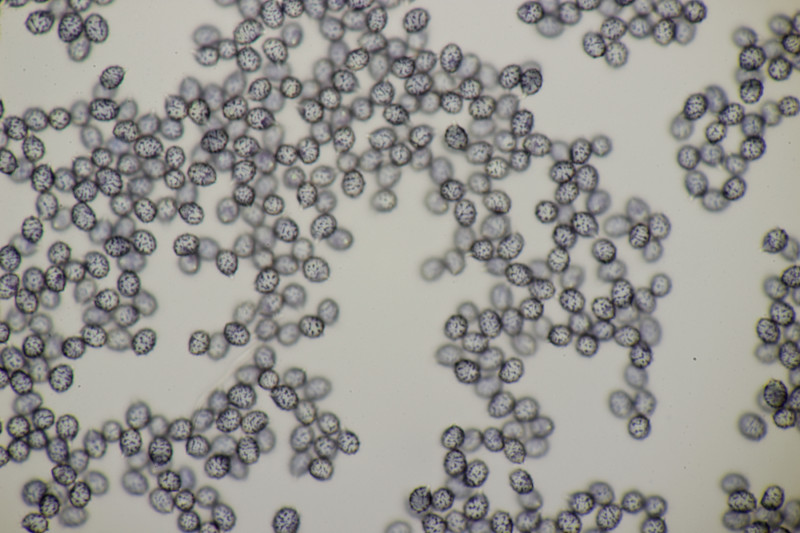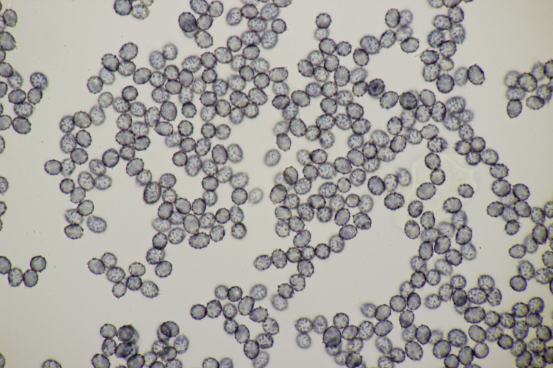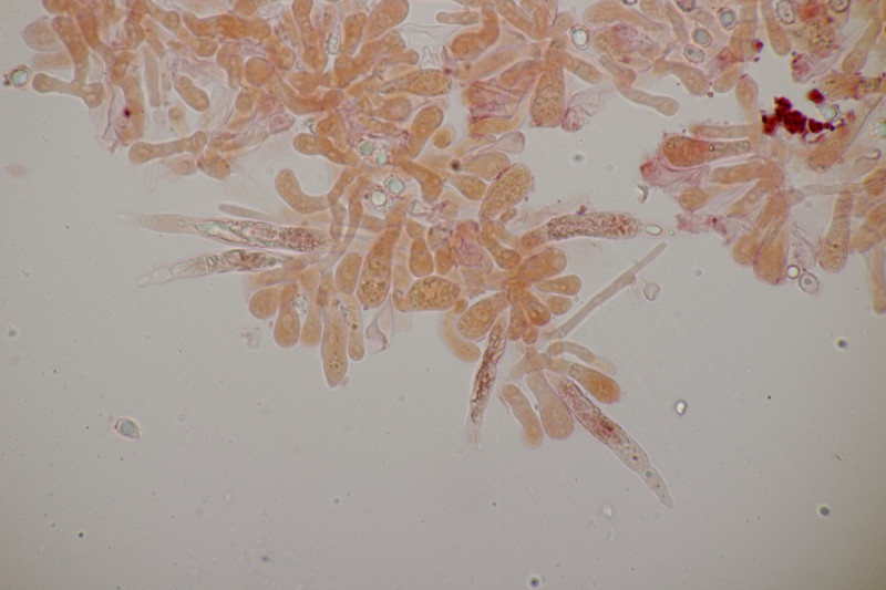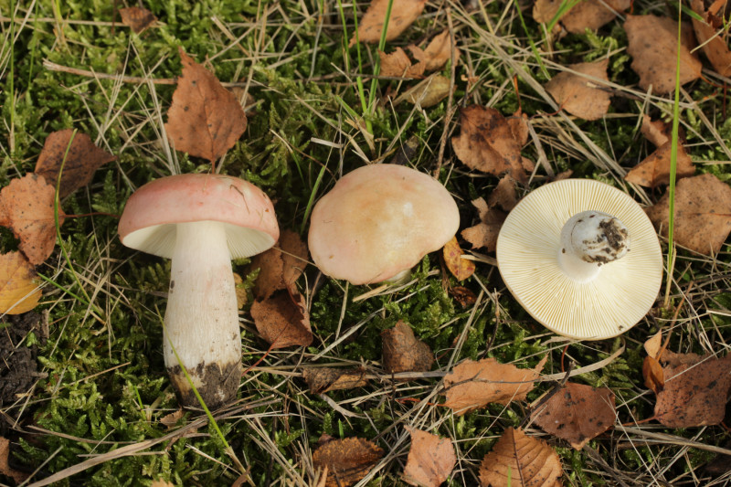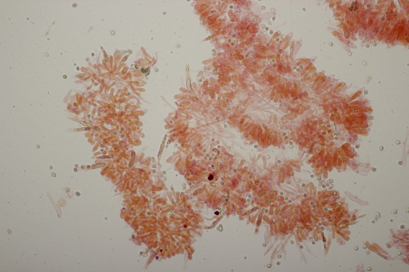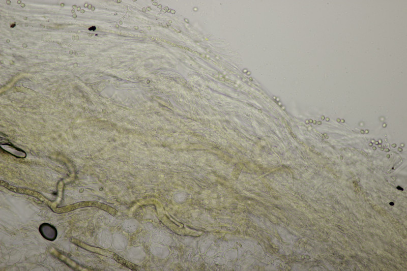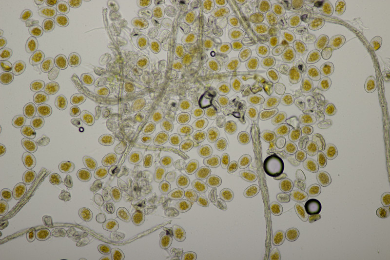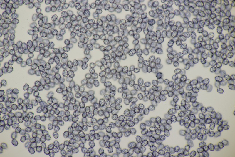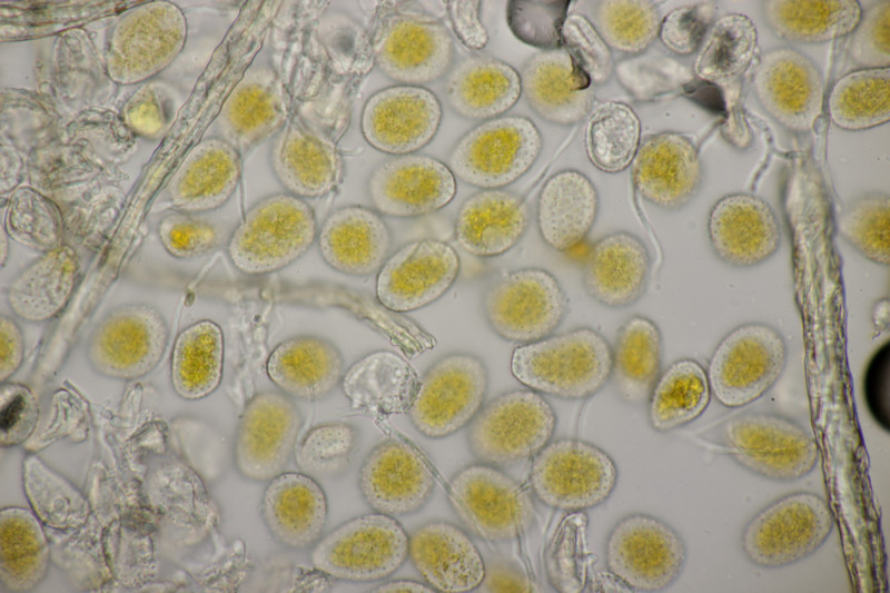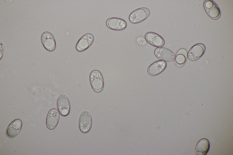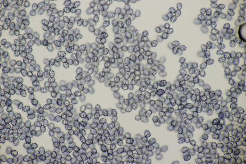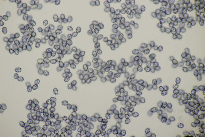 2. Unter Birke, ein Hauch von Schärfe am Beginn, dann eher fruchtig, an Apfel erinnernd, negative Guajak-Reaktion, Eisensulfat-Reaktion trivial, Sporenpulverfarbe IVb. Das ist zwar etwas dunkel, ich hatte aber auch Sporen für eine ganze Kompanie. Deshalb würde ich da insgesamt trotzdem Russula exalbicans zu sagen.