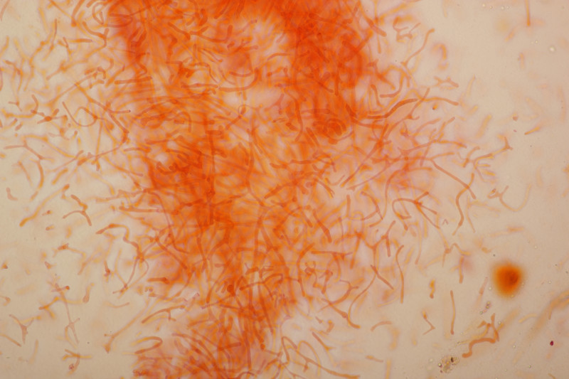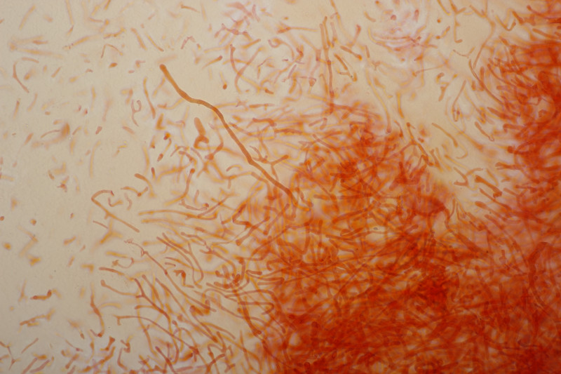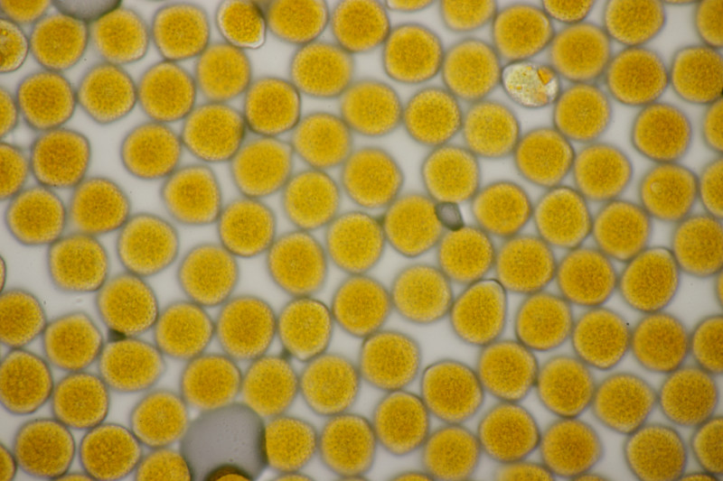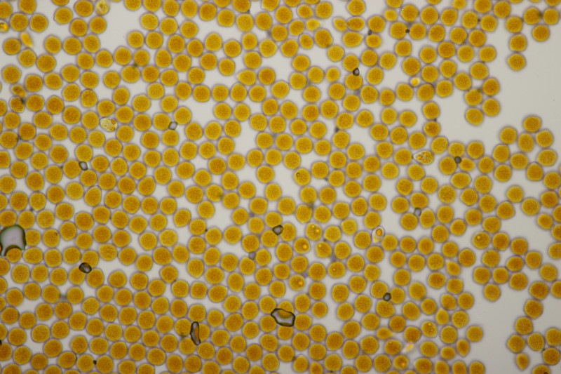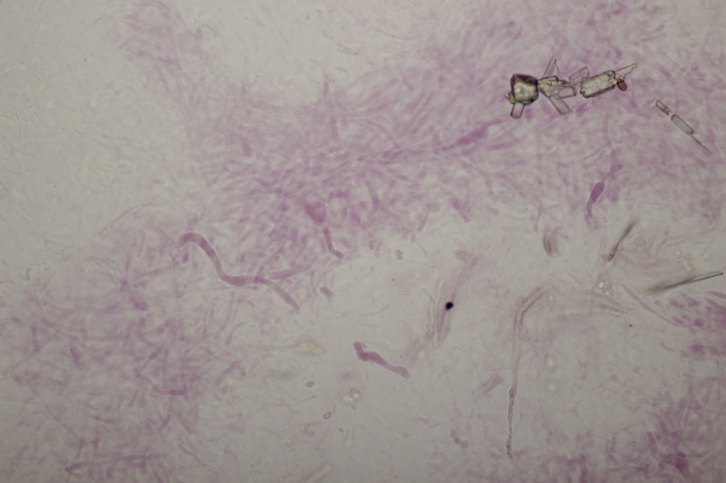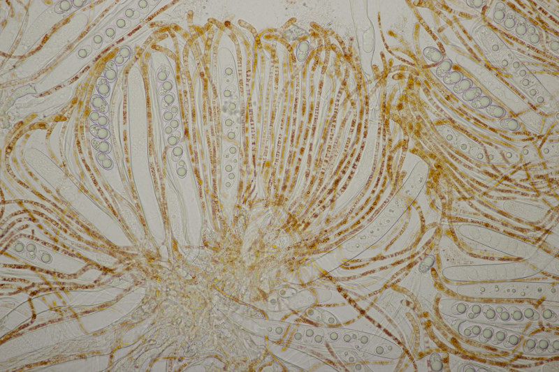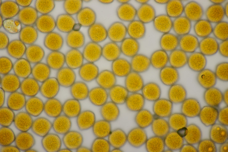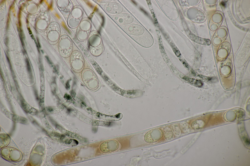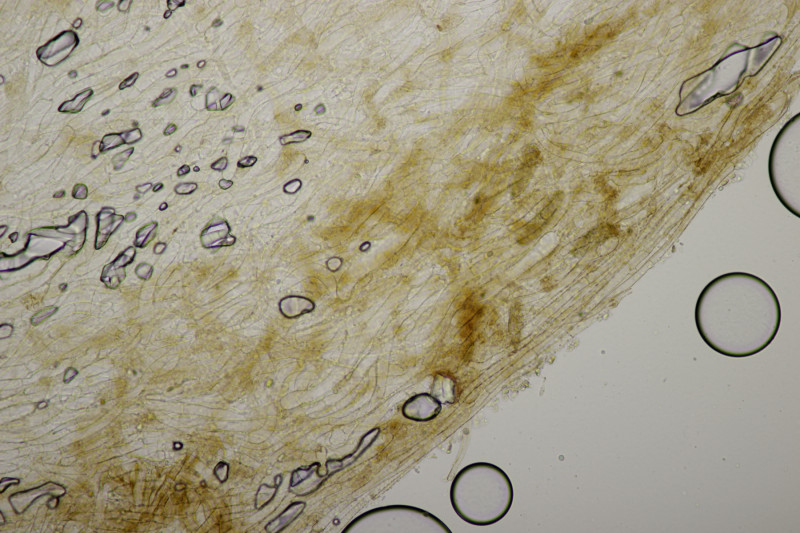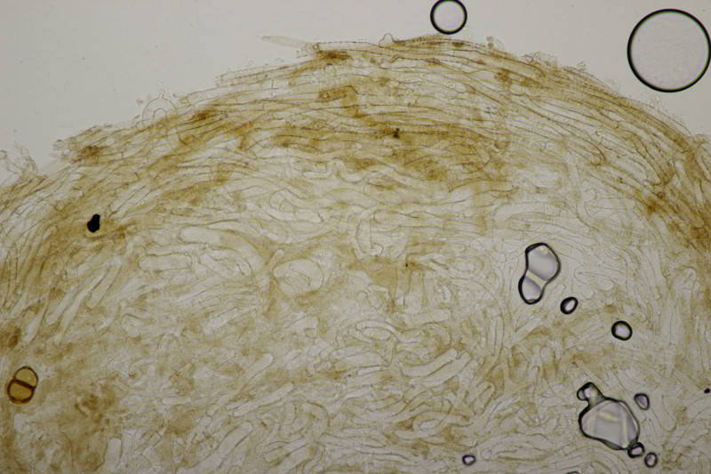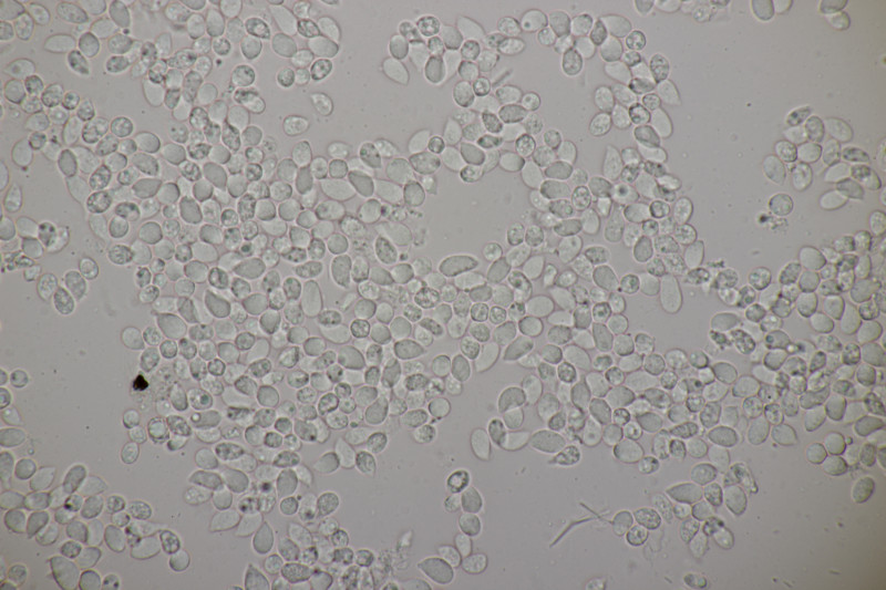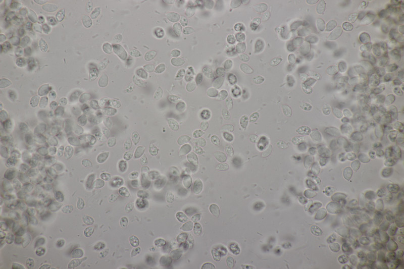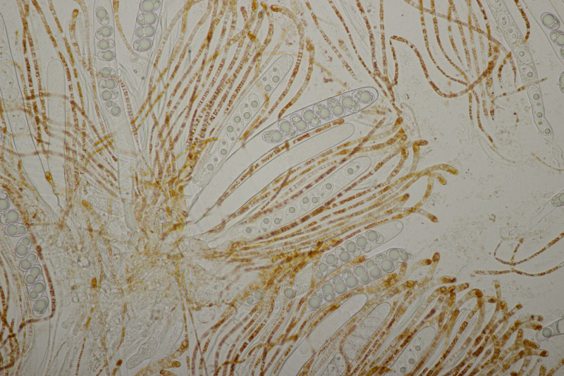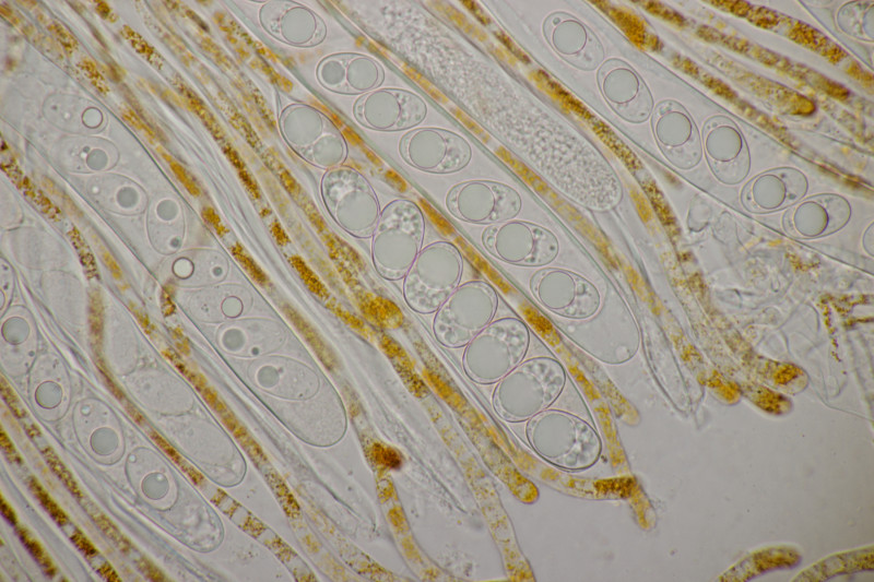 2. Unter Birke, ein Hauch von Schärfe am Beginn, dann eher fruchtig, an Apfel erinnernd, negative Guajak-Reaktion, Eisensulfat-Reaktion trivial, Sporenpulverfarbe IVb. Das ist zwar etwas dunkel, ich hatte aber auch Sporen für eine ganze Kompanie. Deshalb würde ich da insgesamt trotzdem Russula exalbicans zu sagen.