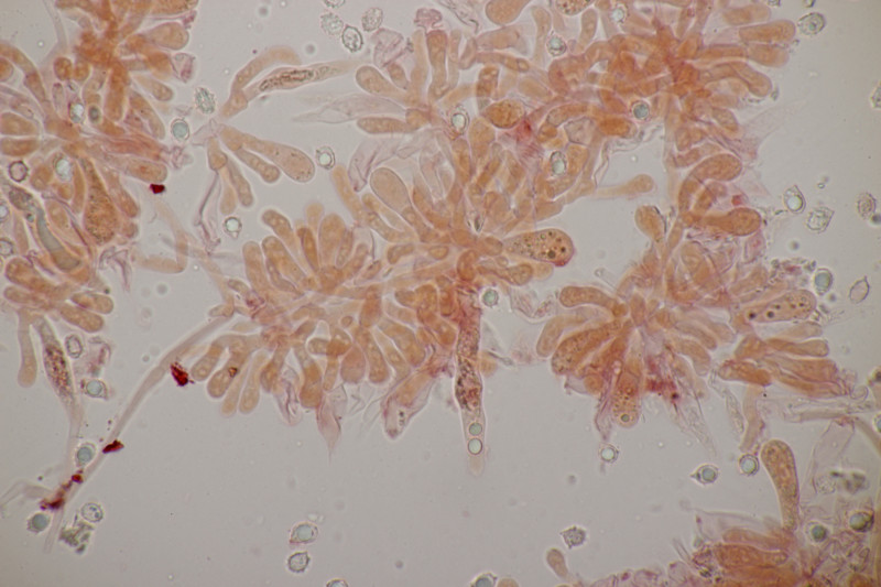 6. Omphalina pyxidata, Sporen (7.2-9.3) µm x (4.5-5.7) µm, Q=1.4-1.9 bzw. (8.0+-0.7) µm x (4.9+-0.4) µm, Q=1.6+-0.1, Basidien 4-sporig mit Basalschnalle