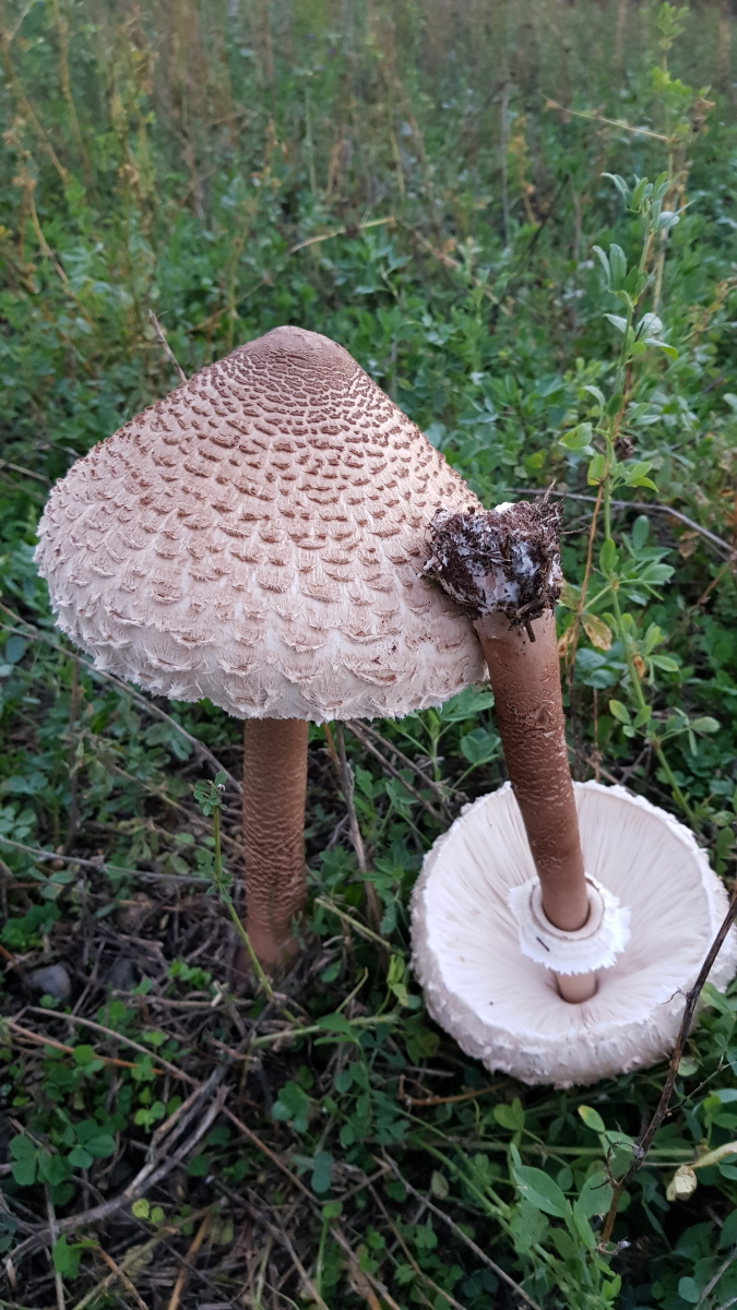 Ich sehe auf beiden Bildern mit jeweils zwei FK von Parasolen i.w.S. keine einheitlich dunkle sondern genatterte Stiele. Dunkle Stielhaut bekommt Risse, dadurch kommt helle stielinnere Farbe zum Vorschein. Das erinnern an Muster bei einer Natter (Schlange), also sieht wie Schlangenhaut aus.