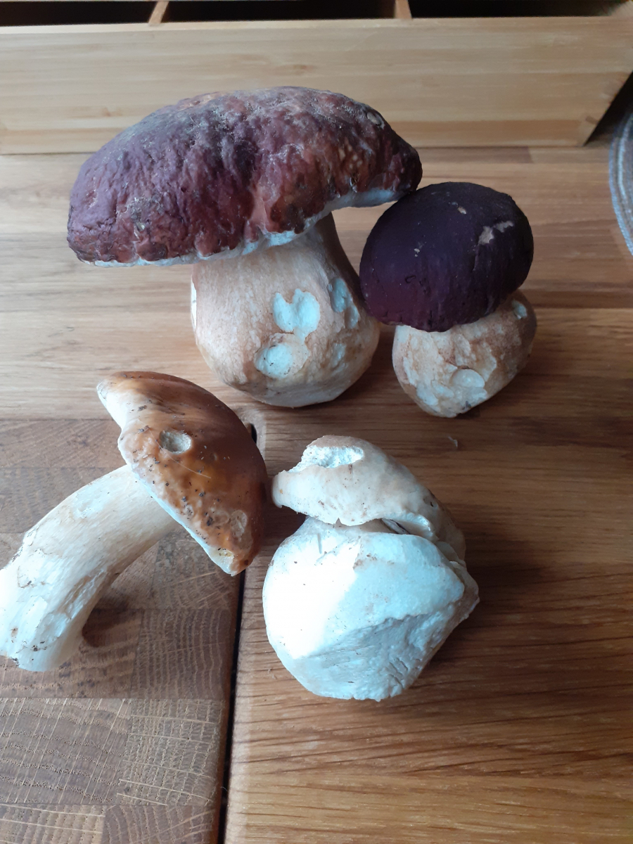 Auf einigen Fotos habe ich zum Vergleich zwei Steinpilze, wie ich sie sonst hier finde, mit fotografiert.
