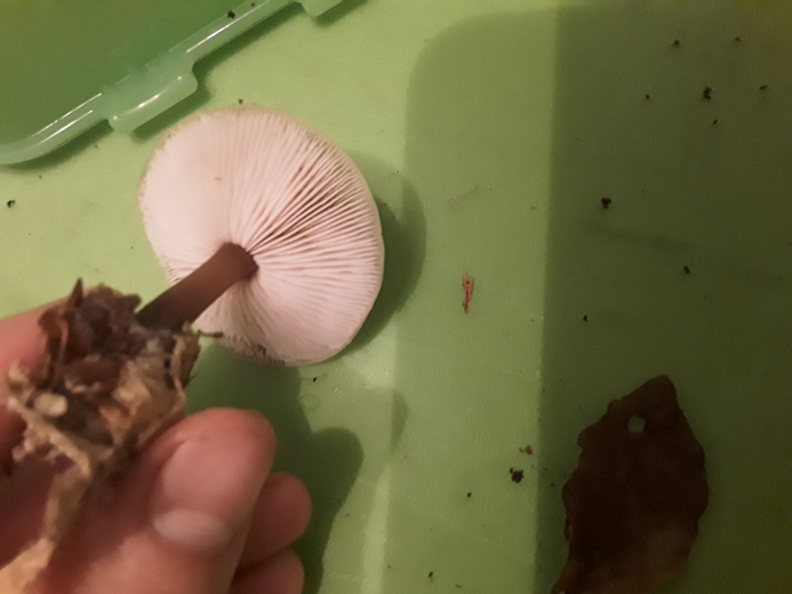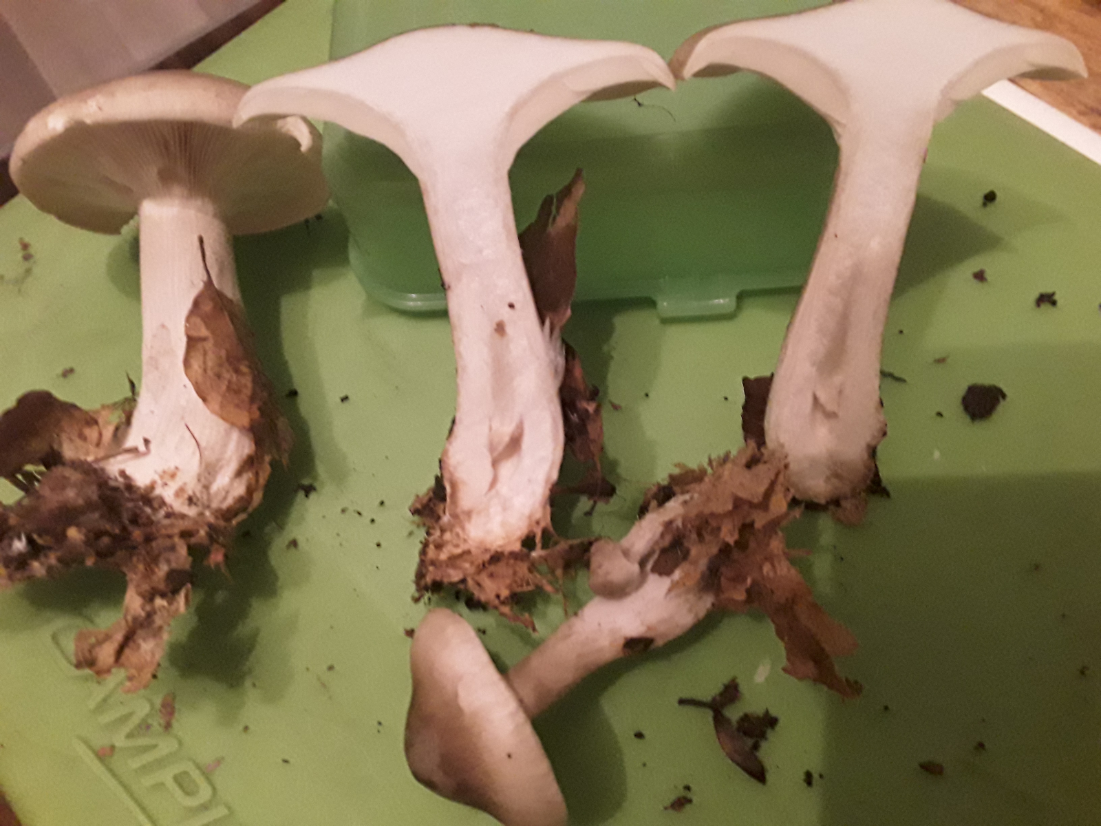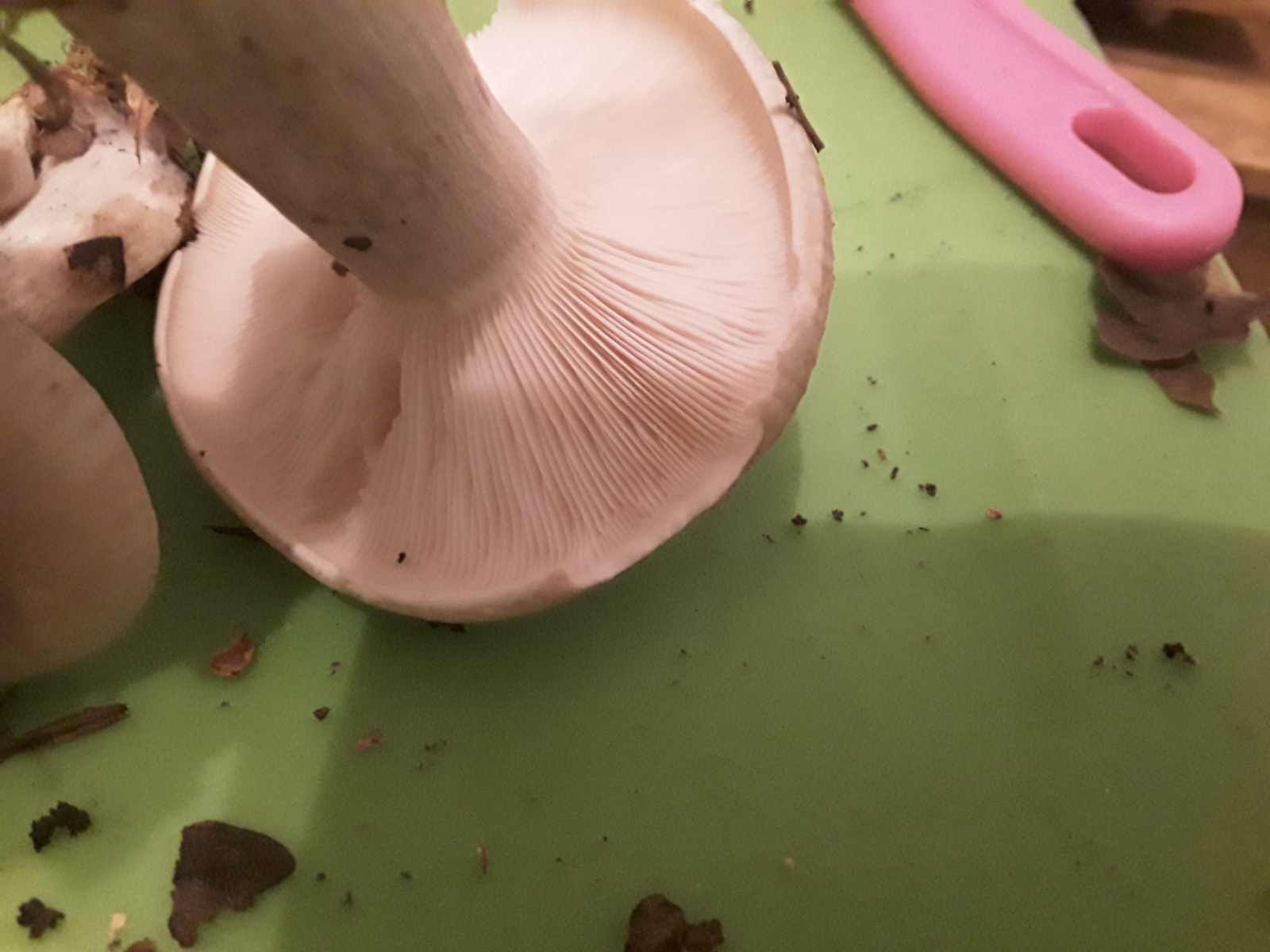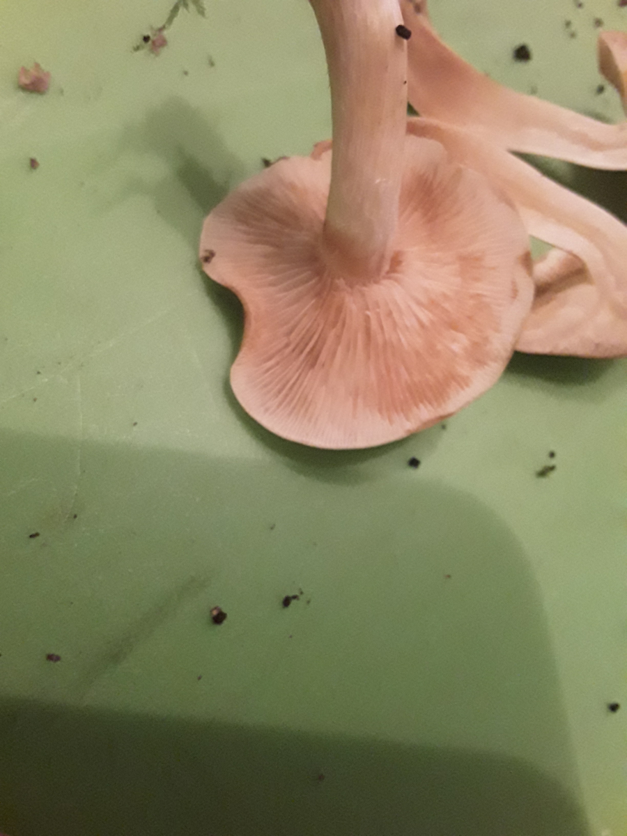 Richt nach Knoblauch, Lamellen biegsam, Huthaut lässt sich zäh abziehen (komplett), Stiel knickt um aber bricht nicht komplett ab