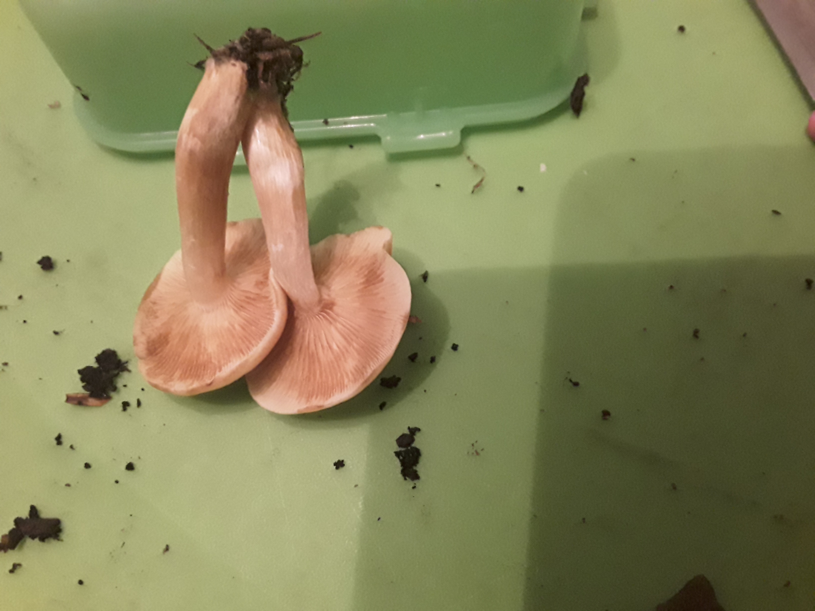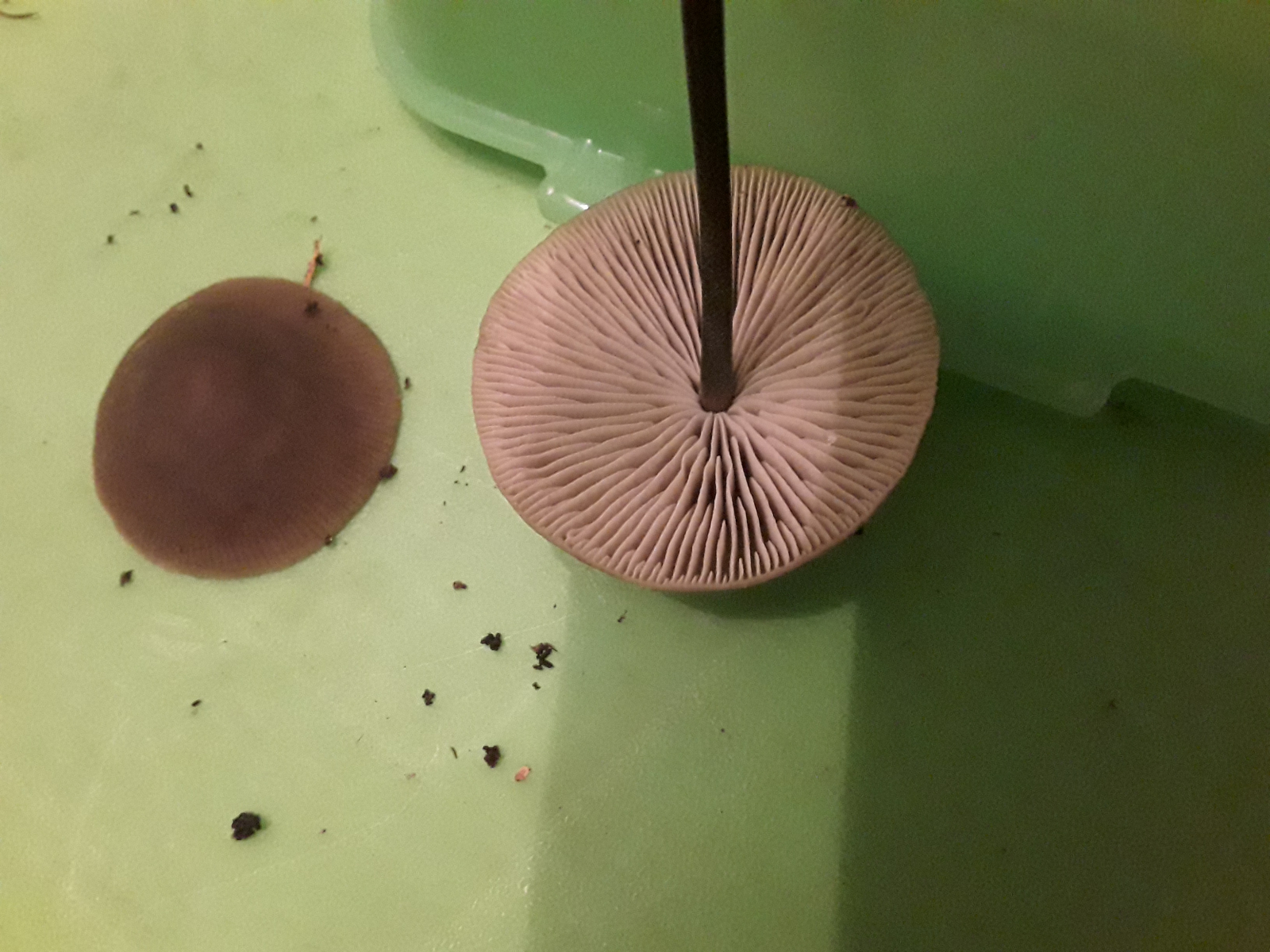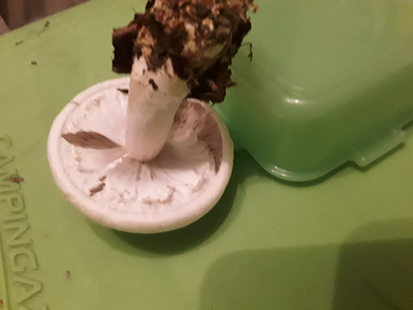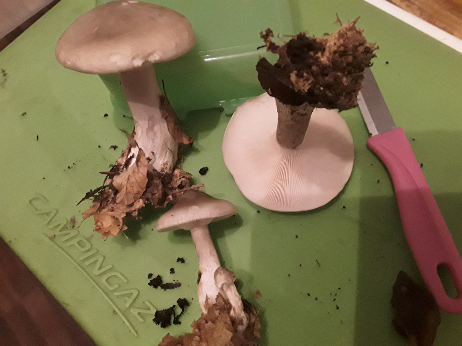 Richt nach Knoblauch, Lamellen biegsam, Huthaut lässt sich zäh abziehen (komplett), Stiel knickt um aber bricht nicht komplett ab