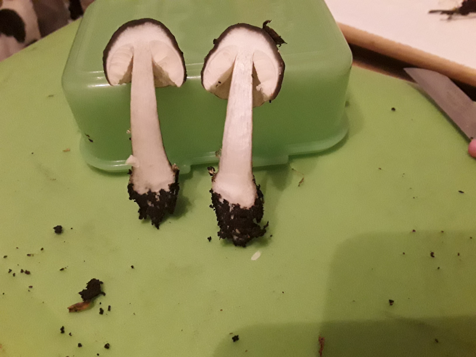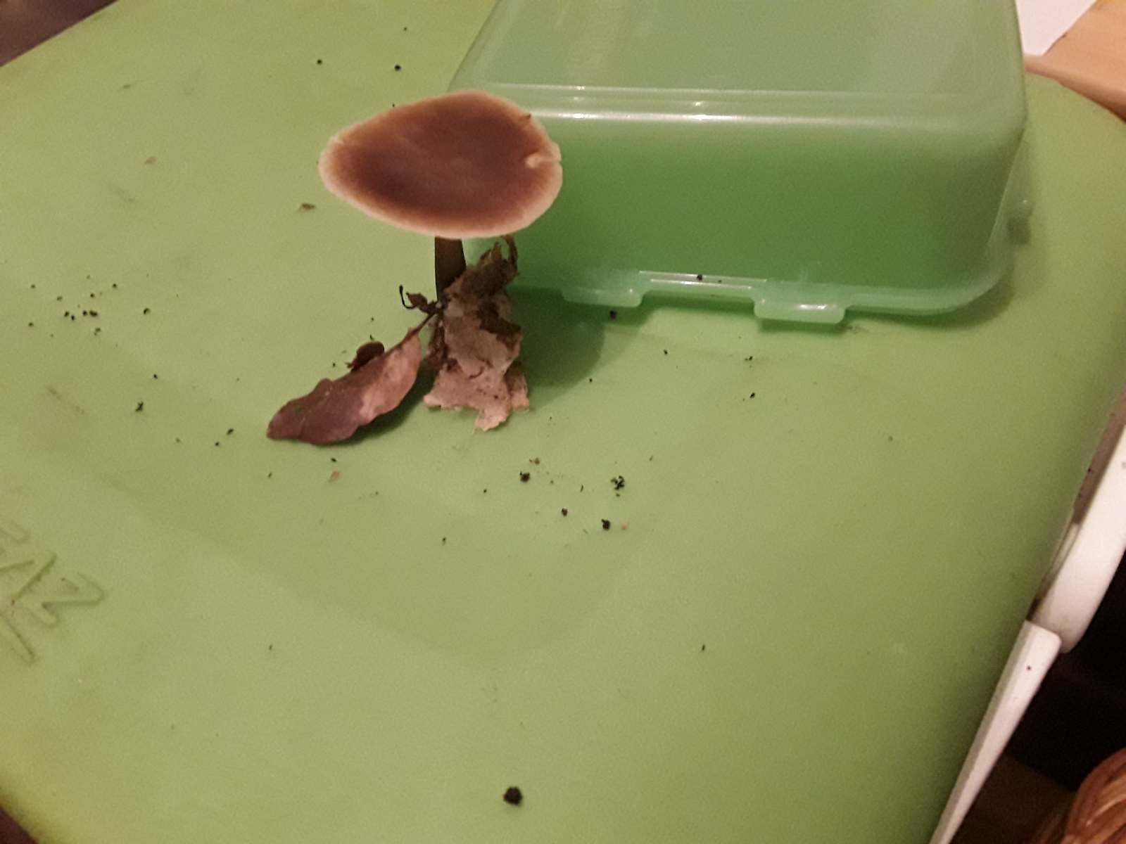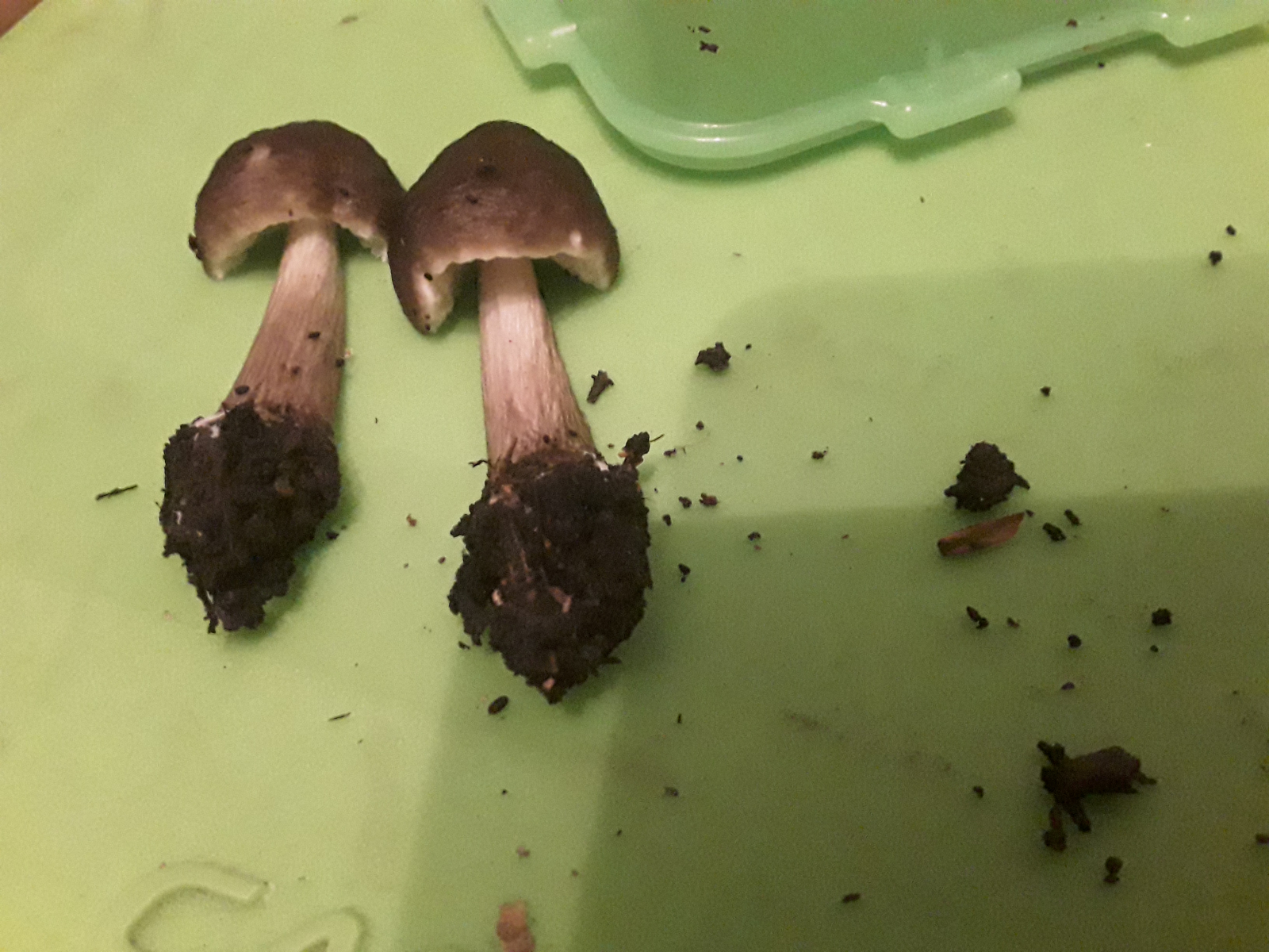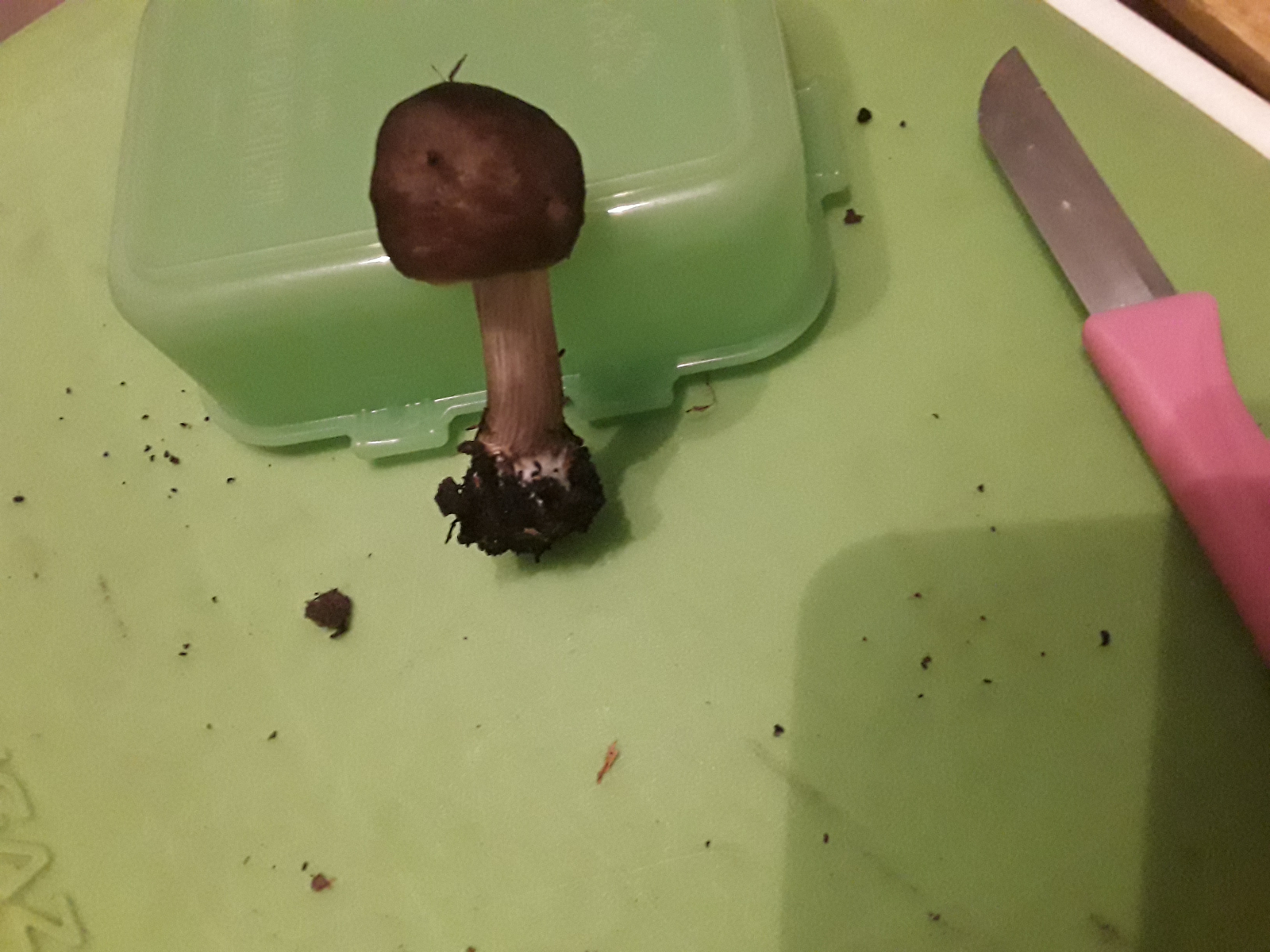 Richt nach Knoblauch, Lamellen biegsam, Huthaut lässt sich zäh abziehen (komplett), Stiel knickt um aber bricht nicht komplett ab