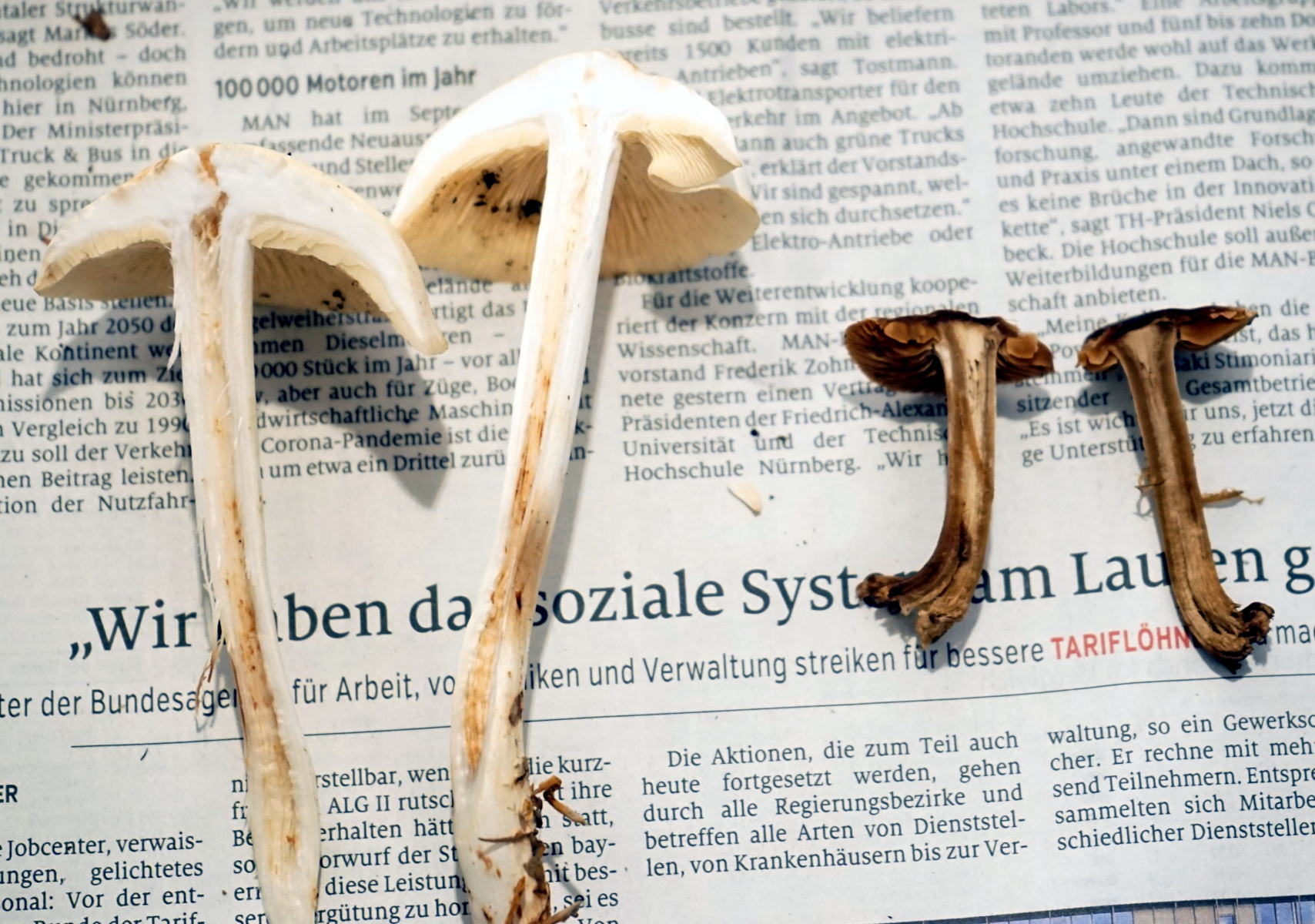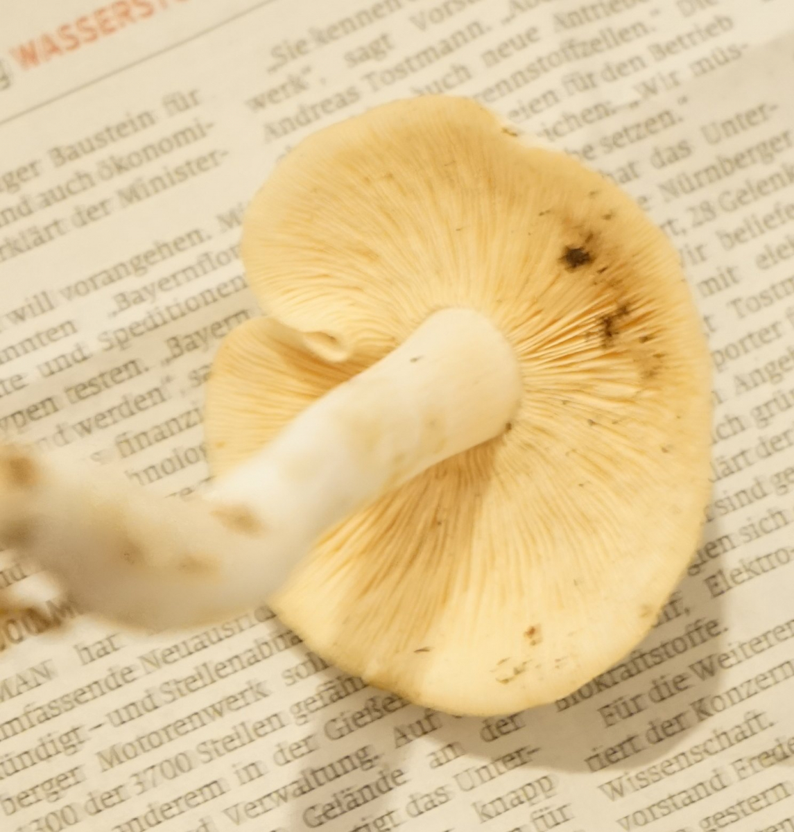 Pilz 2 ist (ich hoffe, man erkennt es) weiß/elfenbeinfarben. Die Lamellen sind ganz leicht dunkler als der Rest. Geruch eher unangenehm.