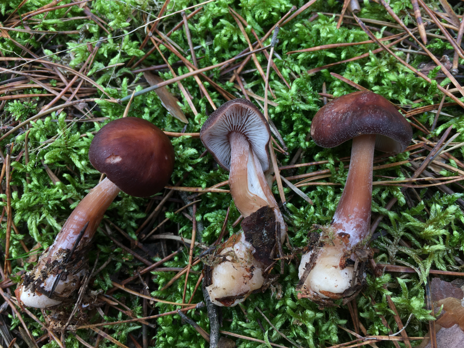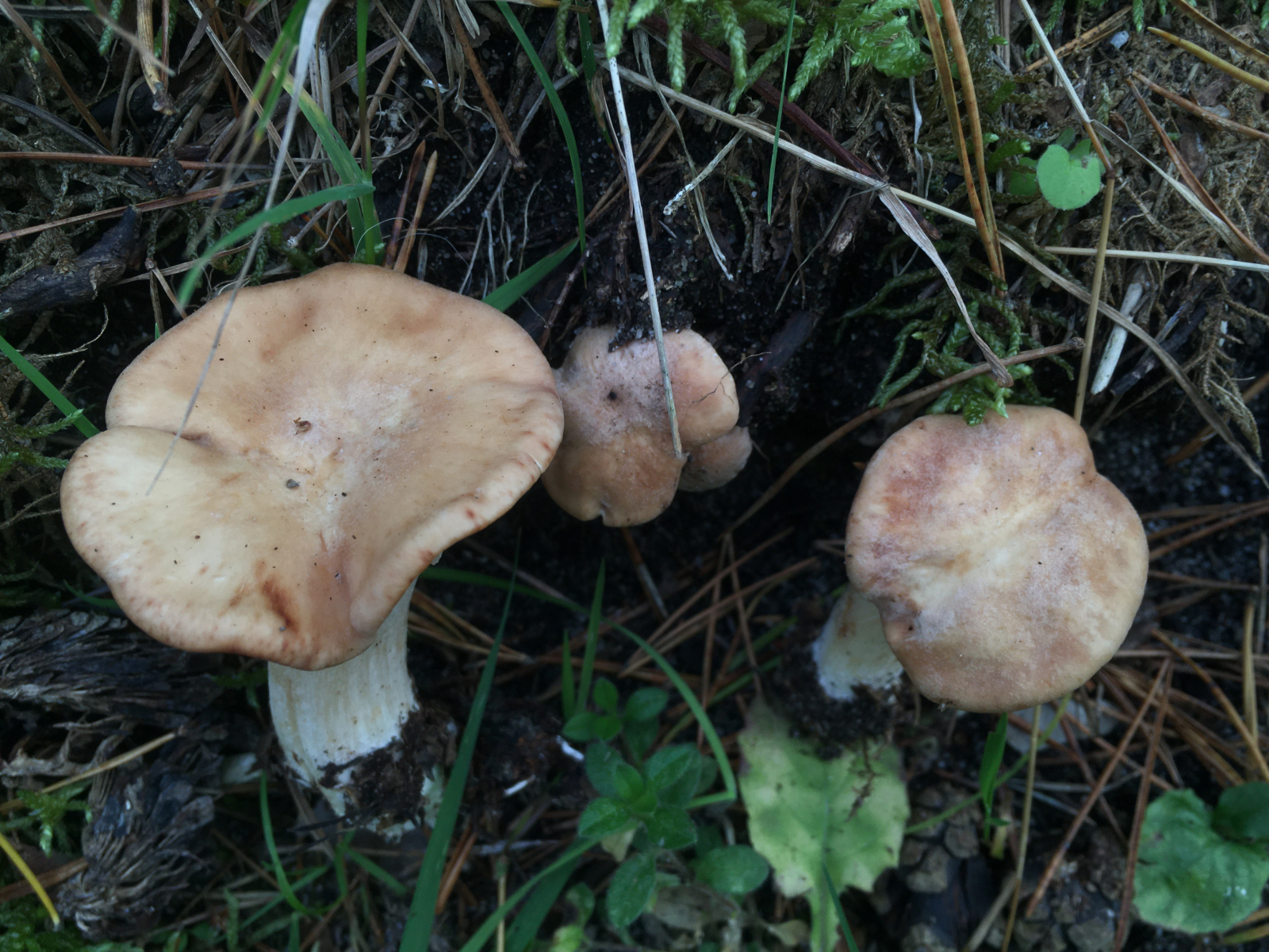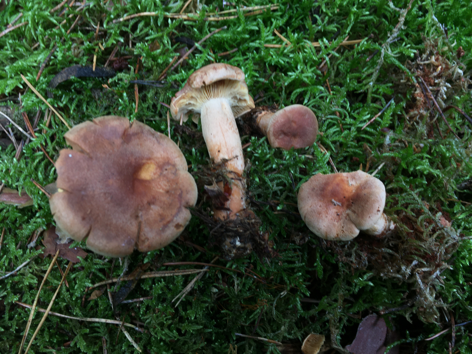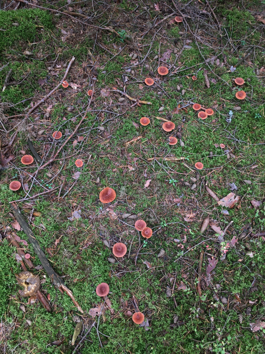 1) Orangeroter Graustieltäubling (R. decolorans) in Massen im Kiefernwald.