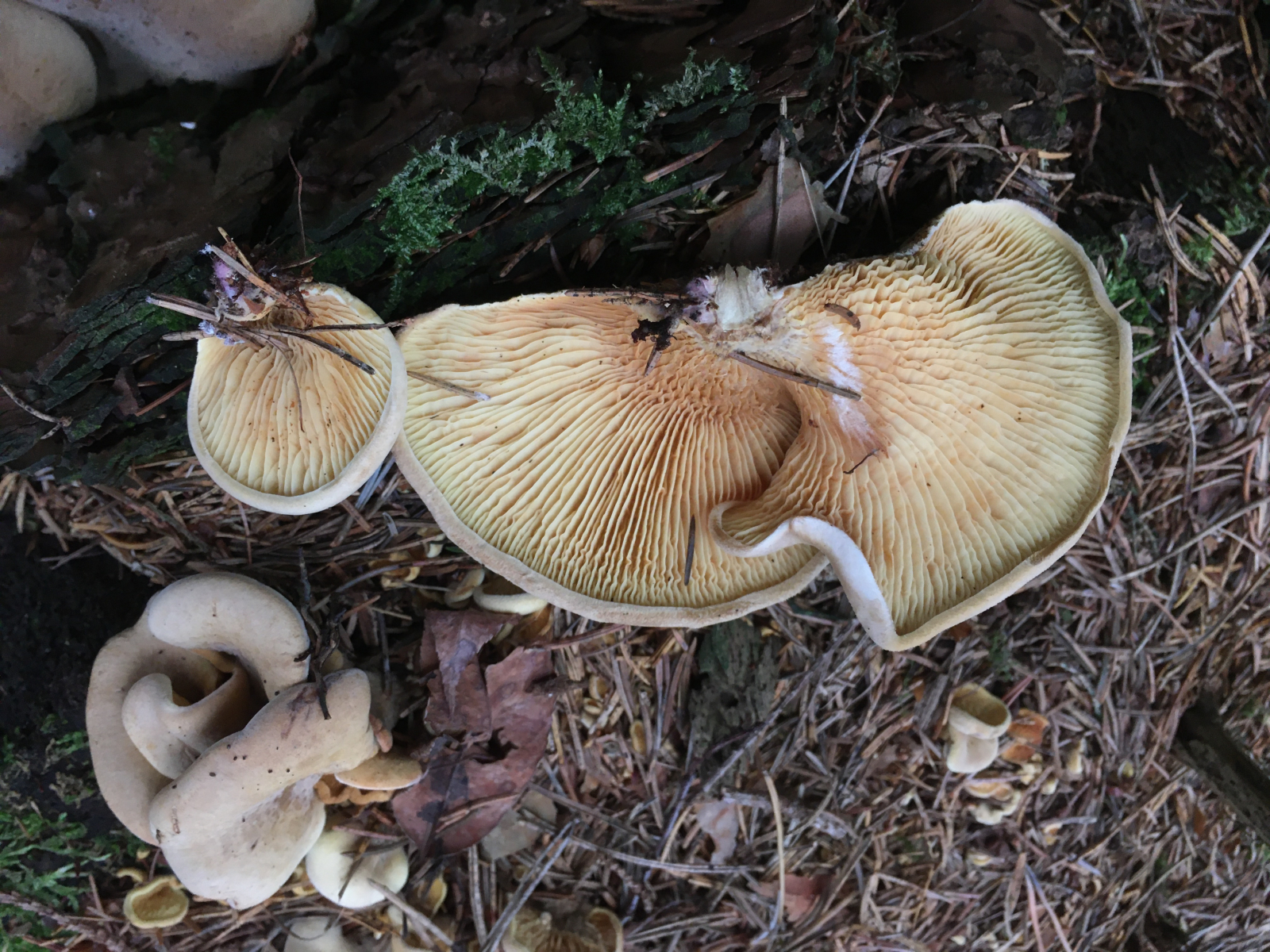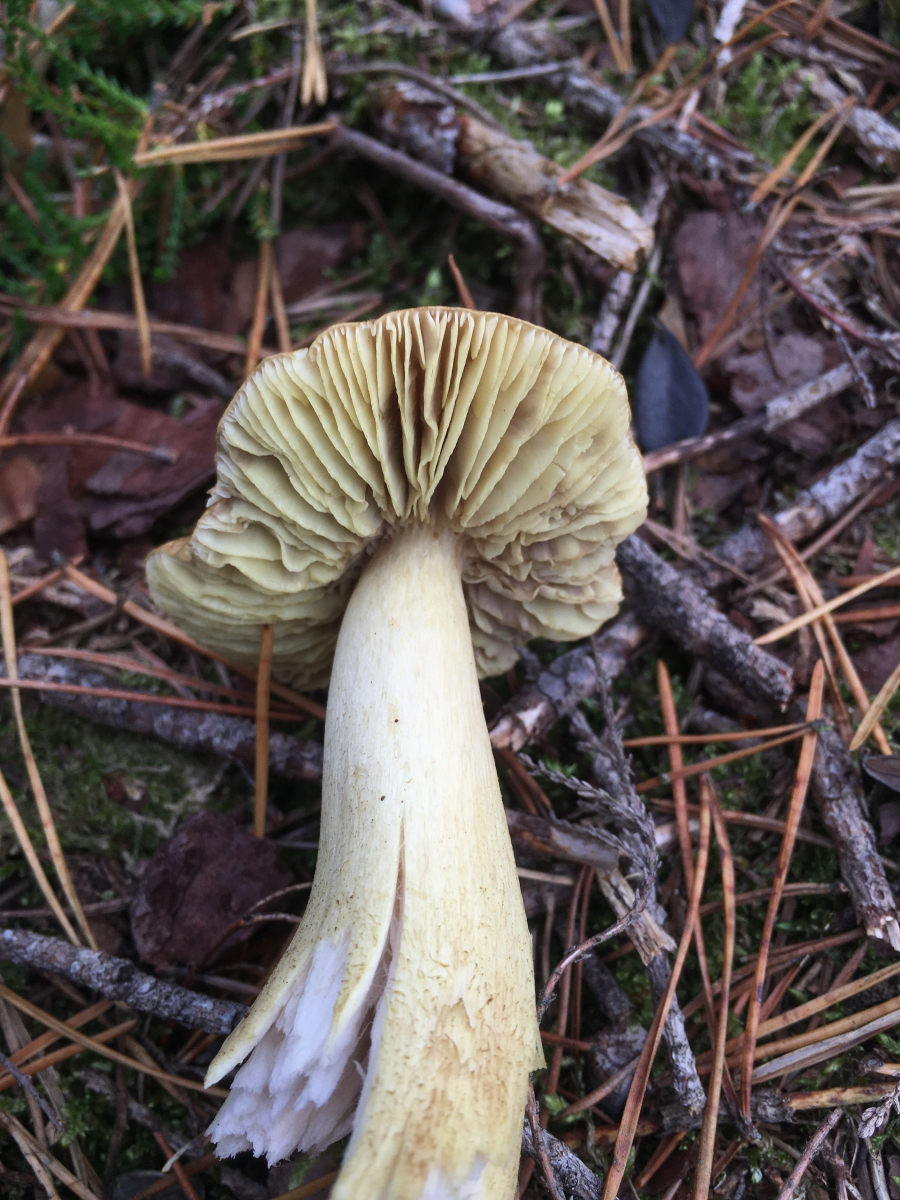 6) ein paar Meter weiter. Geruch leicht mehlig. Hut jung beige/sandfarben, alt etwas schuppig grünlich. Lamellen schwefelgelb, deutlicher als auf dem Foto. Stiel im Schnitt weiss. Irgendwie für mich kein typischer Grünling (Tricholoma equestre) evtl Tr. auratum?