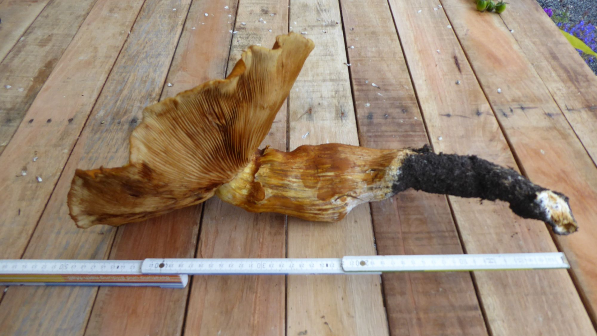 - Größe der Fruchtkörper: Riesig! Ich hab ihn rausgezogen. Dabei hat er eine pfahlähnliche Wurzel gezeigt. Gesamtgrösse des Pilzes, mit Wurzel: 50cm