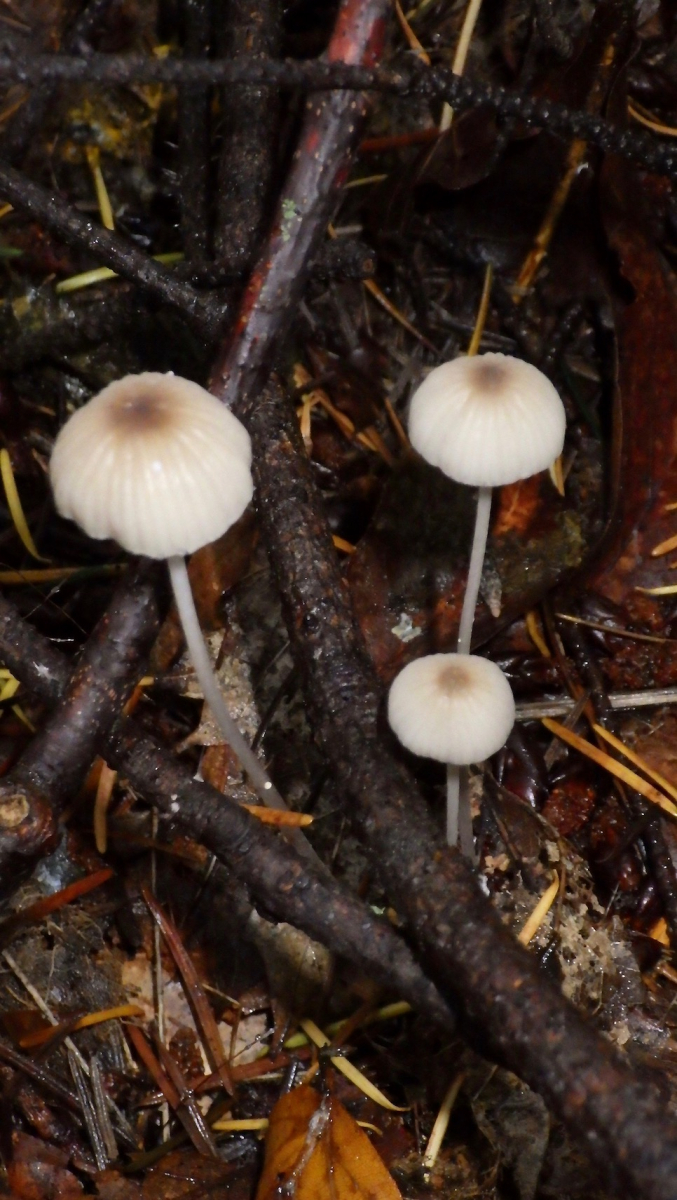 2) Weißmilchender Helmling Mycenae Galopus, sehr kleine Pilzhüte um 1-2cm, sehr lange helle Stiele, weisse Milch