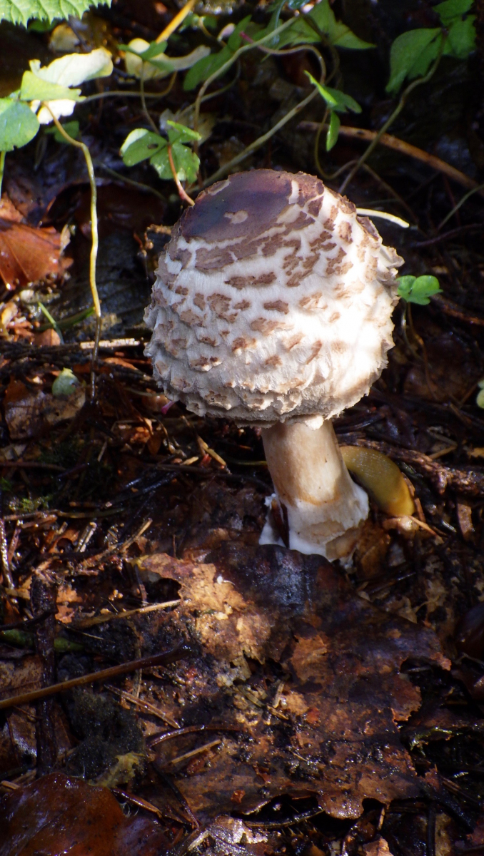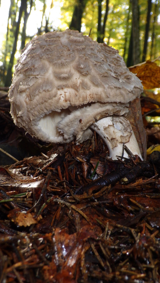5) Gemeiner Safranschirmling Chlorophyll rachodes, fast weisser oder hellbrauner ungenatterter Stiel