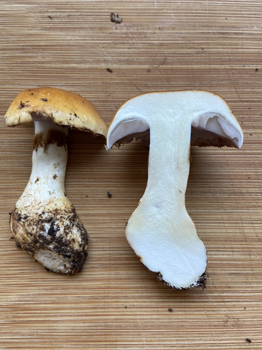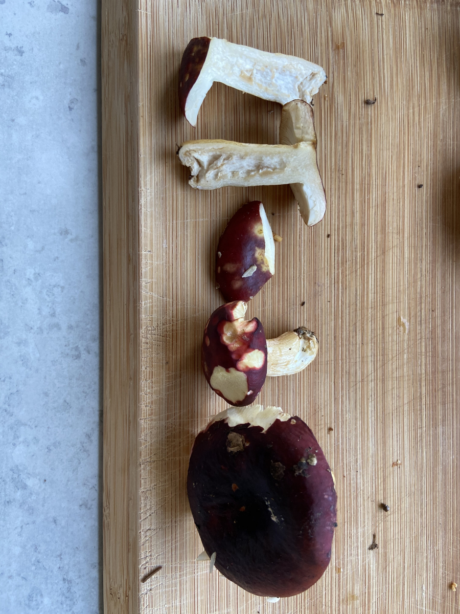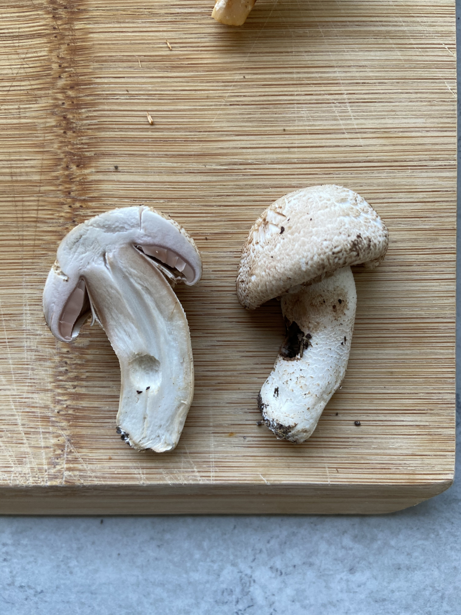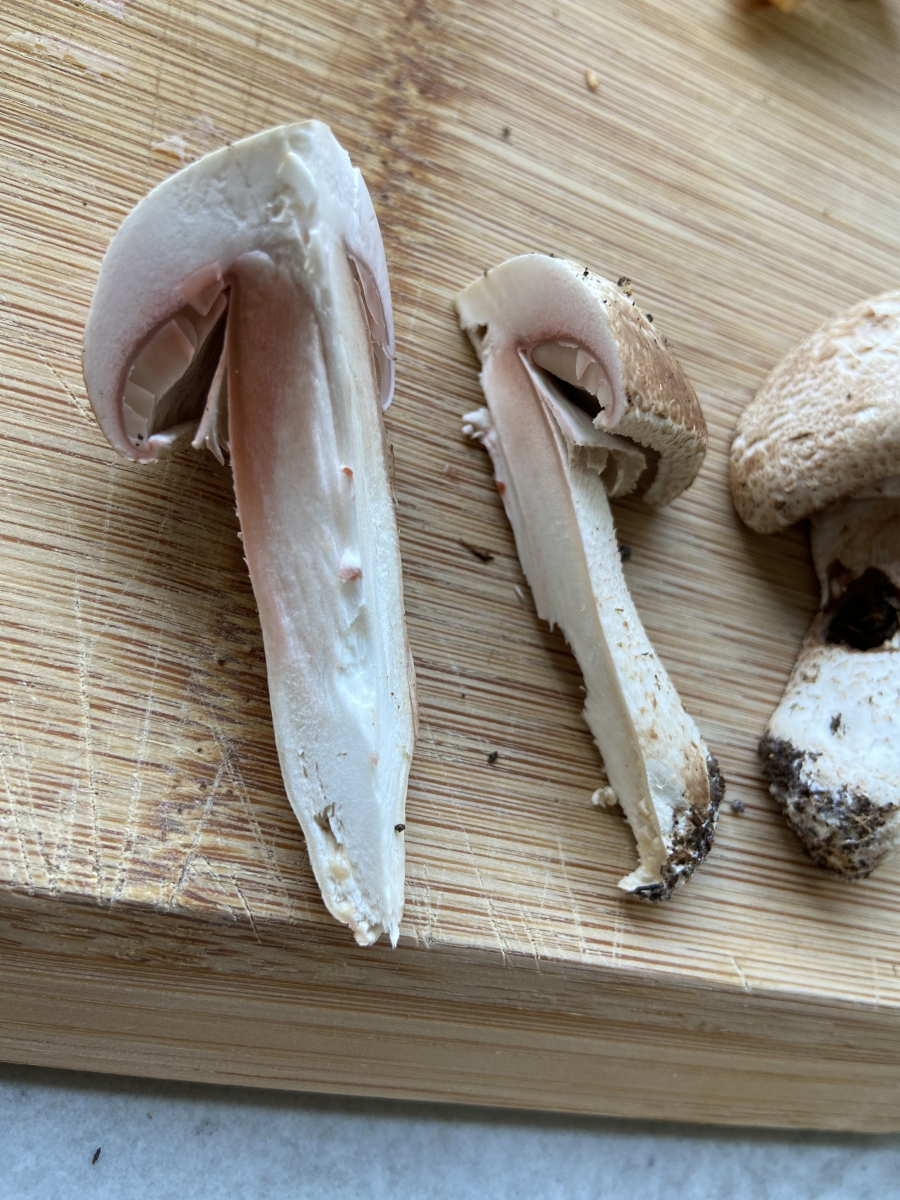 4. ein Champignon, der direkt an einer Fichte Stand. Beim Schnitt deutlich rötend (siehe 2. Foto). Die alten Exemplare hatten sehr dunkle Lamellen. Den Geruch kann ich leider nicht wirklich zuordnen.