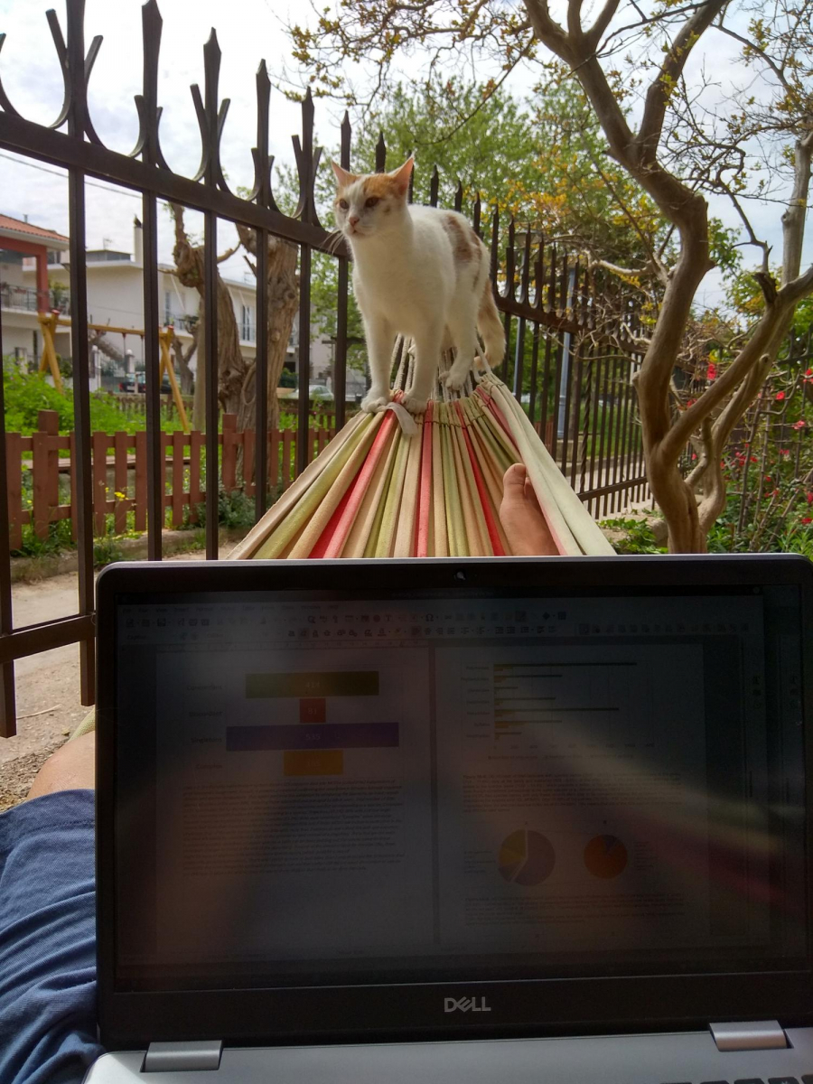 03. Home office. Ich hatte es da recht gut. Wir durften ja im Frühling überhaupt nicht raus, komplette Ausgangsperre, jedesmal, wenn man vor die Tür wollte, musste man umständlich Formulare ausfüllen, die man bei Polizeikontrolle vorzuweisen hatte. Also sehr viel Garten und Hängematte…
