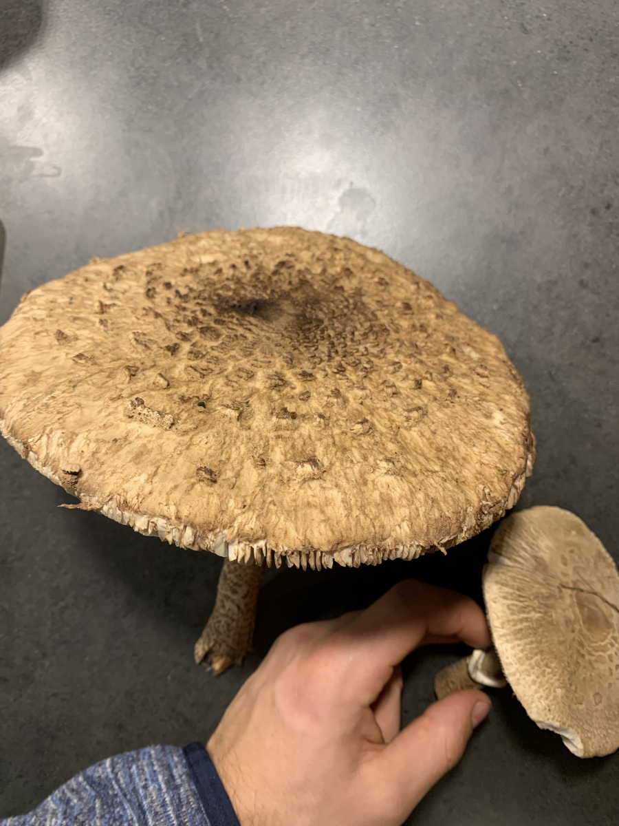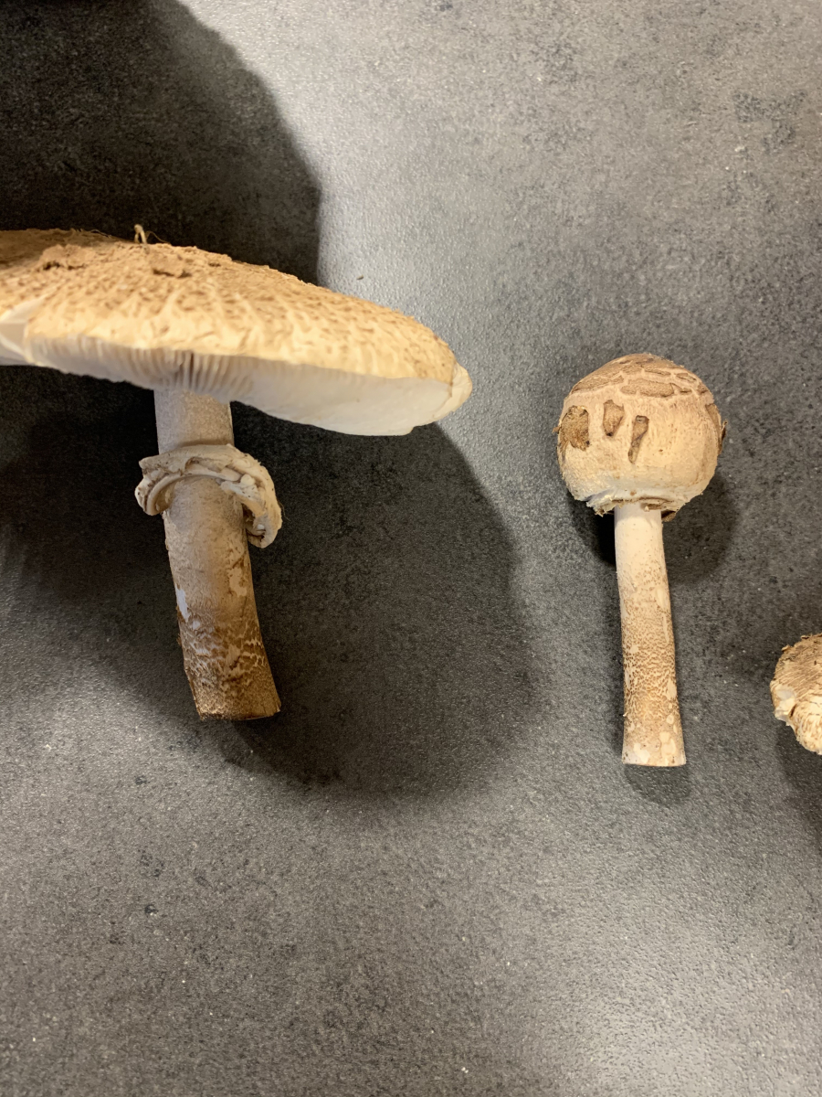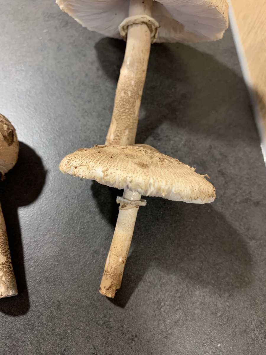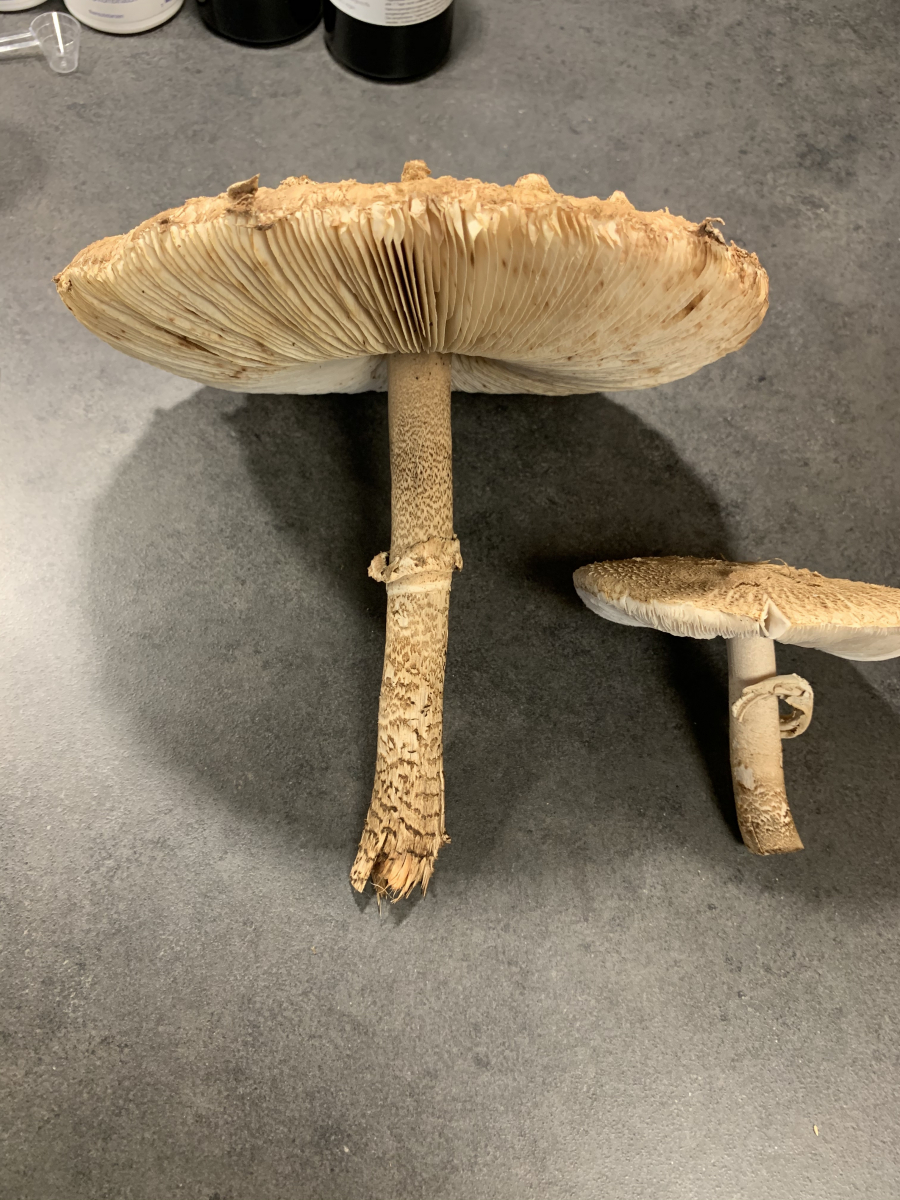 Beim großen Exemplar bin ich mir ziemlich sicher dass es sich um einen Parasol handelt, da der Stiel durchgehend genattert ist. Bei den anderen bin ich mir unschlüssig, da die Natterung nur teilweise und eher unten vorhanden ist. Diese Pilze sind aber auch um einiges kleiner.