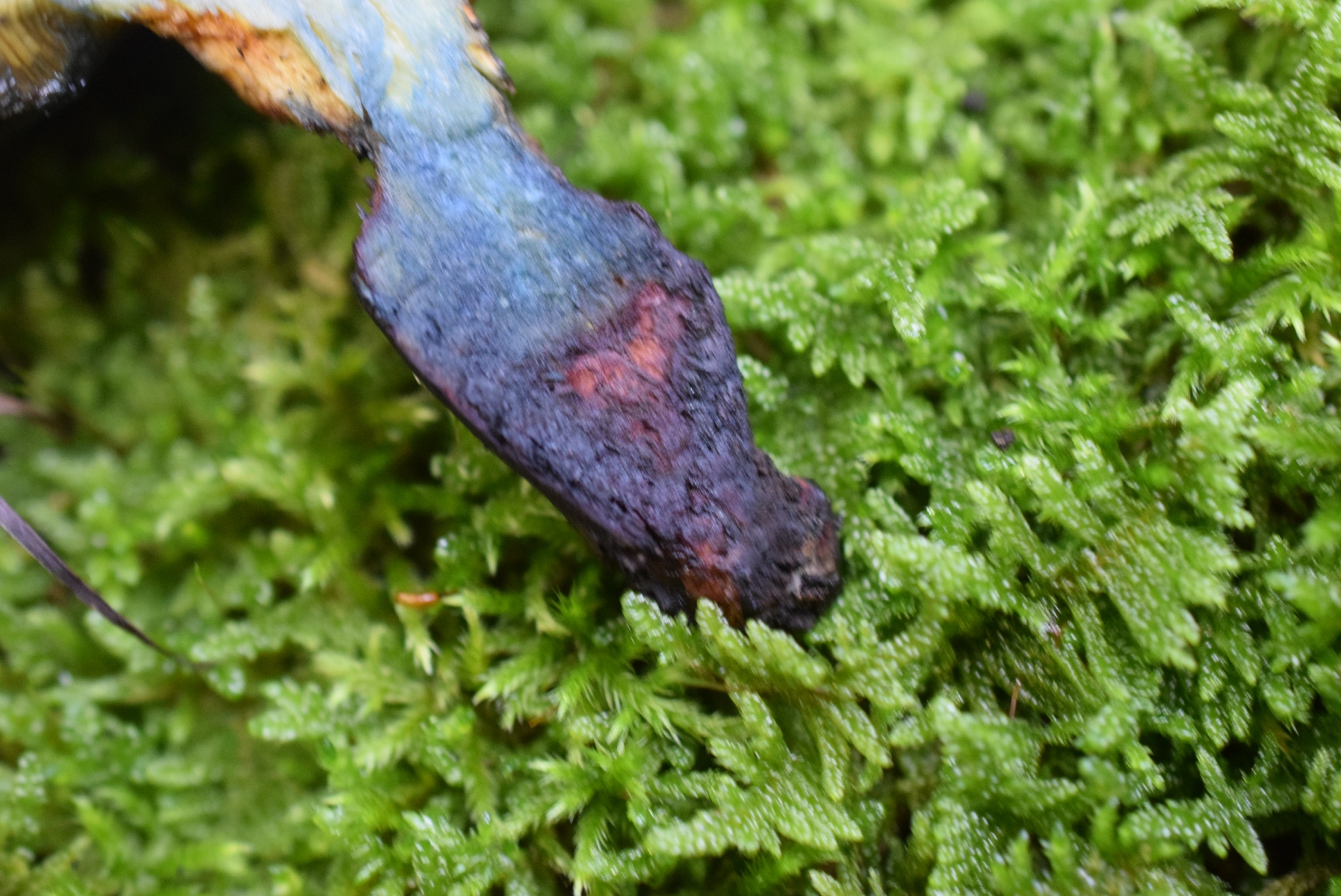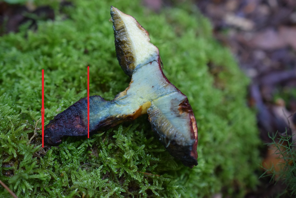 C. pulverulentus kann nicht in Stielbasisfleisch rötet , bei mein Fund ist Stielbasis stark weinrot , zu erst gleich bei schnitt sehr Intensiv dann ist mit blaue Verfärbung bedeckt aber noch immer ist zu sehen
