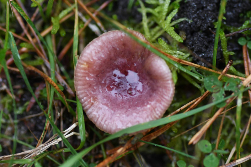 Hut: in der MItte dunkel violettrot, außen heller und stark gerieft