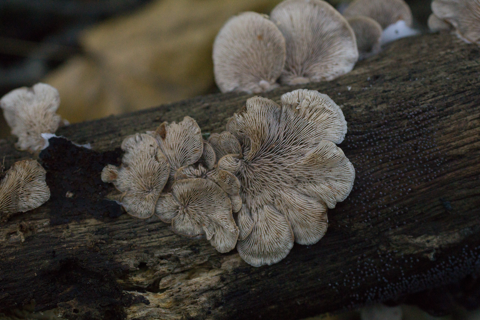 Lentinellus ursinus müsste einen ganz dunklen Hutfilz haben (dunkelbraun, schwarzbraun bis schwarz) und muschelförmige Fruchtkörper (Hut +/- gleich lang wie breit), sollte bevorzugt an Nadelholz vorkommen und idealerweise irrwitzig scharf schmecken.