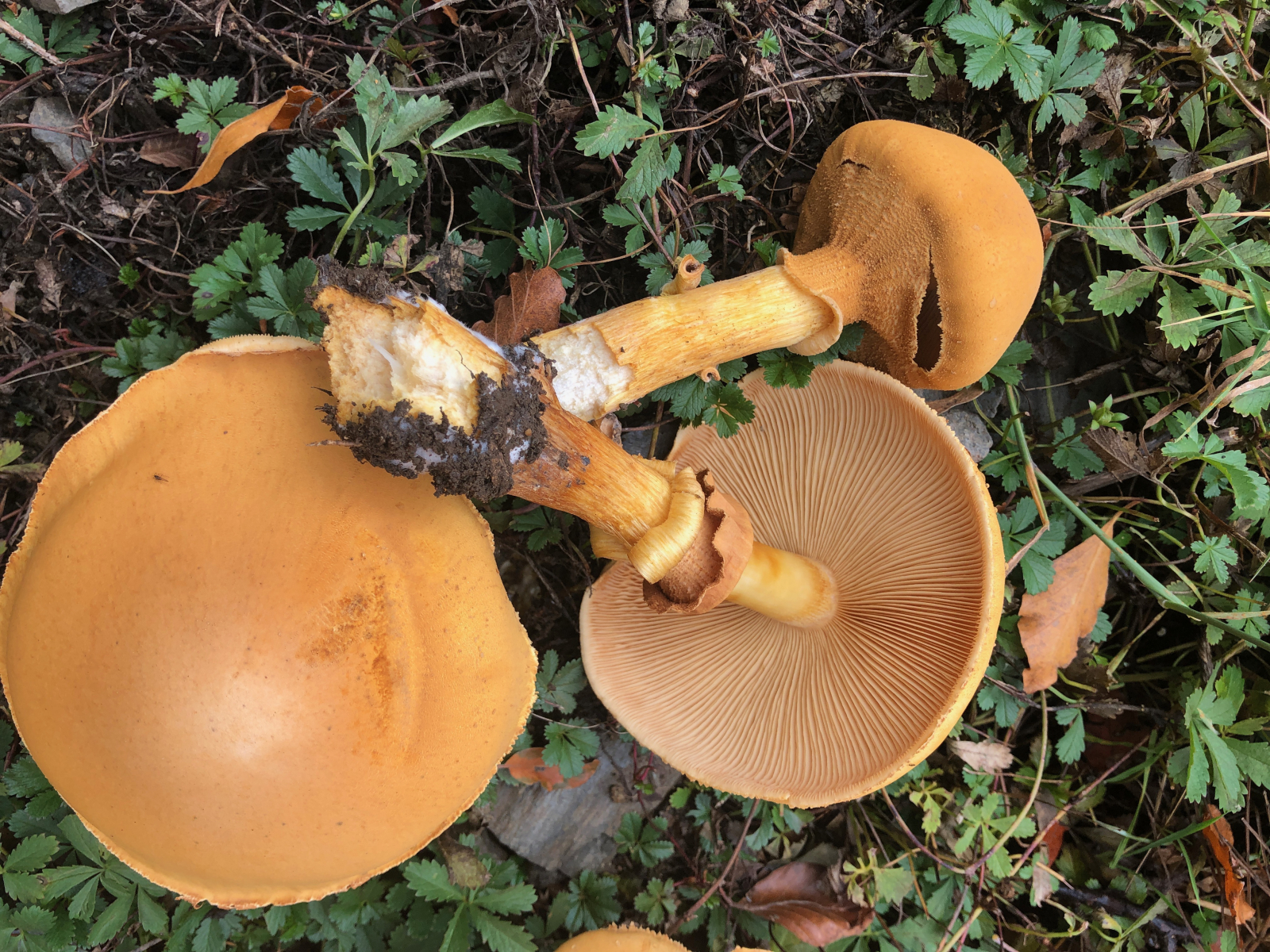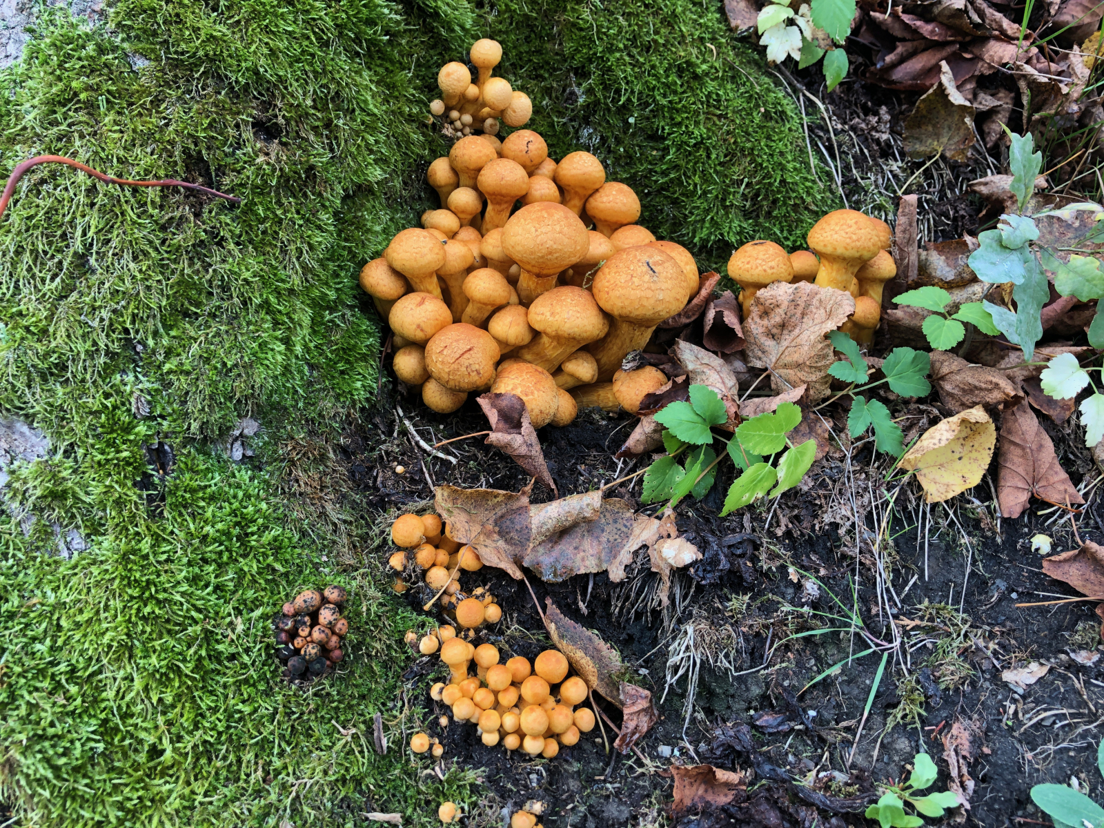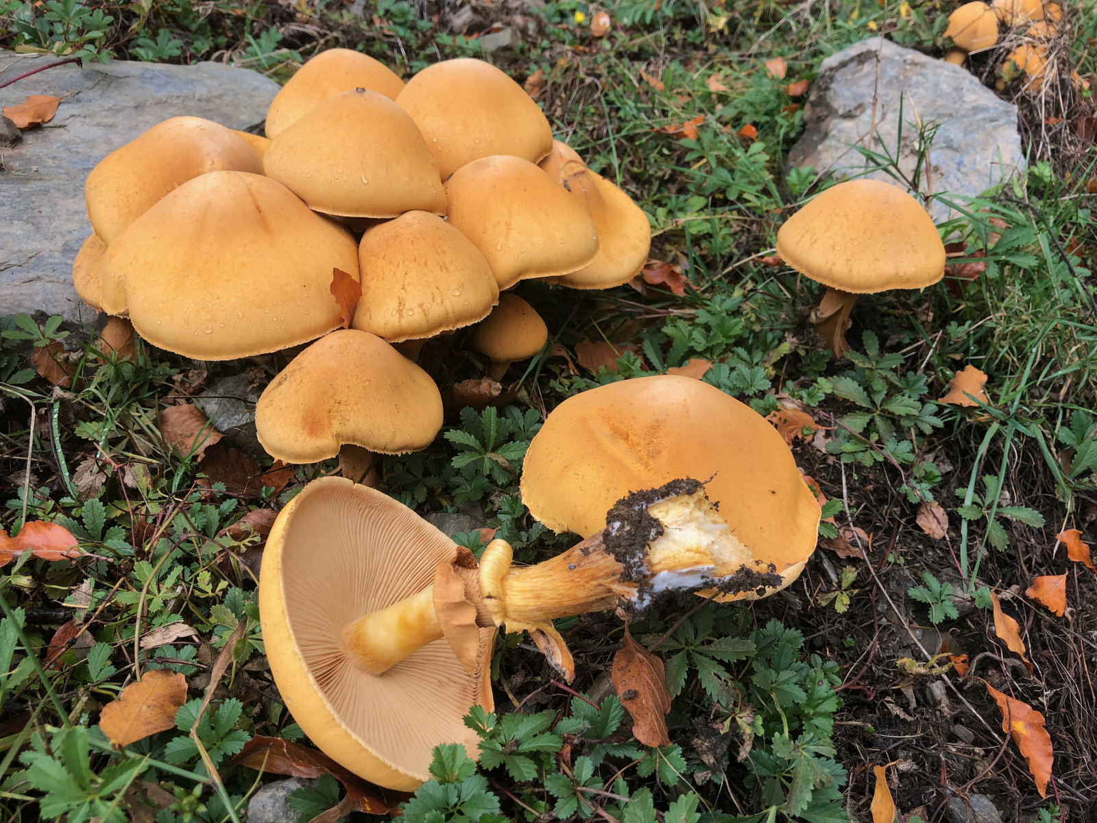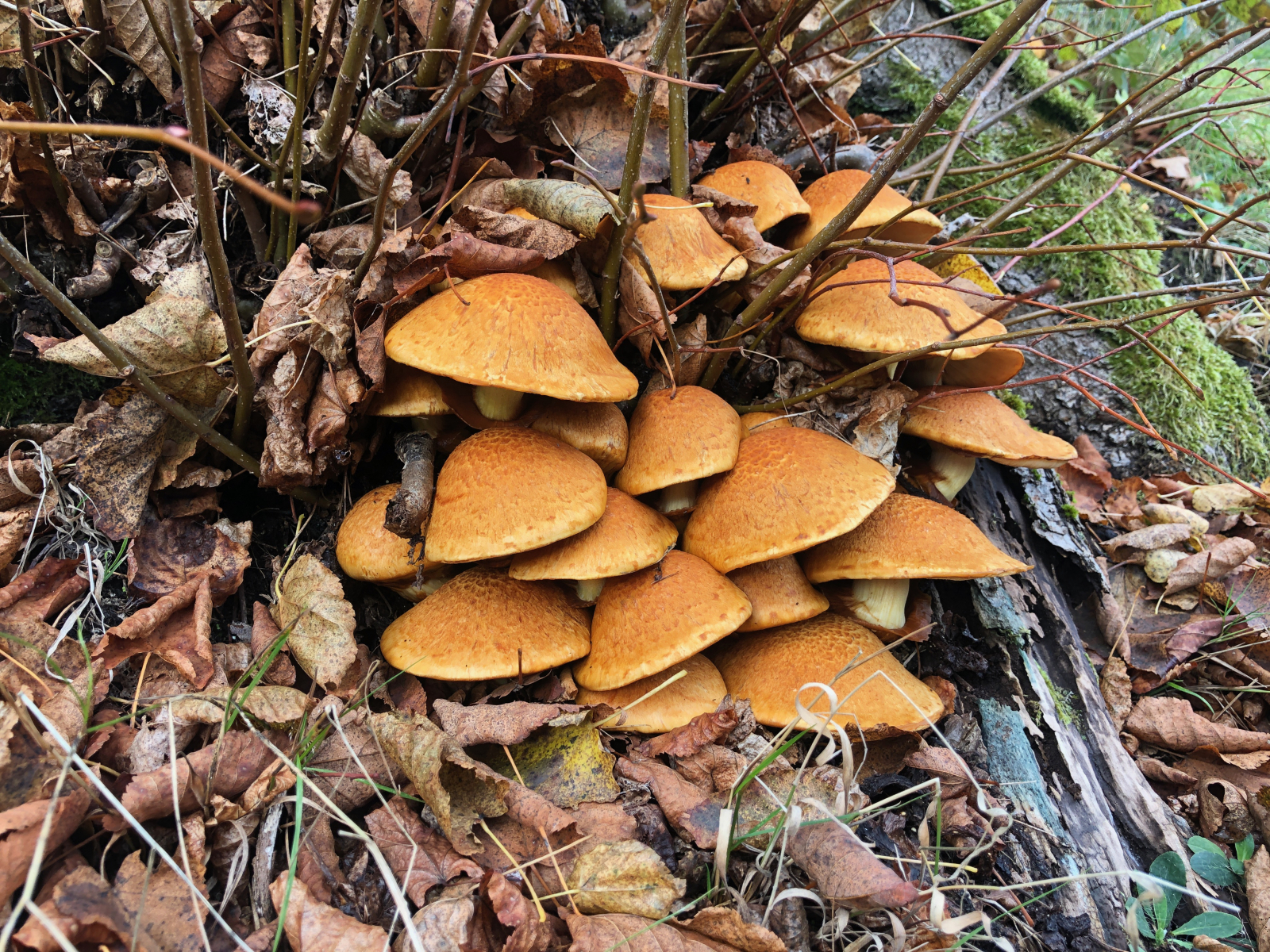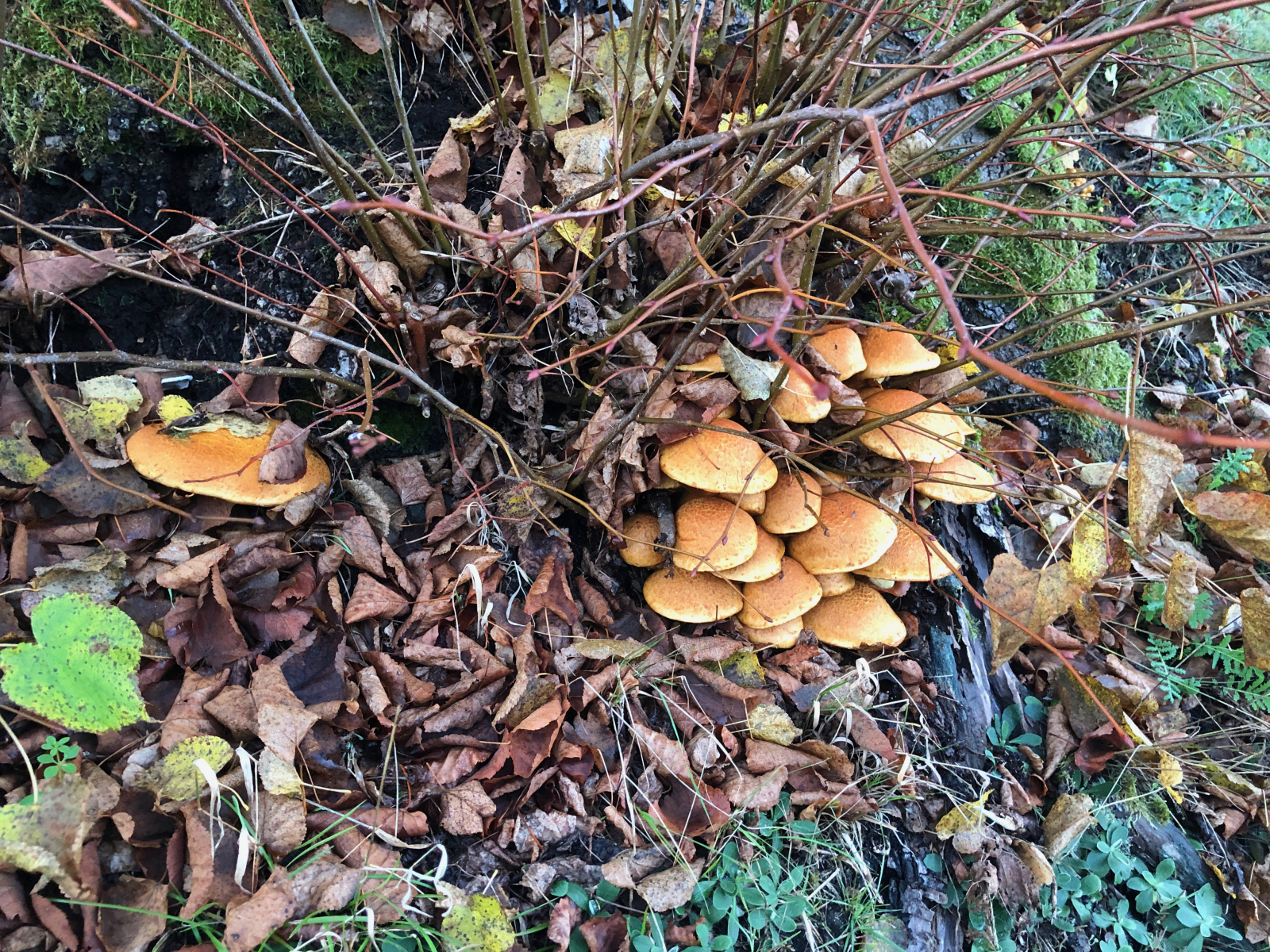 Und die Flämmlinge wuchsen weiter auf mehr als 20 cm Hutdurchmesser. Neben ihnen entstanden Büschel von Sparrigen Schüpplingen.