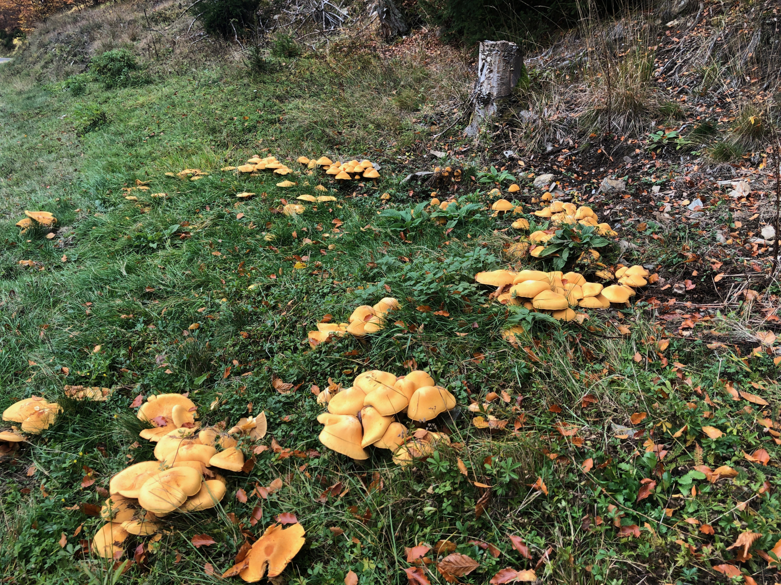 Dieser Baumstumpf beherbergt auch regelmäßig Stockschwämmchen. Im vergangenen Jahr hatte jemand ein Büschel der Flämmlinge geerntet. Vielleicht hatte ihn ja die Frau geschickt und er fand keine Stockis. Wer weiß. Verwechseln kann man diesen stattlichen Pilz jedenfalls nur mit geschlossenen Augen vom Stockschwämmchen. Ich wüsste ganz gern, wie schlimm die Folgen dieser Verwechslung waren. Kopf-Bauch-Magen-Darm und mehr? Hab es nie erfahren.