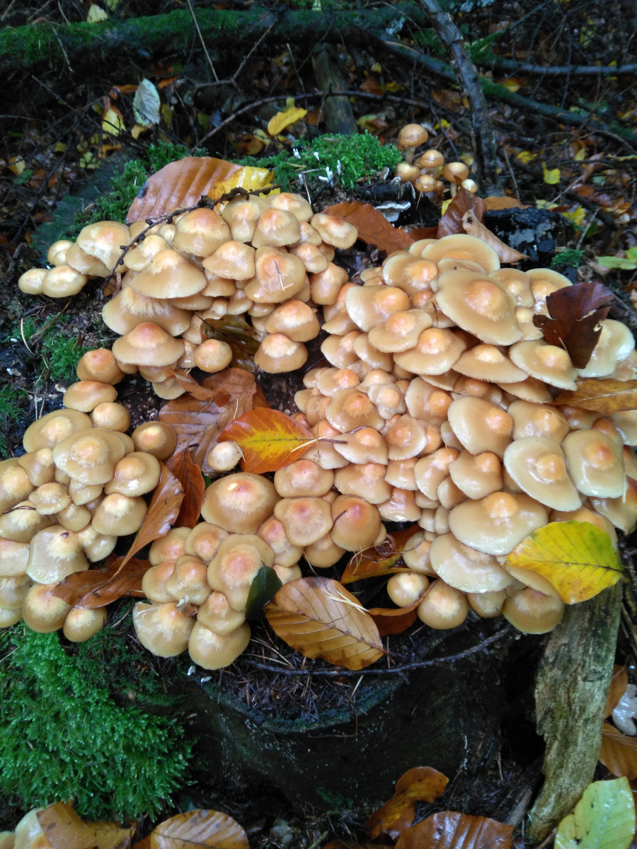 nach längerer Abstinenz hier im Forum mal wieder eine Anfrage von mir. Vor einigen Tagen waren wir unterwegs auf "Glucken-Jagd" und kamen dabei durch ein Stück Mischwald. Wie wohl überall zu der Zeit leuchtete es von nahezu jedem Baumstubben neon-gelb, der Grünblättrige Schwefelkopf dominiert das Pilz-Geschehen, zumindest in den Wäldern, in denen ich umherstreife. Nachdem ich im letzten Jahr vergeblich nach dem Stockschwämmchen gesucht habe, stieß ich unverhofft auf einen Stubben, der mal eine etwas andere Farbgebung aufwies. Bei näherer Betrachtung fand ich Pilze vor, die in ihren Merkmalen eigentlich zu 100% auf das Stockschwämmchen passen.