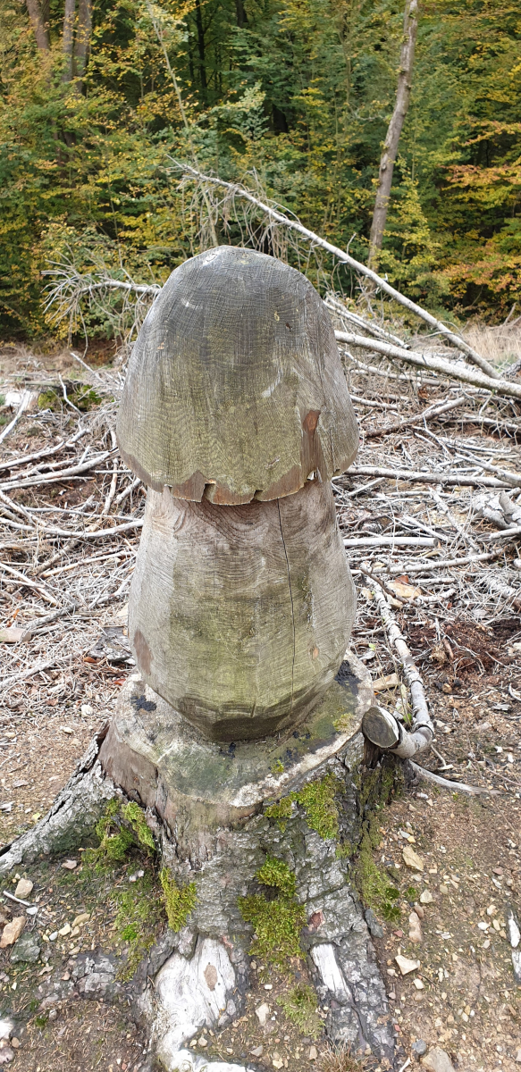- Beschreibung Stiel: ca. 60 cm lang, 40 cm Durchmesser, ohne Ring, zur Basis verjüngt- Begleitbäume, Substrat: abgestorbene Fichten