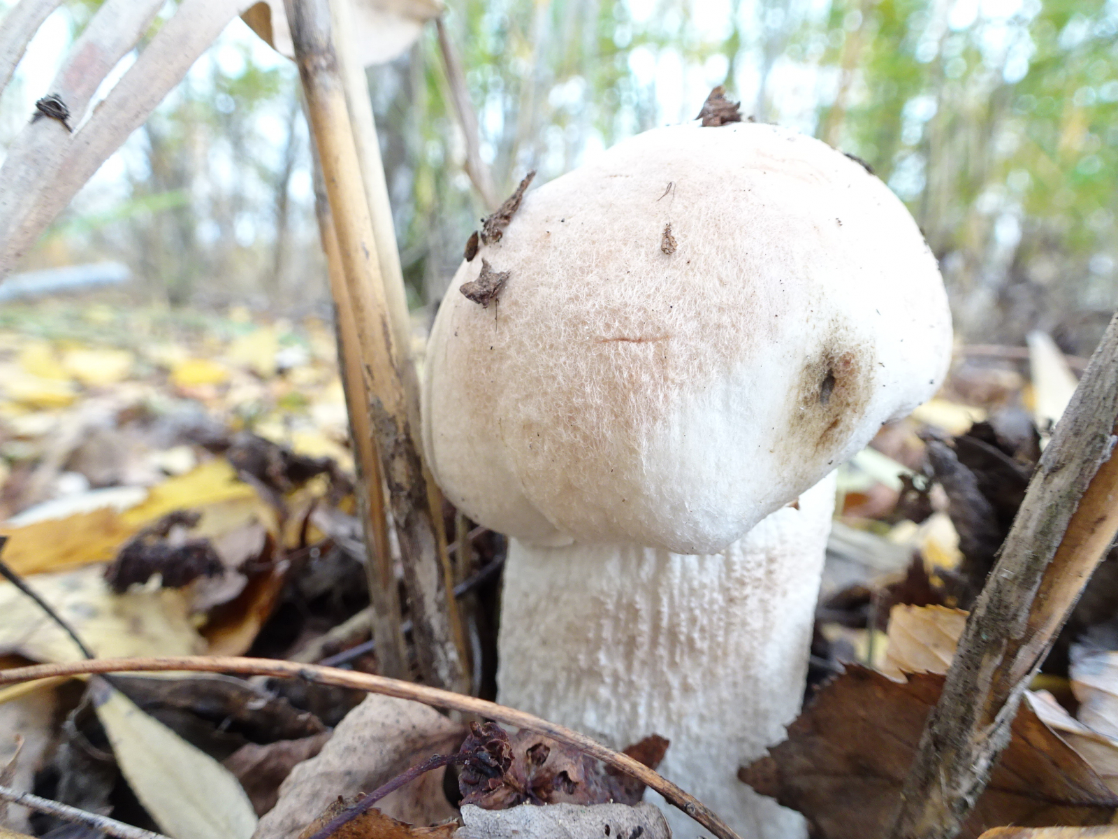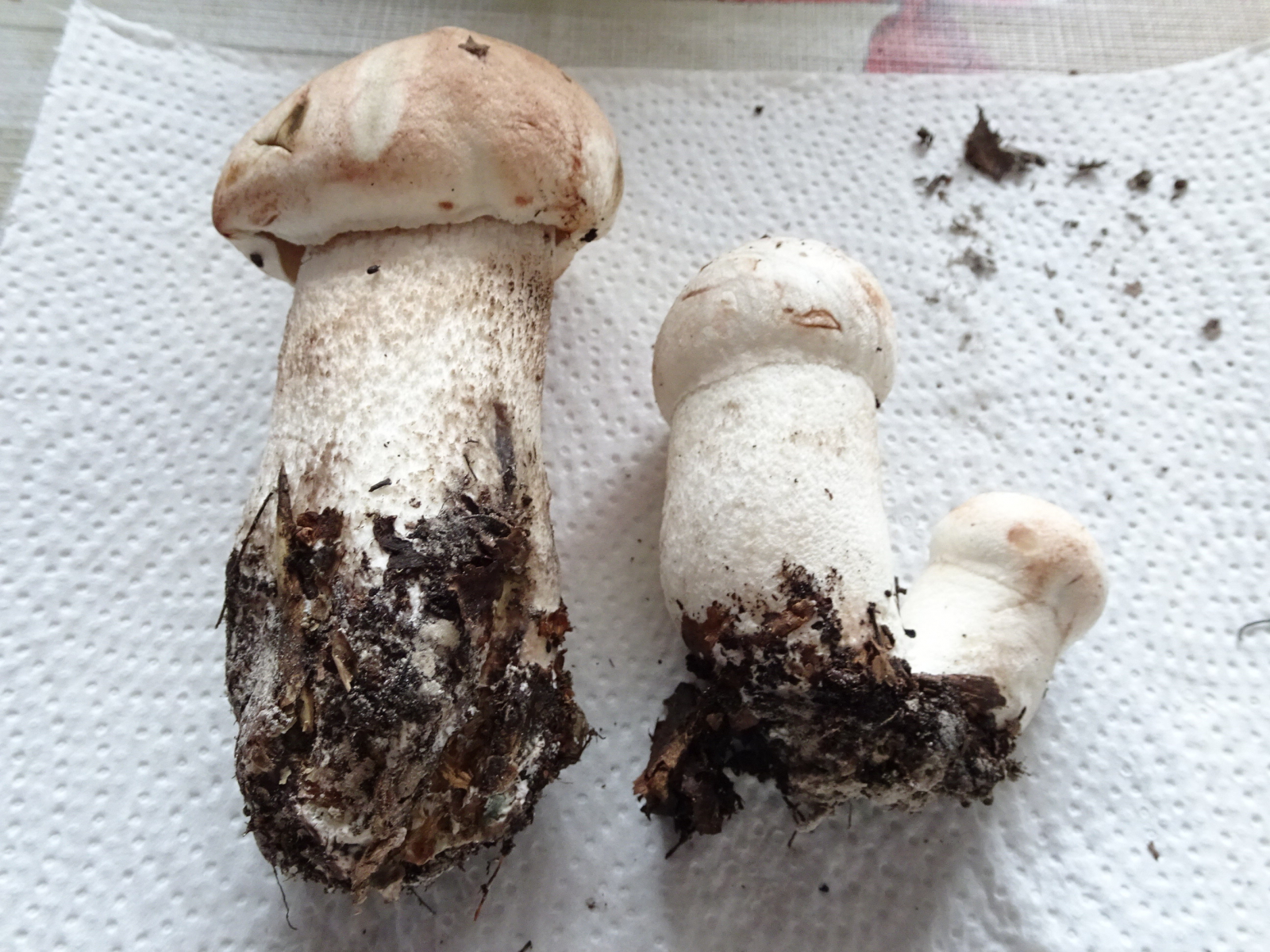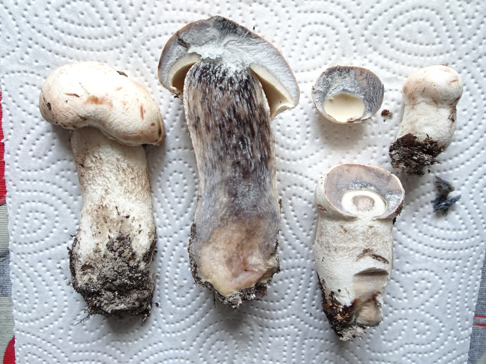 Wirklich wunderschöne Fotos - bei Leccinum percandidum ist die Huthaut sehr empfindlich und schwärzt bald, wie man hier gut sehen kann, wenn man sie berührt (vorher schmutzig rotbraun, dann schwarz). Bei den ausgewachsenen Fruchtkörpern ist die Huthaut ziemlich glatt und recht einheitlich weiß, ohne rote Flecken... Passt alles sehr gut. Auch der kräftige Habitus (wobei das ja klar ist, ist ja eine Rotkappe).