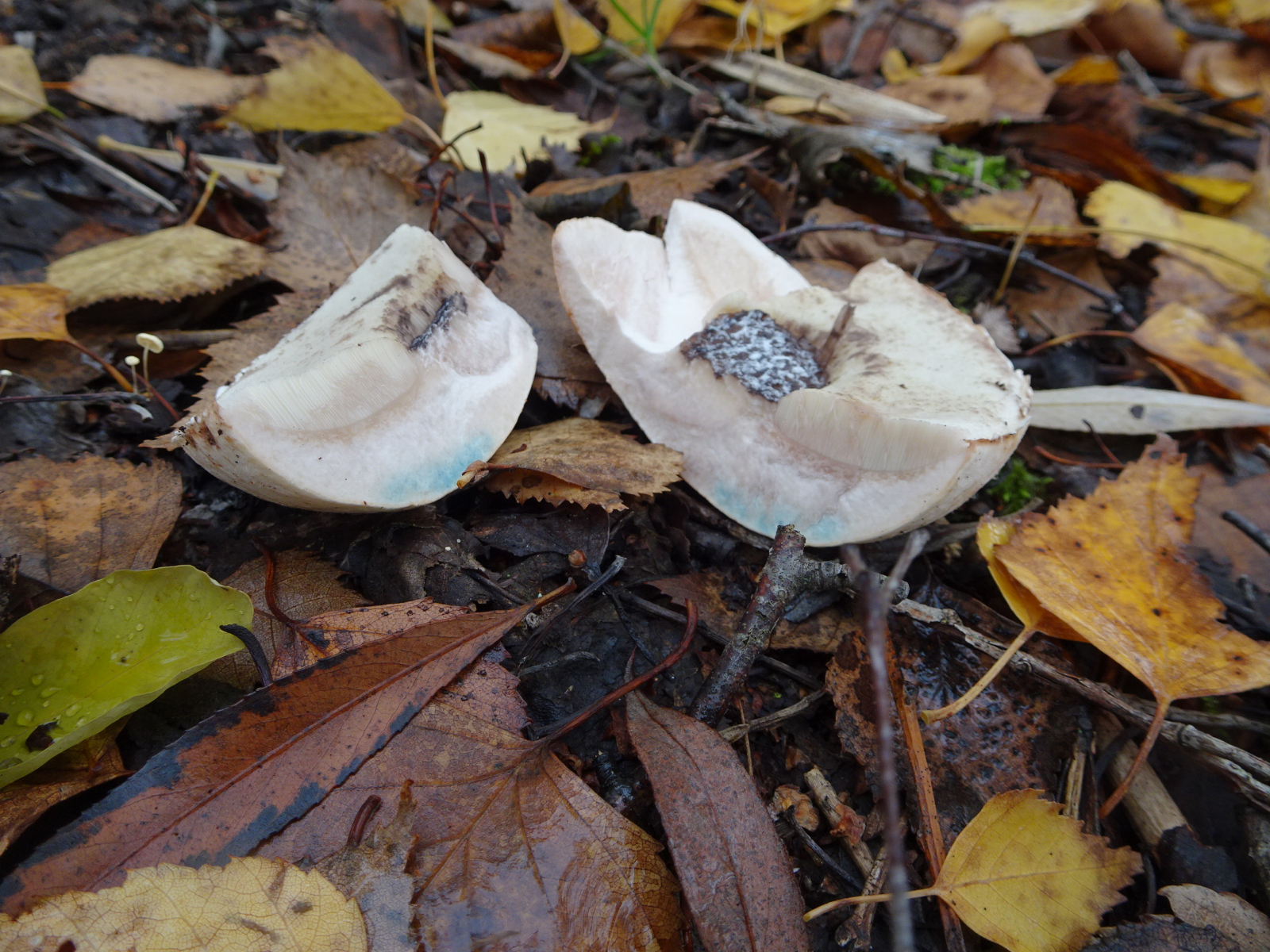 Ich machte noch Schnittbilder, der Sammler war noch in der Nähe und es goss wie aus Eimern, konnte keine weiteren Fotos machen. Den Röhrling hab ich zerschnitten und in der Umgebung verteilt. Beim Anschnitt wurde der Röhrling am Hutrand blau, der restliche Teil eher leicht rötlich. Außen am Stiel waren ebenso blau-grüne Verfärbungen.