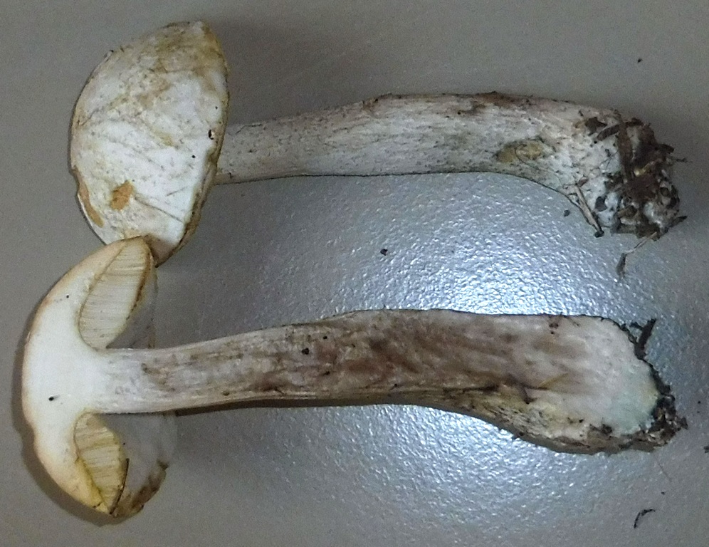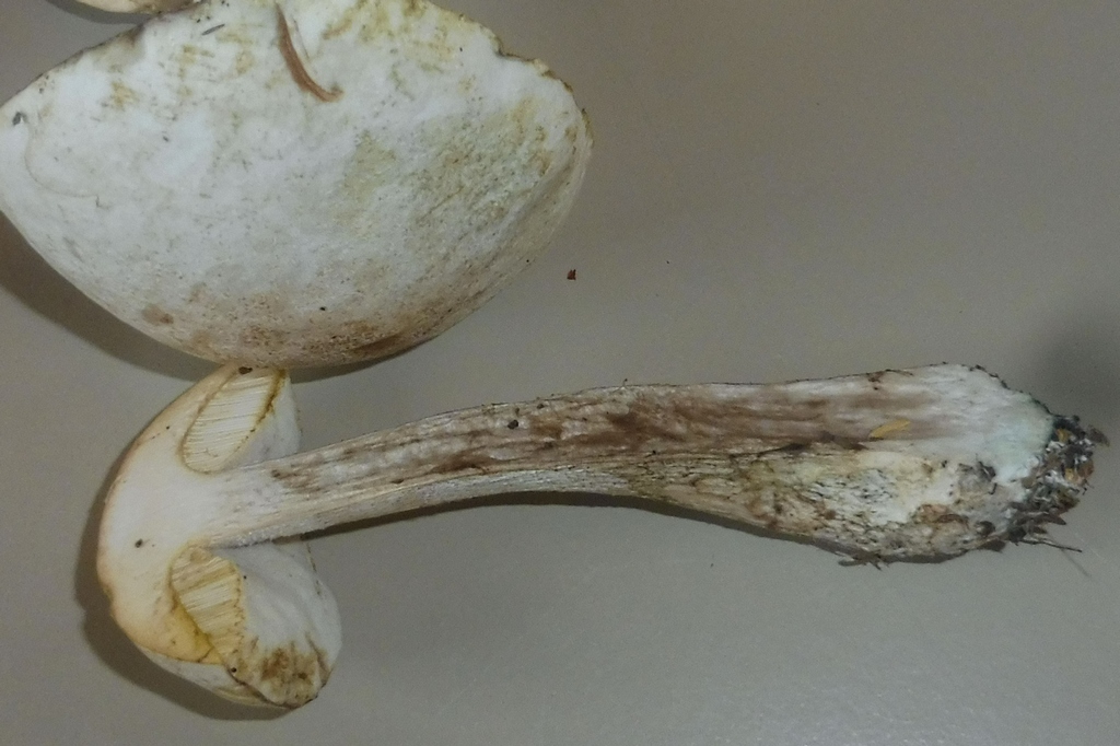 das Fleisch hatte beim Liegen klar geschwärzt. Ich hatte den aber nur als L. "cf." percandidum bestimmt (wollte ihn noch mikroskopieren als Winterbeschäftigung, wozu ich noch nicht kam). Aufgrund des Habitus kann das auch das sein, was in Nordamerika als Leccinum holopus var. americanum läuft - ein weißes Leccinum aus sect. Scabra, das stark rötet und dann im Fleisch schwärzt.