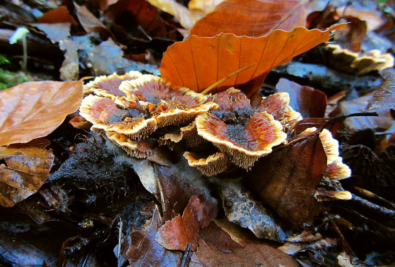 O.K., die weiß ich jetzt wieder. Nur der Vollständigkeit halber, es wuchsen zwischen den Orangebraunen Korkstachelingen auch noch Weiße Stoppelpilze (Hydnum albidum)