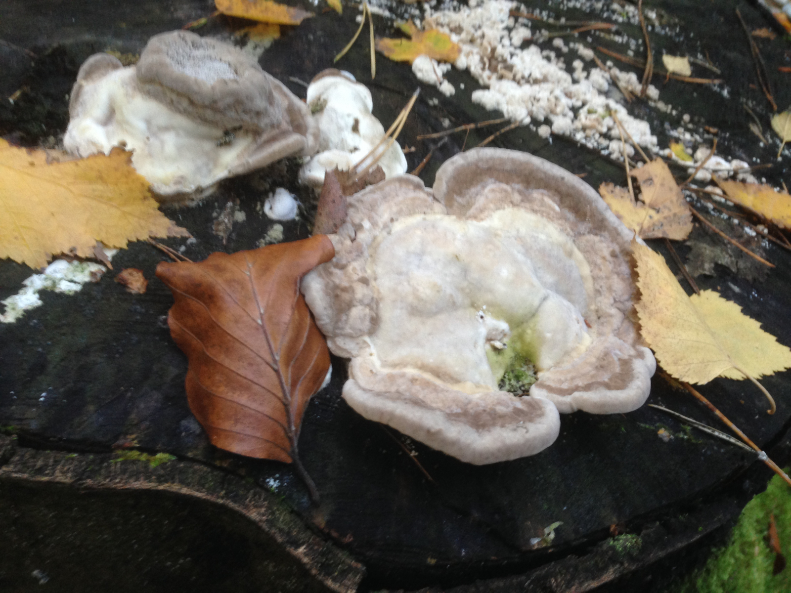 #2 Dieser hier ist wohl sehr jung, aber kein Birkenporling weil er direkt auf der Wurzelstockplatte wächst. Ist es ein Ganoderma? Ich habe ihn stehengelassen.