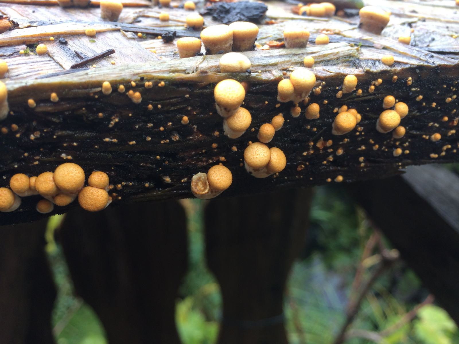 aktuell sprießt bei mir auf einer OSB-Platte, also verm. Nadelholz, dieses kleine gelbe Pilzchen, dem ich gern einen Namen geben würde. Leider weiß ich nicht mal, wo ich anfangen soll zu suchen.