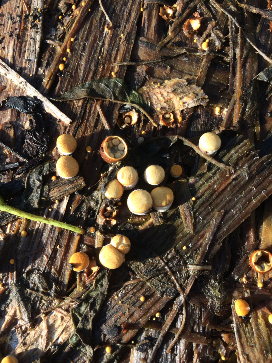 Anfangs gelbe Kugeln von 1-2 mm auf einem weißen Sockel, später etwas becherartig gestreckt und oben abgeflacht. Dort Plätzen sie dann auf und geben die Sporenlager frei. Wer kennt die?