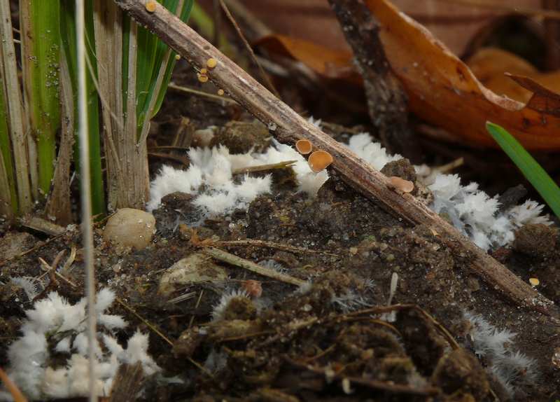Anbei ein hübsches Ensemble, das ich heute an der Ostseeküste an einem Gehölzrandstreifen 100 m von der Ostsee entfernt gefunden habe. Die Pilzkörper waren kaum 1 cm hoch bzw breit, fast hätte ich sie übersehen.