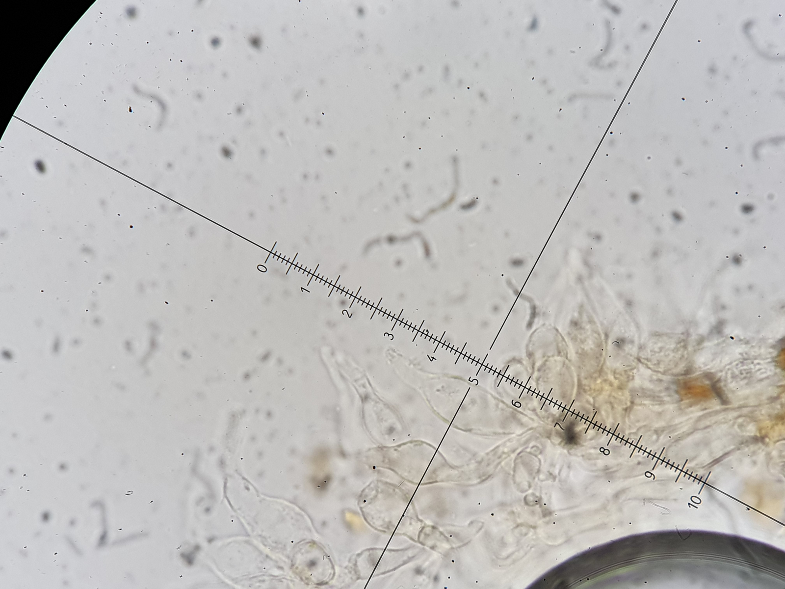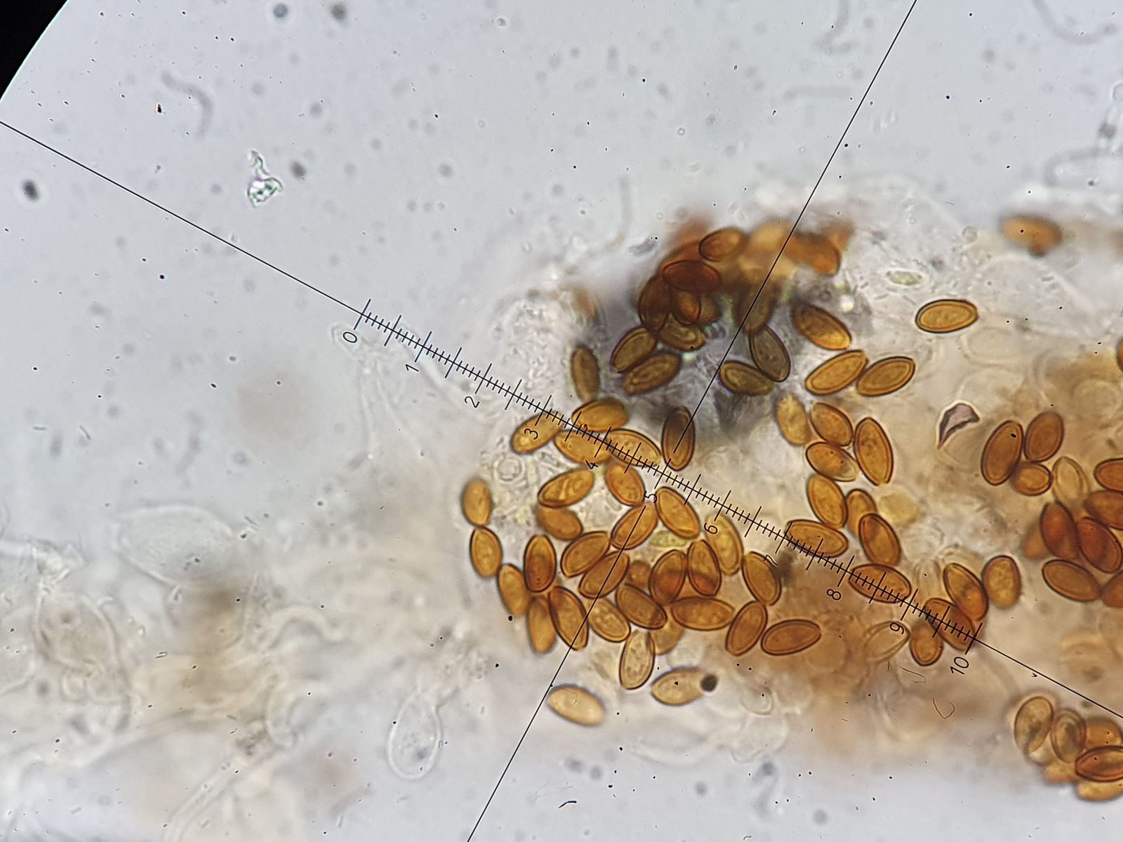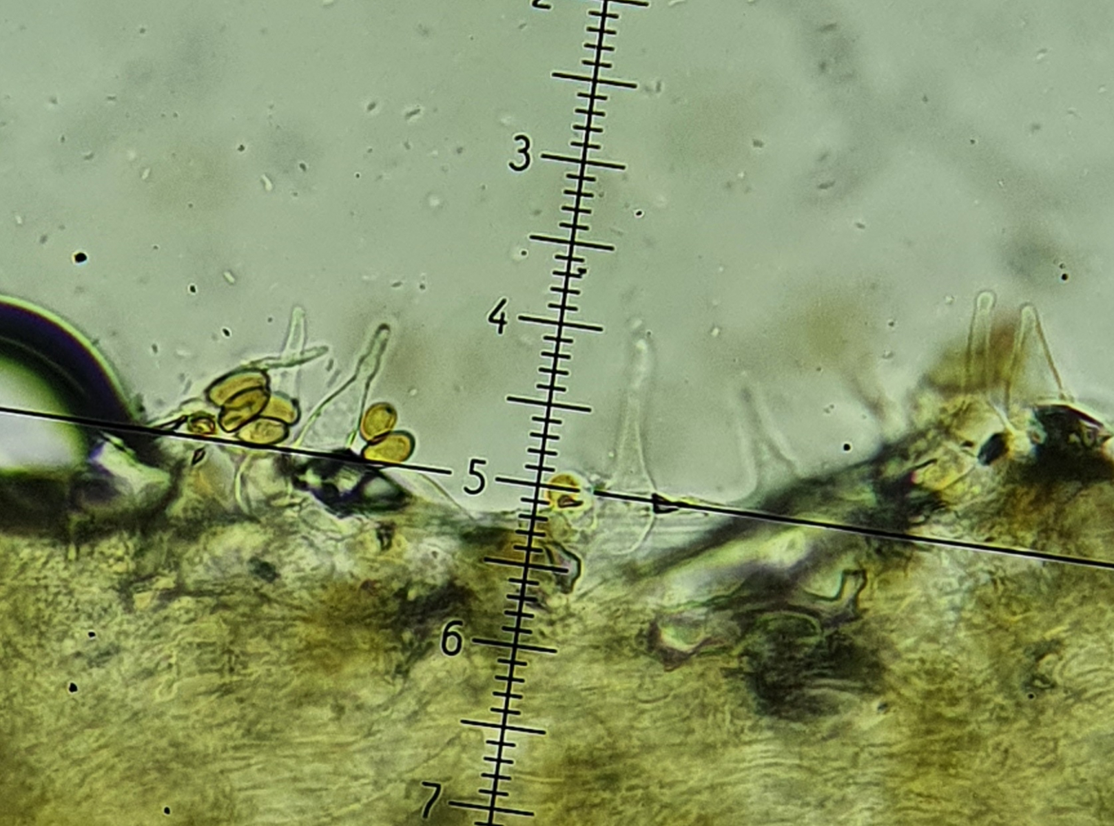 In den Mikromerkmalen findet man dann schon Unterschiede in Zystidenform und Sporengrösse: hier glatte Sporen von 9x5ym mit deutlichem Keimporus welche in KOH ockerbraun umfärben. Die schlankhalsigen lageni- bis subfusiformen Cheilos mit apikal abgerundeten Enden von ca. 50ym Länge.