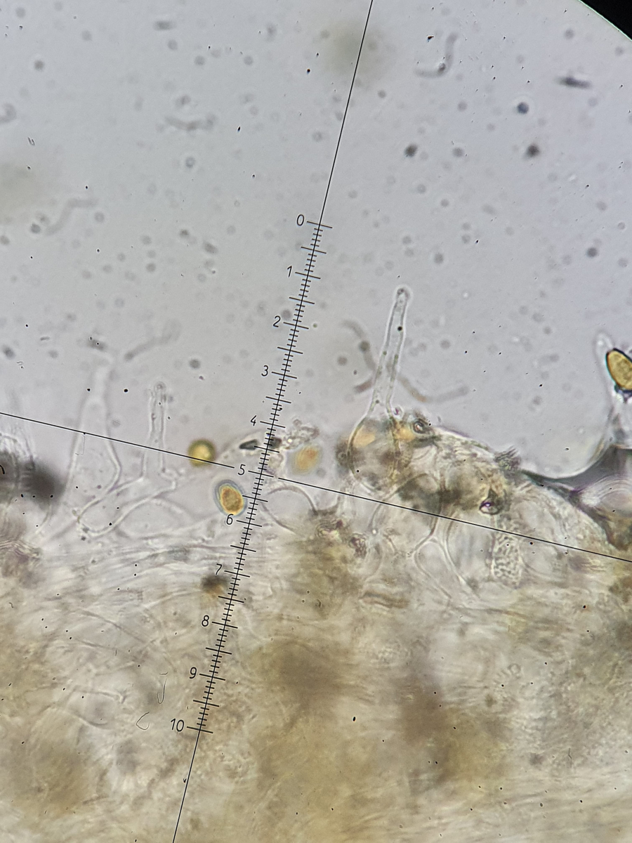In den Mikromerkmalen findet man dann schon Unterschiede in Zystidenform und Sporengrösse: hier glatte Sporen von 9x5ym mit deutlichem Keimporus welche in KOH ockerbraun umfärben. Die schlankhalsigen lageni- bis subfusiformen Cheilos mit apikal abgerundeten Enden von ca. 50ym Länge.