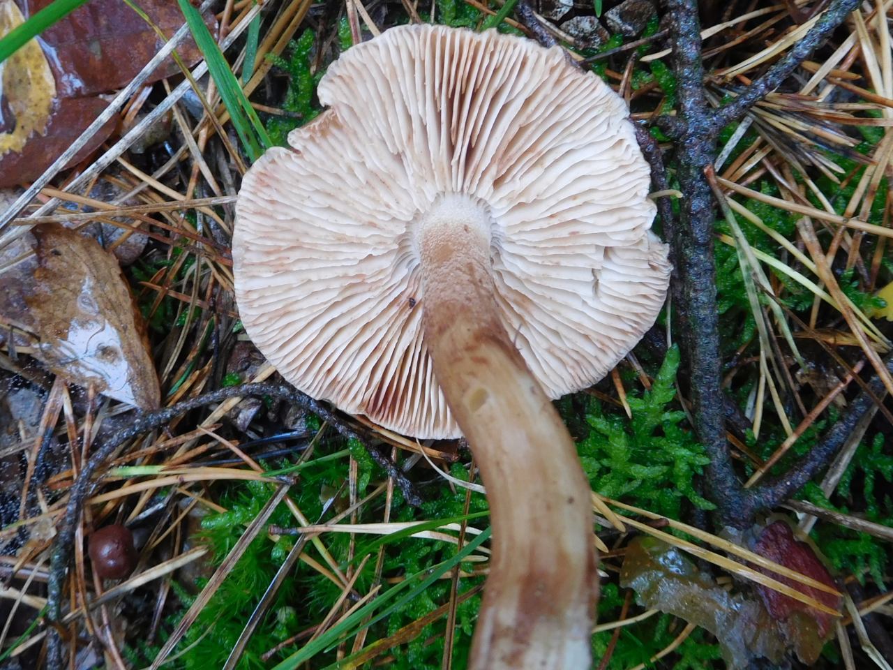 OK. Und die anderen in Frage kommenden Arten aus dem Aggregat um Tricholoma albobrunneum (sensu FNE4) würden arg mehlartig riechen. Oder anders aussehen. Insofern: Würde ich den Fund mal als tricholoma imbricatum / Feinschuppiger Ritterling stehen lassen.