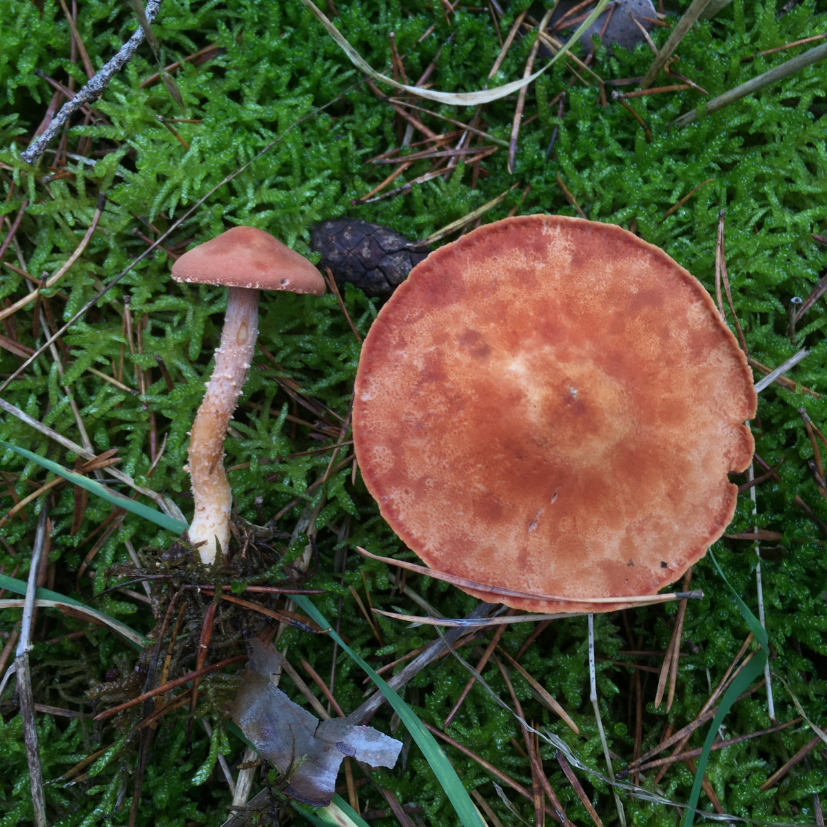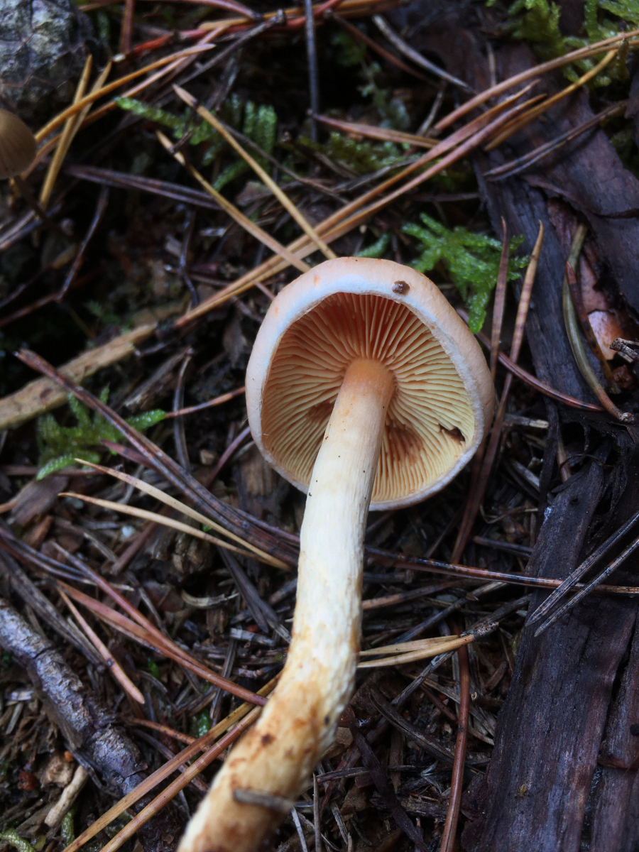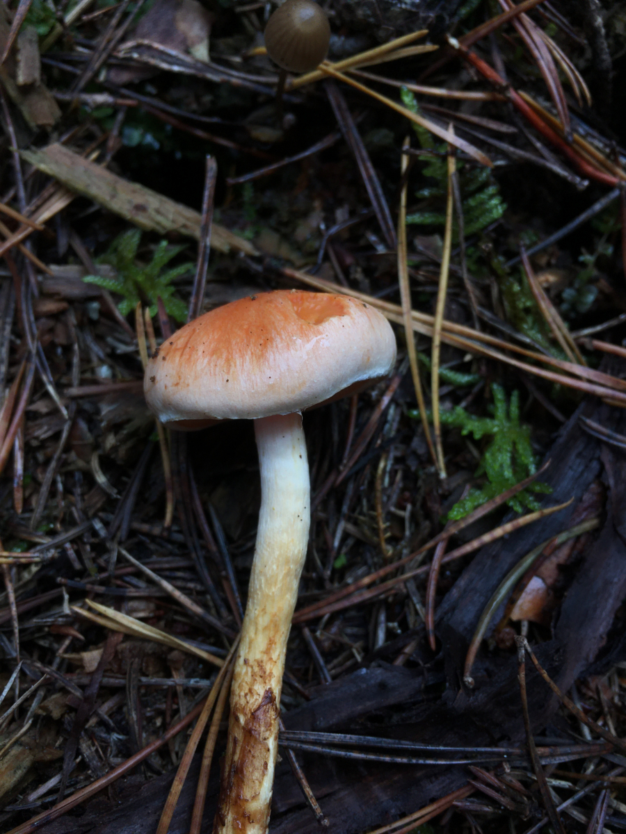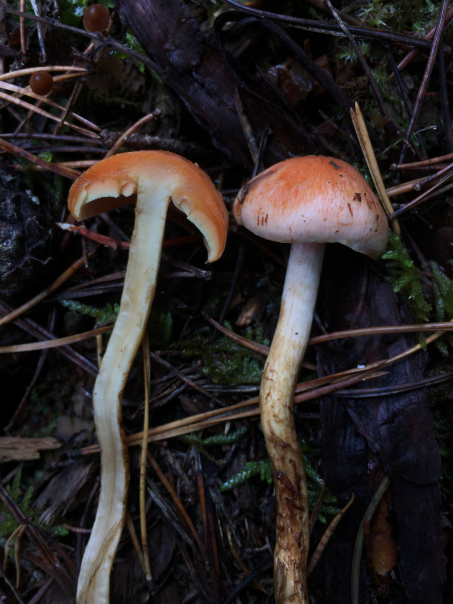 3) Ein einzelner Fruchtkörper auf einem verwitterten Nadelholzstubben. Von weitem ein ziegelroter Schwefelk... -nachdem ich den sonst nur in der Mannschaft kenne war ich mistrauisch. Die Farbe war nicht so richtig ziegelrot eher aprikosenrot. Von unten hätte ich bei der Größe noch etwas Cortina erwartet.. hm möglicherweise ja ein Safranschüppling, Pholiotina astragalina? Oder doch ein Lonsesome George..
