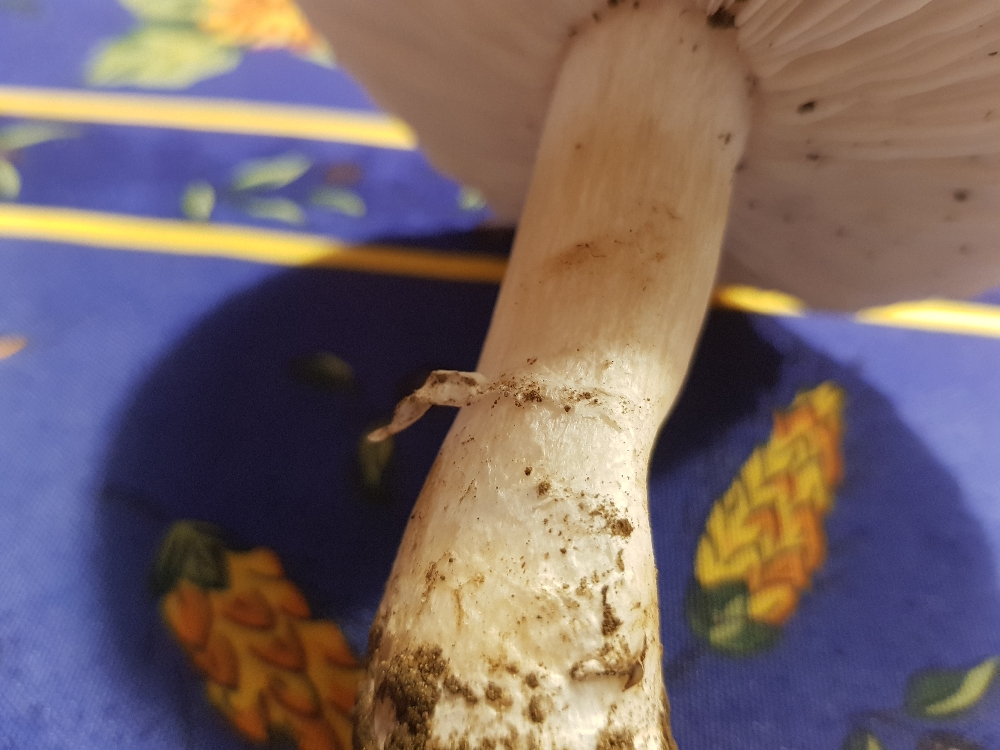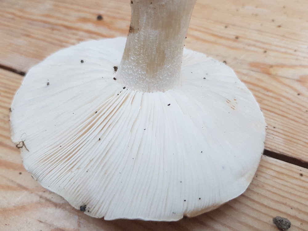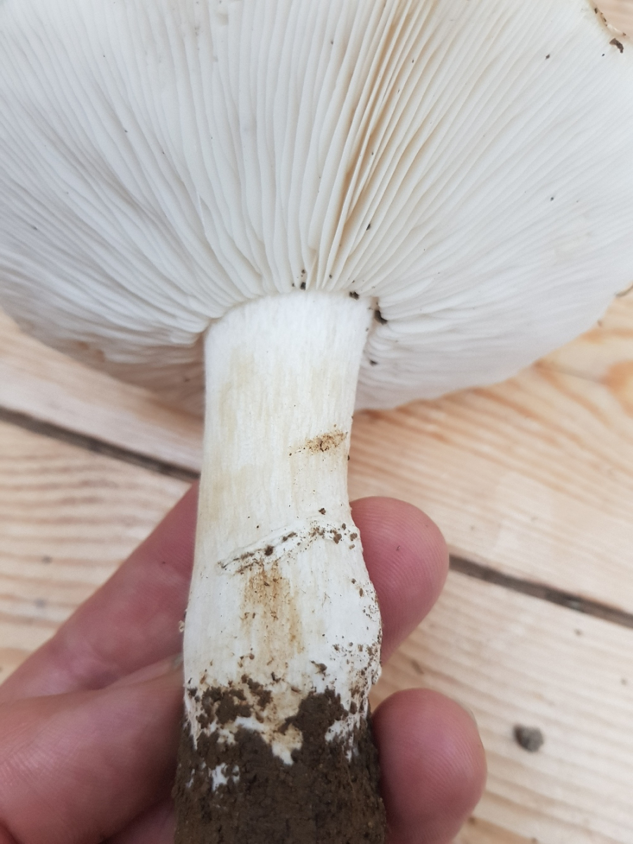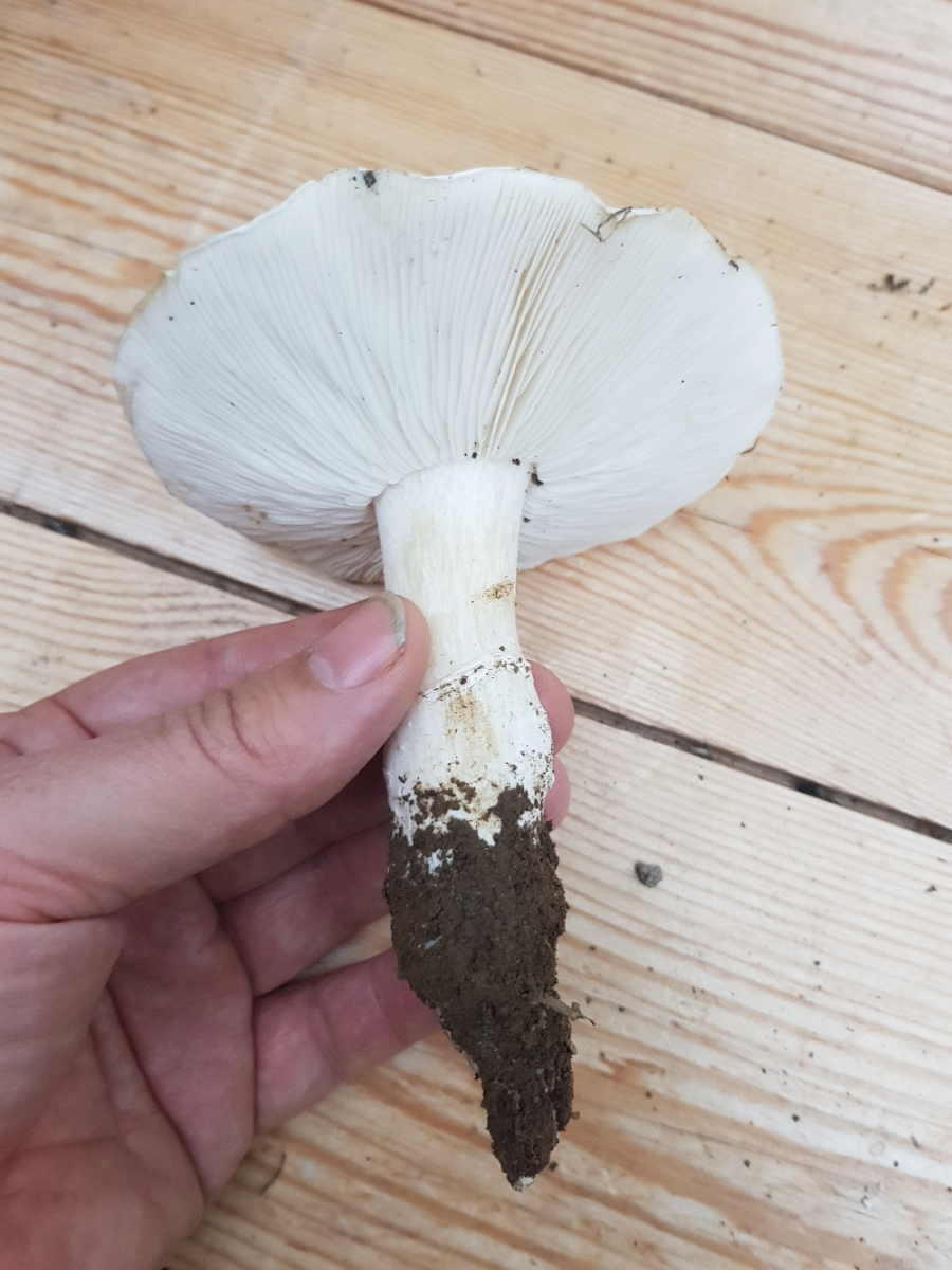 Ich war ehrlich gesagt zunächst völlig ratlos. Ein Weißsporer - klar. Ritterling passt nicht. Egerlingsschirmlinge sollten einen Ring haben. Für einen Weichritterling passt der Hut nicht so wirklich. Die Hutoberfläche erinnern mit an weiße Trichterlinge. Aber in der Größe und wurzelnd?! Ich kam nicht mal auf die Gattung. Wenn man so gar keine Idee hat, ist oft ein stupides Blättern oder ein synoptischer Schlüssel der letzte Rettungsanker. Letzterer hat dann das Rätsel (hoffentlich) gelöst): Der Wurzelnde Schönkopf (Tricholomella constricta). Die Gattungsbezeichnung war mir völlig neu.