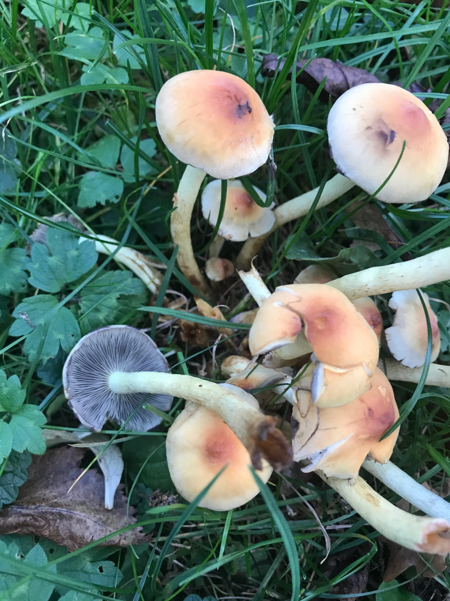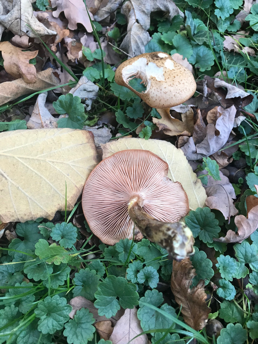 Hallo, ich versuche es mal bei diesen zwei. Der erste, mit dem rötlichem Hut könnte vielleicht ein Weeißblättriger Samtfußrübling sein? Wäre ja zu schön um wahr zu sein ... Beim zweiten würde ich Behangener Faserling sagen, aber der hat nicht diese braunen Tupfen oder Schuppen.