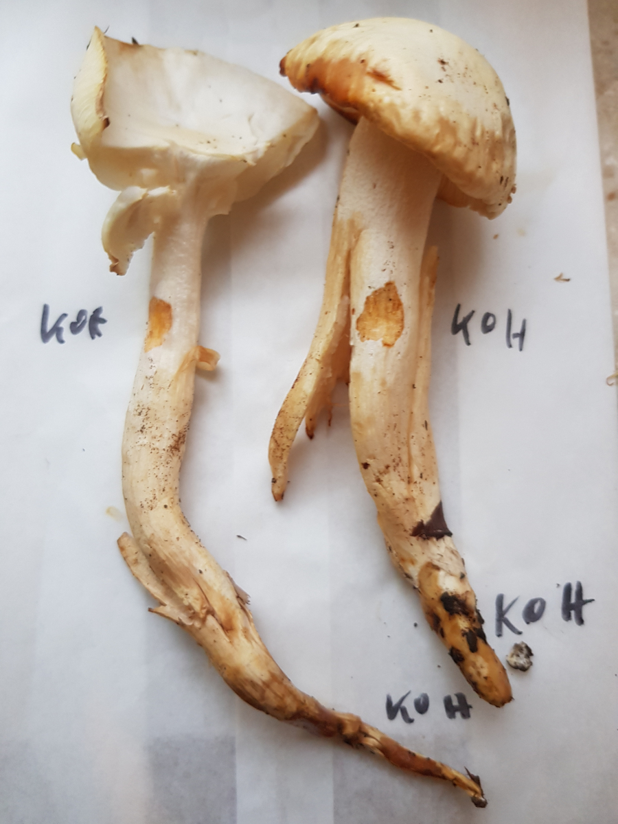 den KOH-Test bei weißen Schnecklingen führst du so durch: einen Tupfer auf die Huthaut (vorher die Schleimschicht etwas entfernen, falls sie zu dick ist, was bei feuchter Witterung sein kann), und einen Tupfer auf die Stielbasis, da hin wo sie sich schon zuspitzt.