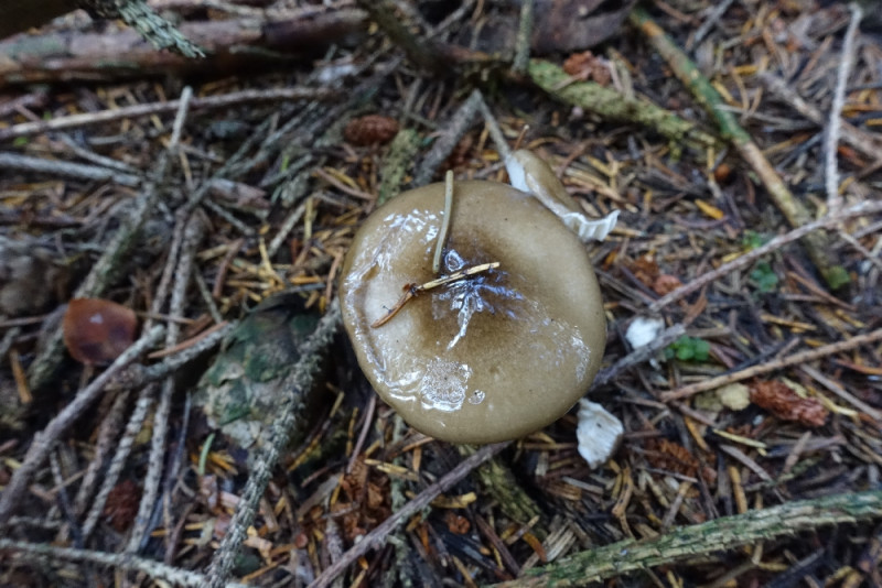Cortinarien gab es zu Hauf. Hier eine weitere Phlegmatie mit gräulich-braunem Hut mit sehr dezentem Grünstich (Hutrand) und kräftig eingewachsen radialfaserige Huthaut. Er wuchs in einer kleinen Gruppe in der Nadelsreu/Moos unter Fichten. Er stellte sich als der Reihige Klumpfuß (Cortinarius glaucopus) heraus.