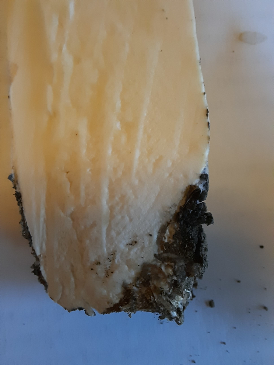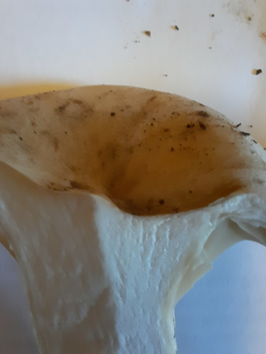 Die Farbe ist ein helles Beige, nicht weiß und der Geruch ist leich pilzig, jedenfalls nicht unangenehm.