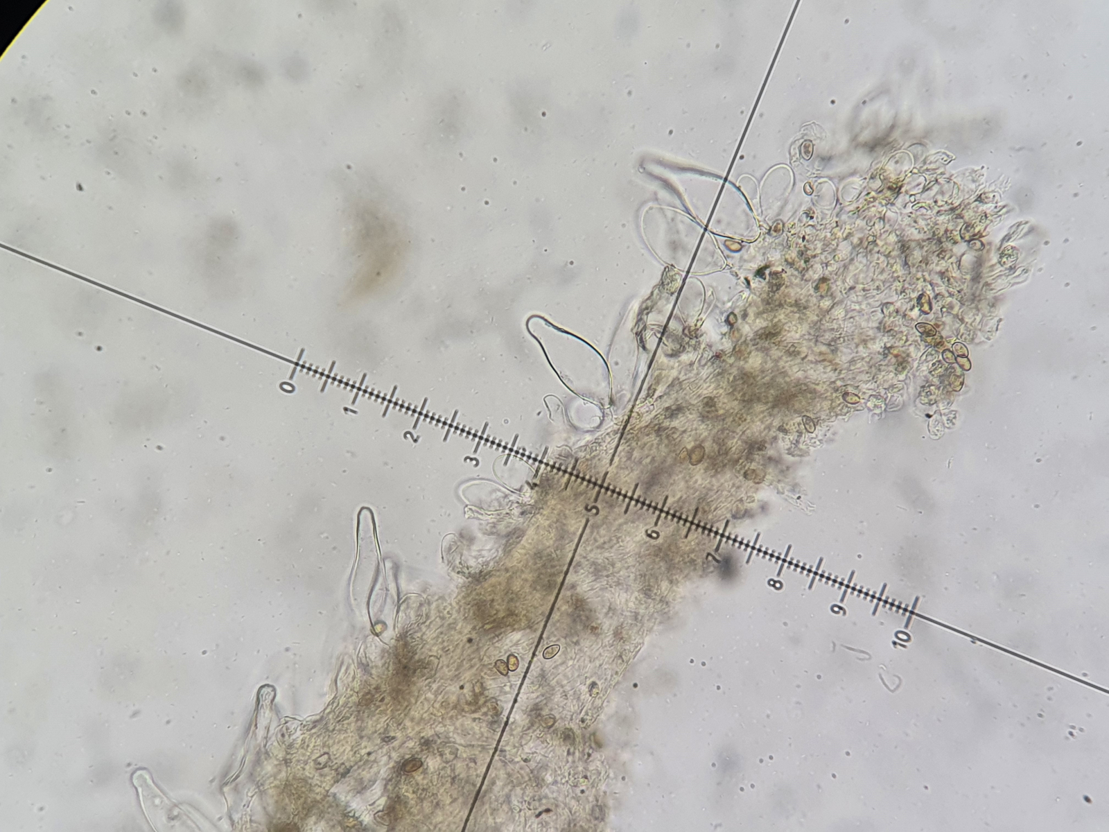 Die Sporen sind glatt. 8x4,5. Spannend sind Cheilo und Pleurozystiden. Beide zahlreich. Häufig nicht beschopft. Vereinzelt mit kristallschopf, selten sehr ausgeprägt. Viel häufiger glatt. Cheilos sehr variabel in Länge und Breite. Am Fuss Schnallen.